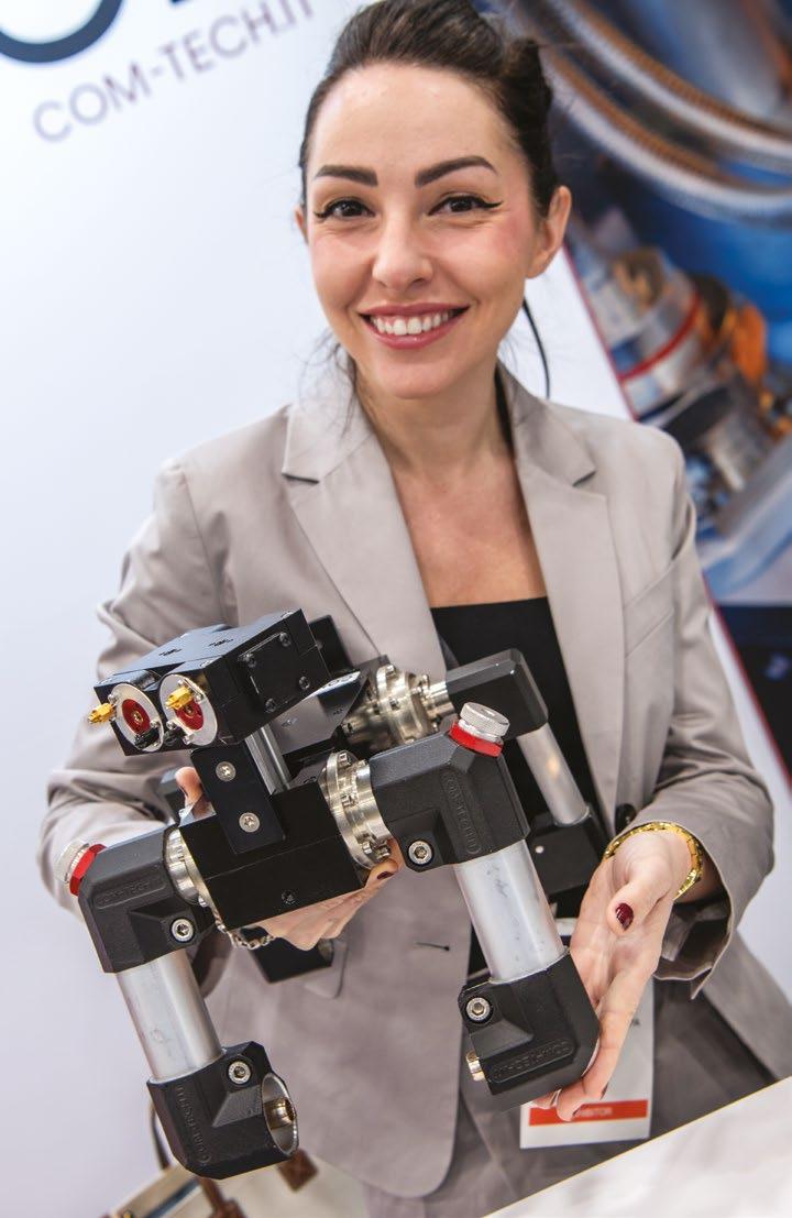 Sara Zanotta of Comtech Italia holds a “puppy” composed of some of the company’s components. Not of practical use, but cute!