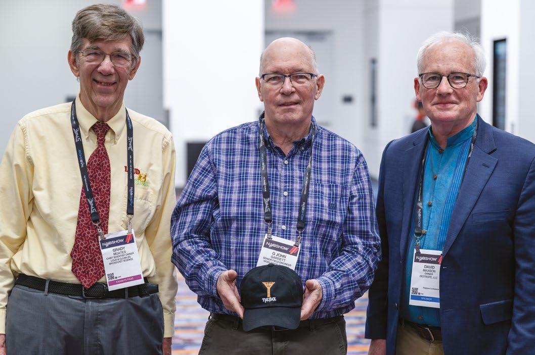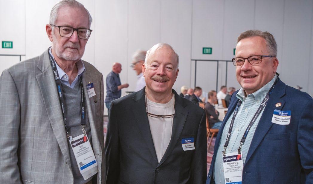 David Maxson, right, talked about the design and performance of the High-Efficiency Broadband Antenna, or HEBA, for AM radio. He’s with Grady Moates, left, and John Garrett.