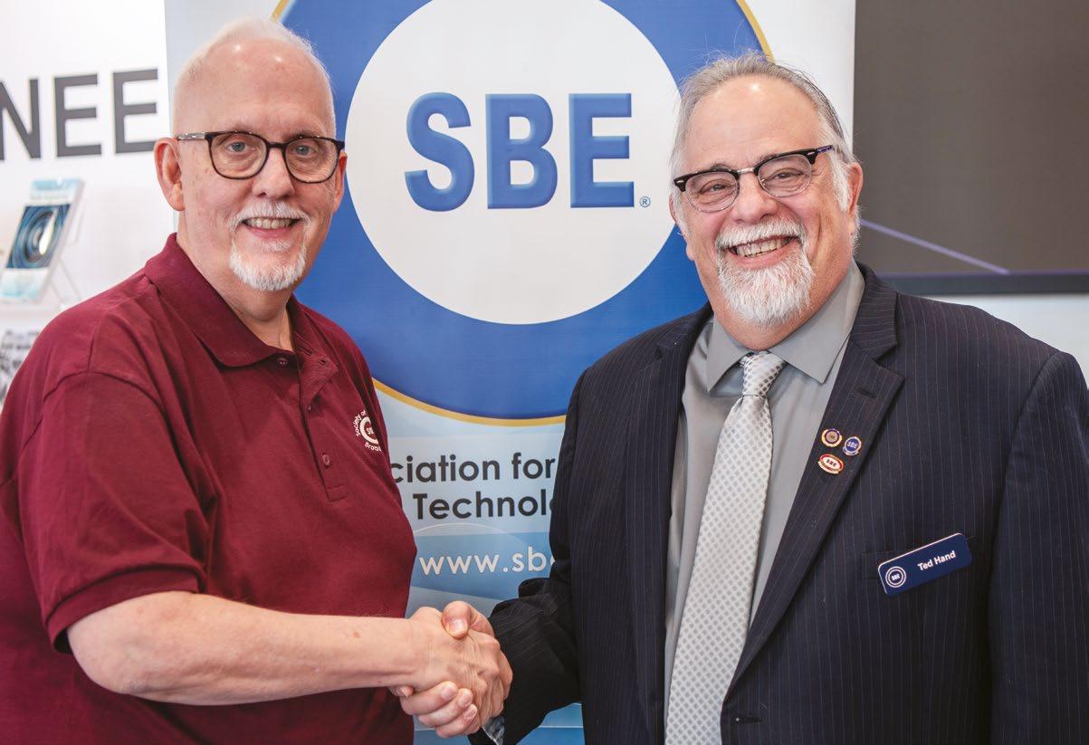 Mike Downs, left, the new executive director of the Society of Broadcast Engineers, met many members for the first time. He’s shown with SBE President Ted Hand.