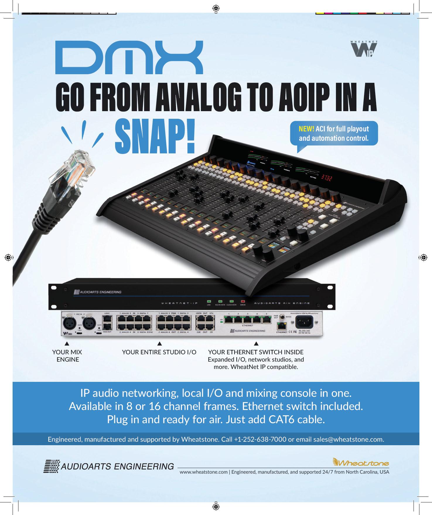 Now WheatNet IP compatible: Audioarts DMX console system including mix engine with local I/O, five-port Ethernet switch and automation plugin for a fully self-contained AoIP system in one. Ideal for smaller facilities or for budget studios that serve as backup to a main.