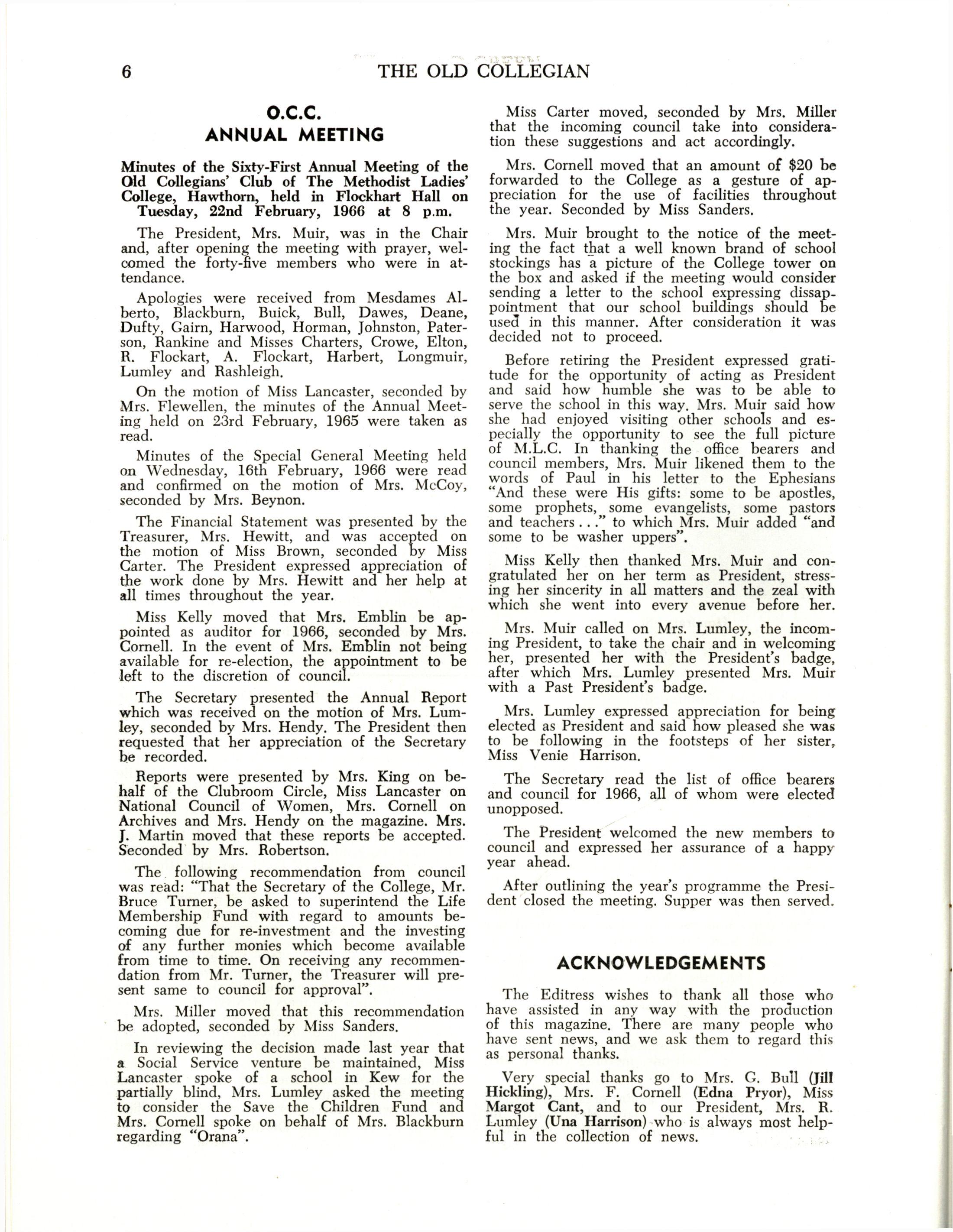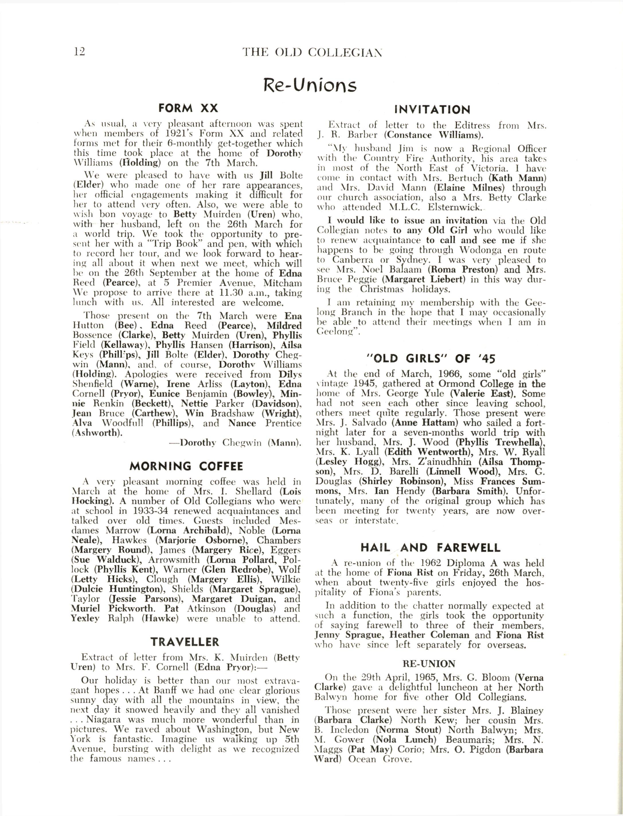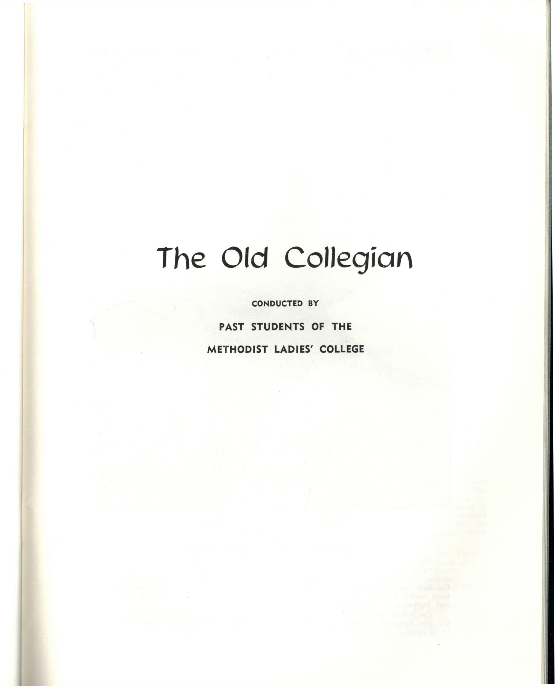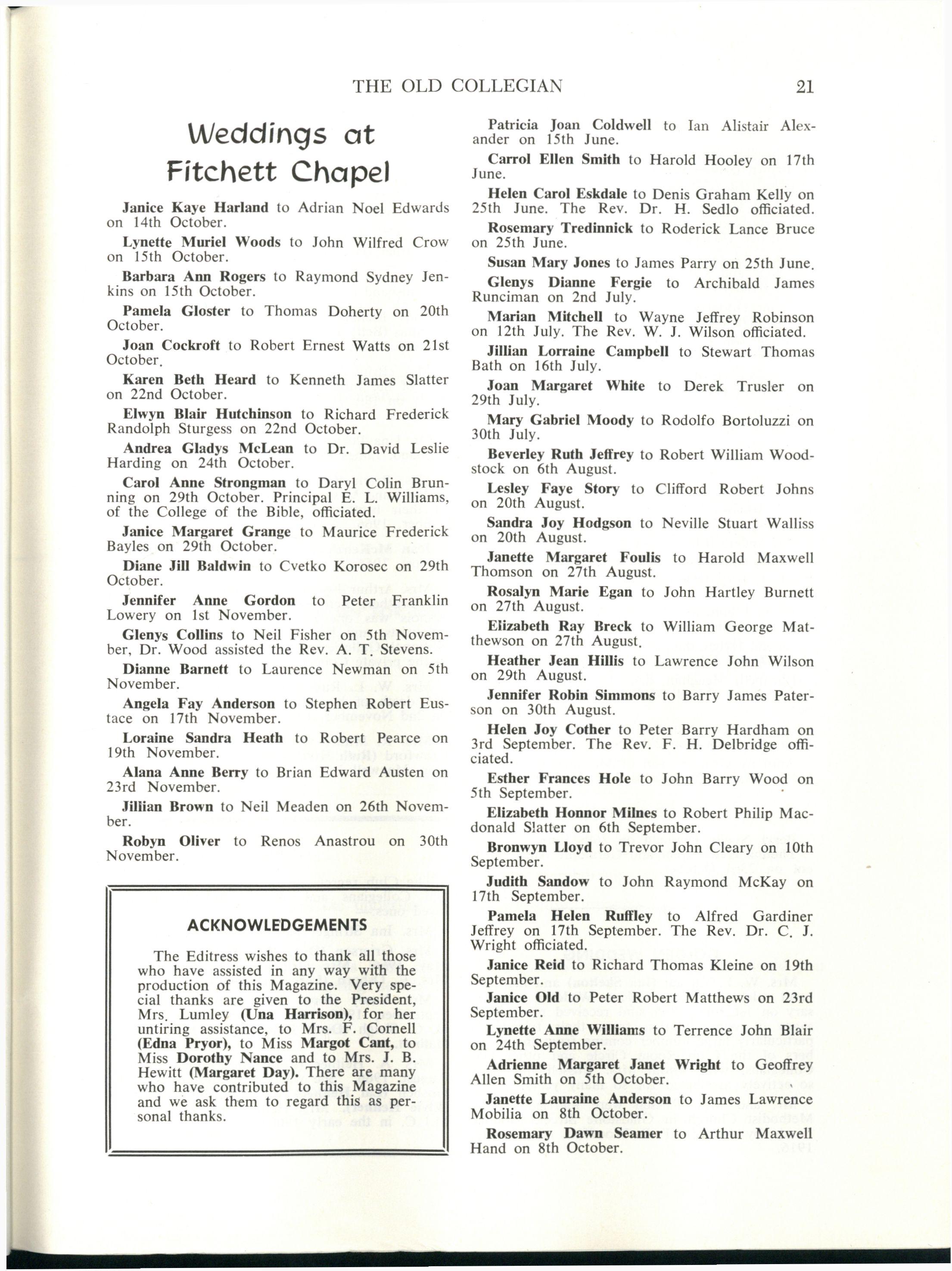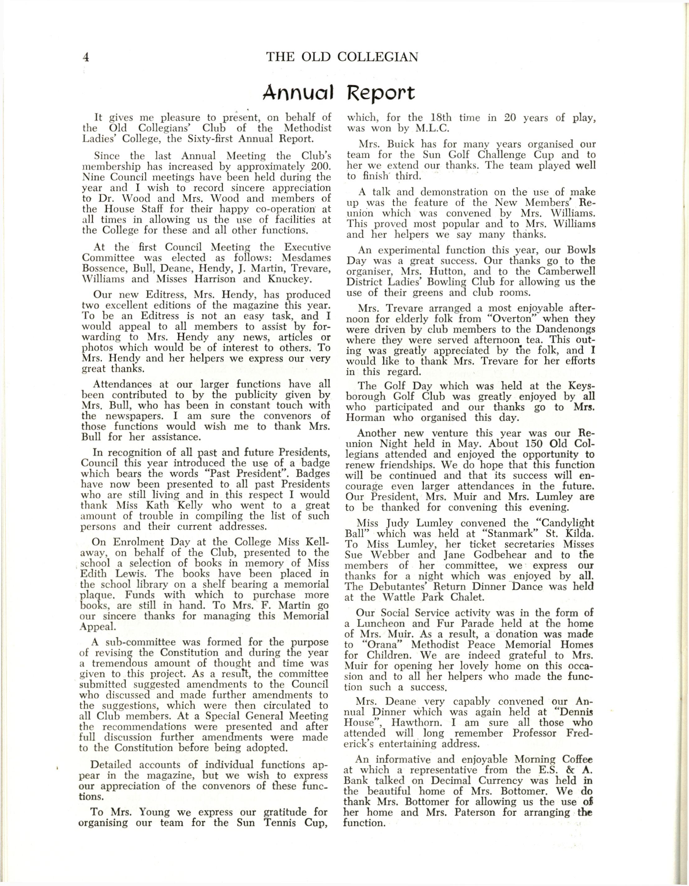 The Editress wishes to thank all those who have assisted in any way with the production of this Magazine Very special thanks are given to the President, Mrs. Lumley (Una Harrison), for her untiring assistance, to Mrs F Cornell (Edna Pryor), to Miss Margot Cant, to Miss Dorothy Nance and to Mrs J B Hewitt (Margaret Day) There are many who have contributed to this Magazine and we ask them to regard this as personal thanks
