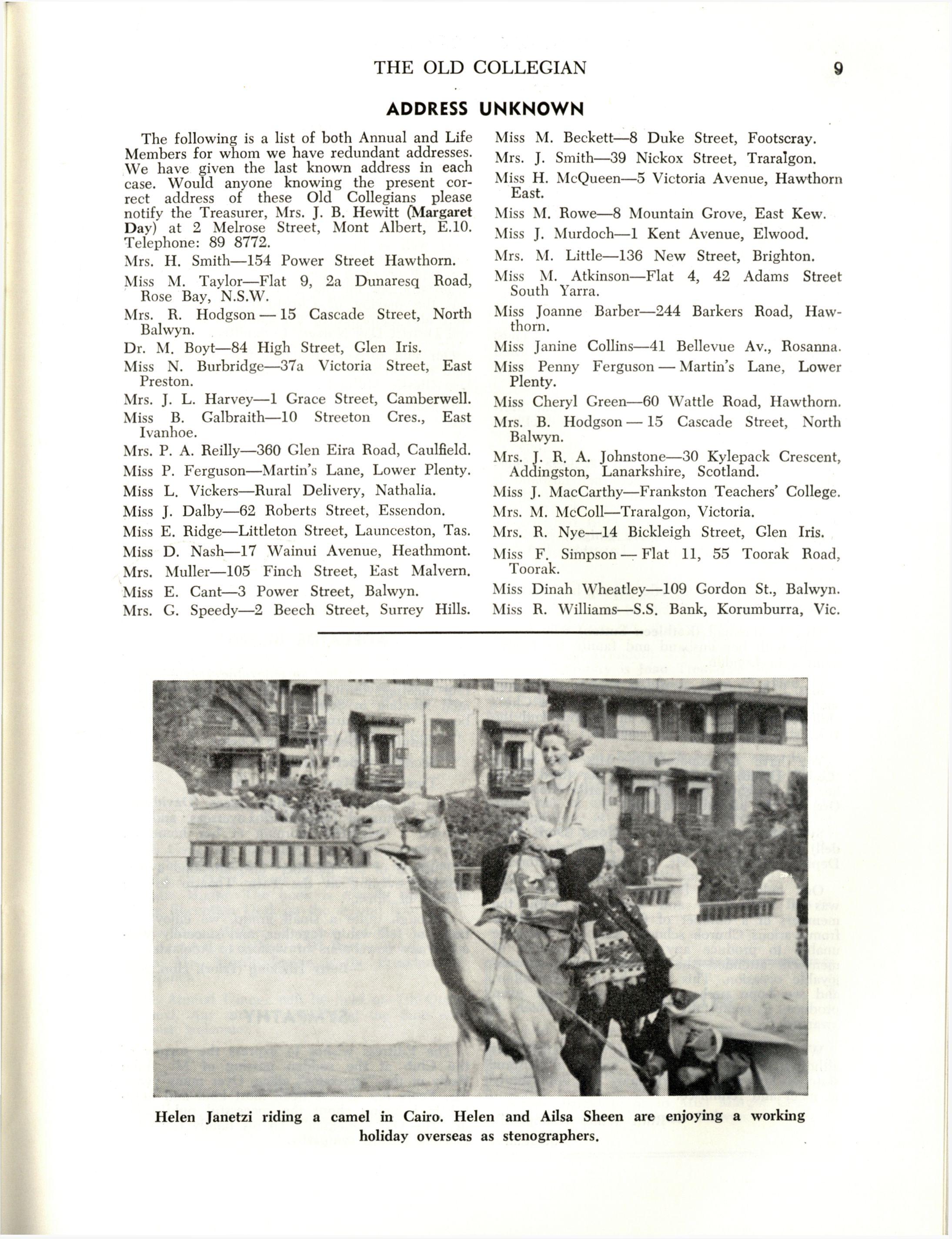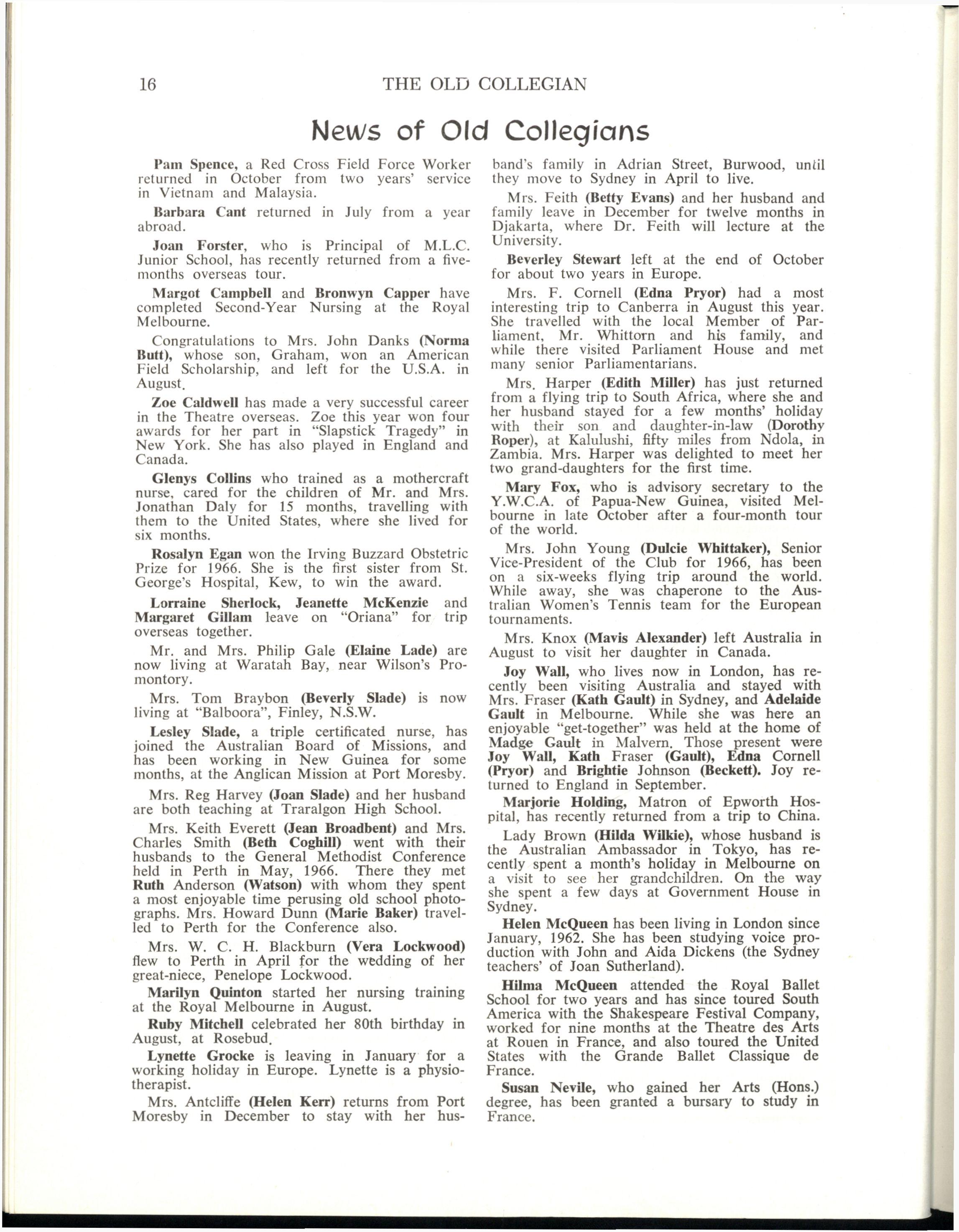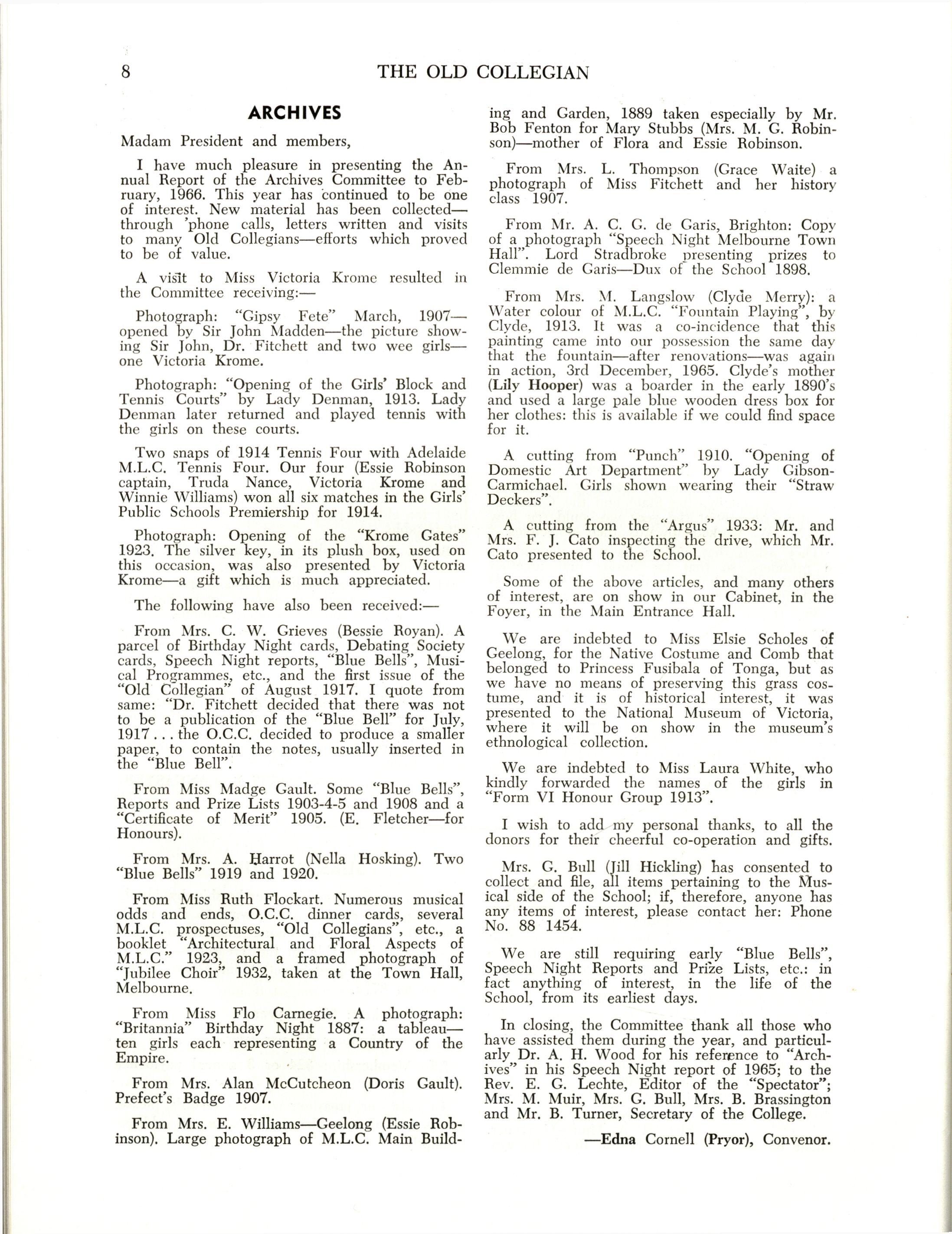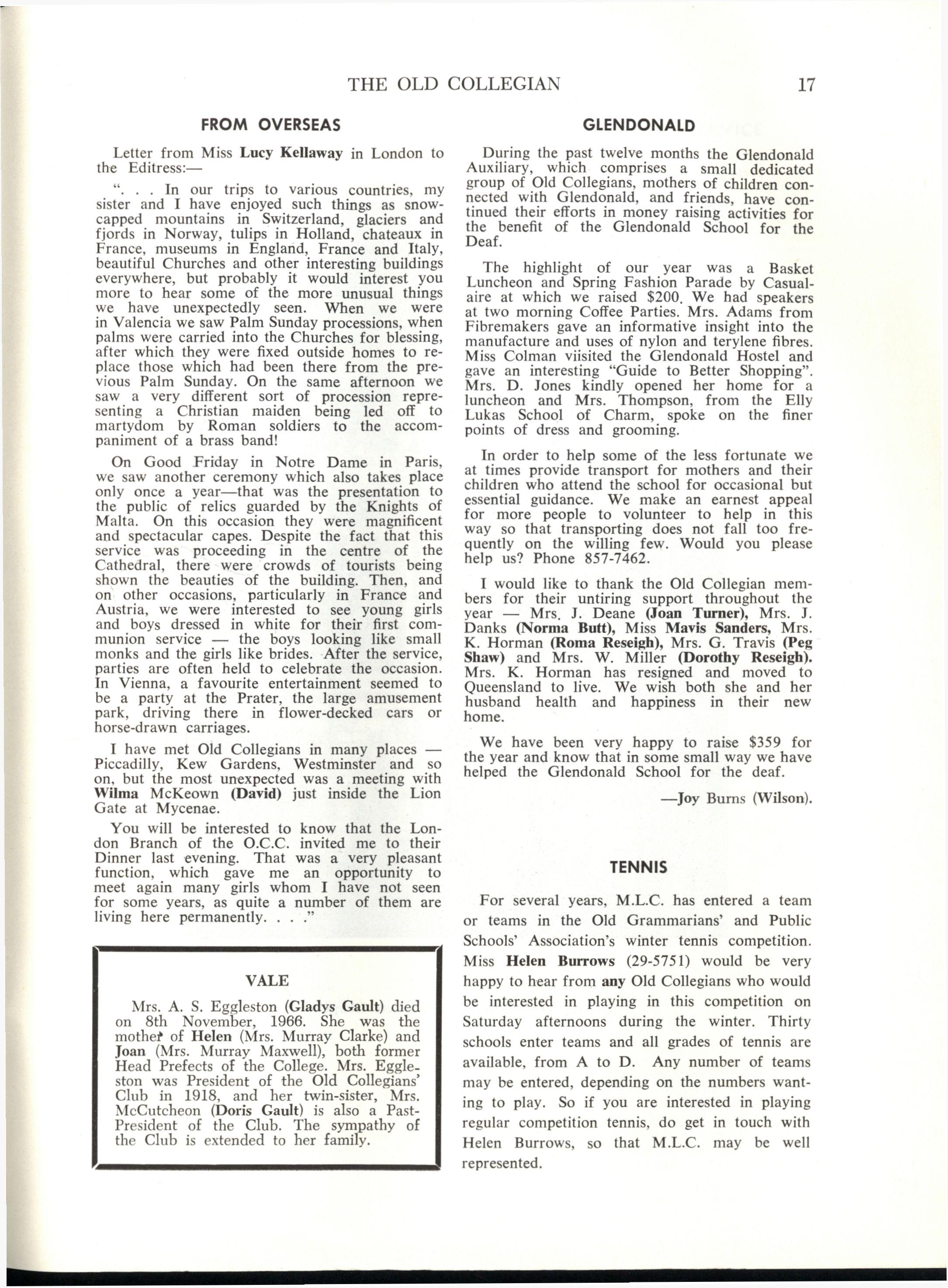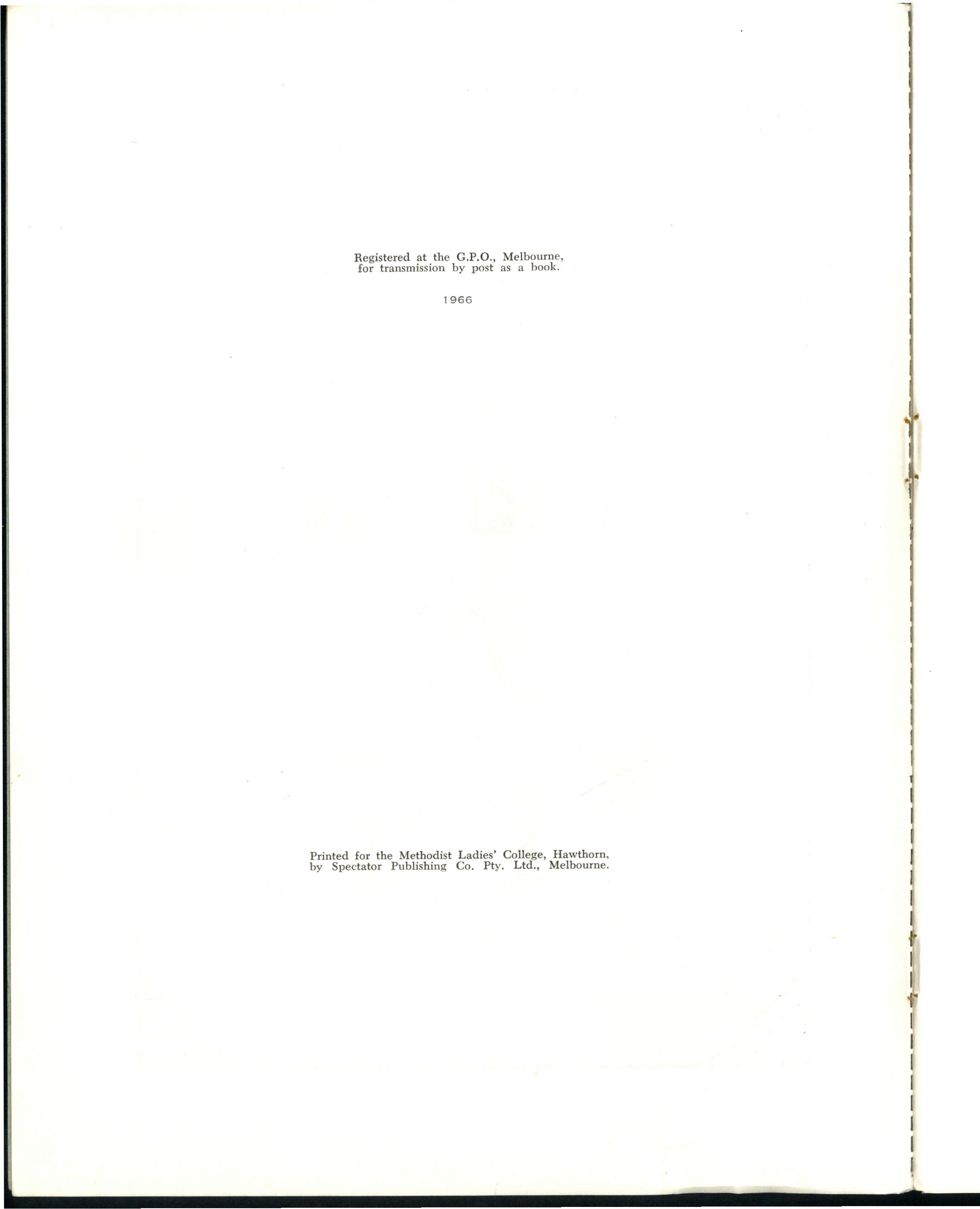 The Editress wishes to thank all those who have assisted in any way with the production of this Magazine Very special thanks are given to the President, Mrs. Lumley (Una Harrison), for her untiring assistance, to Mrs F Cornell (Edna Pryor), to Miss Margot Cant, to Miss Dorothy Nance and to Mrs J B Hewitt (Margaret Day) There are many who have contributed to this Magazine and we ask them to regard this as personal thanks