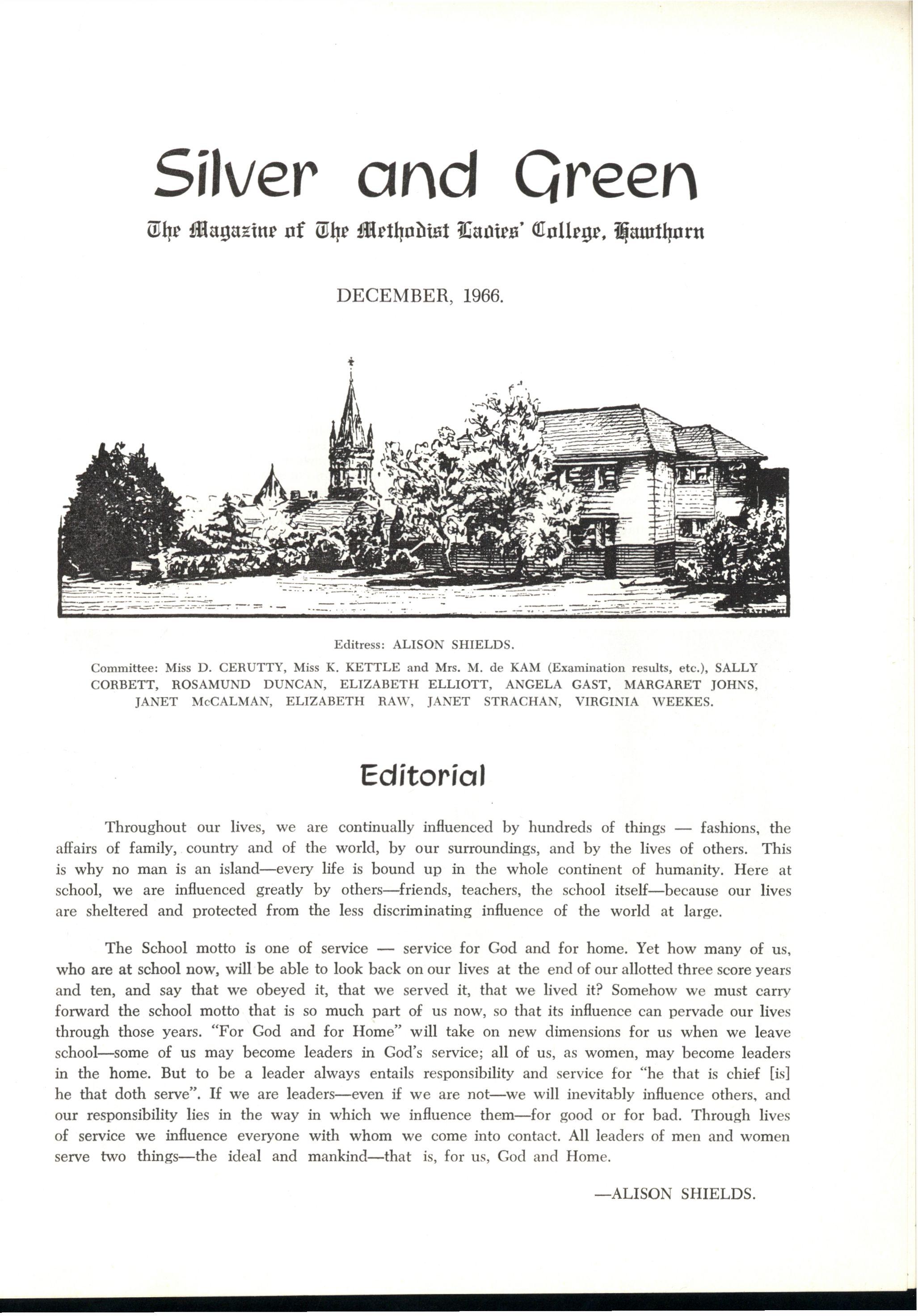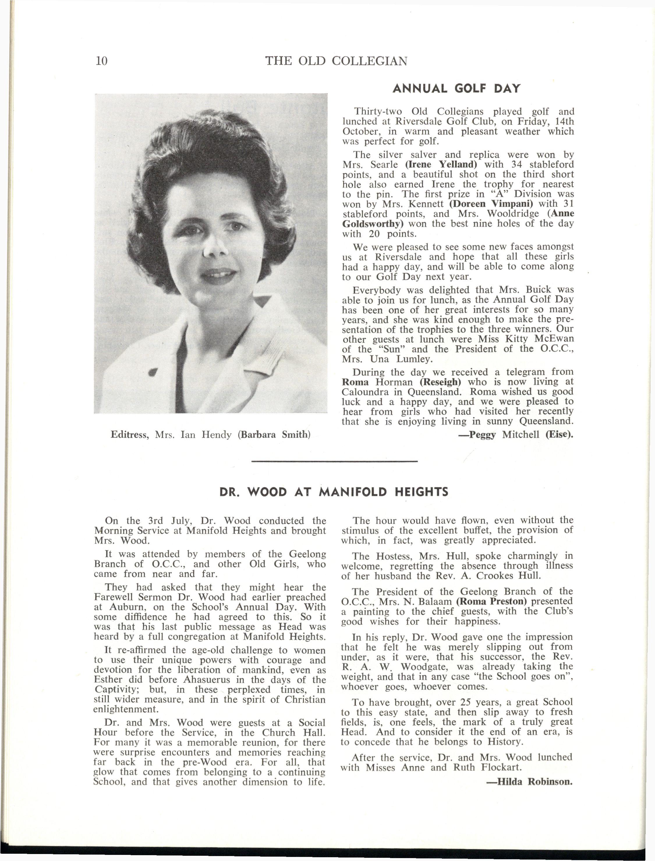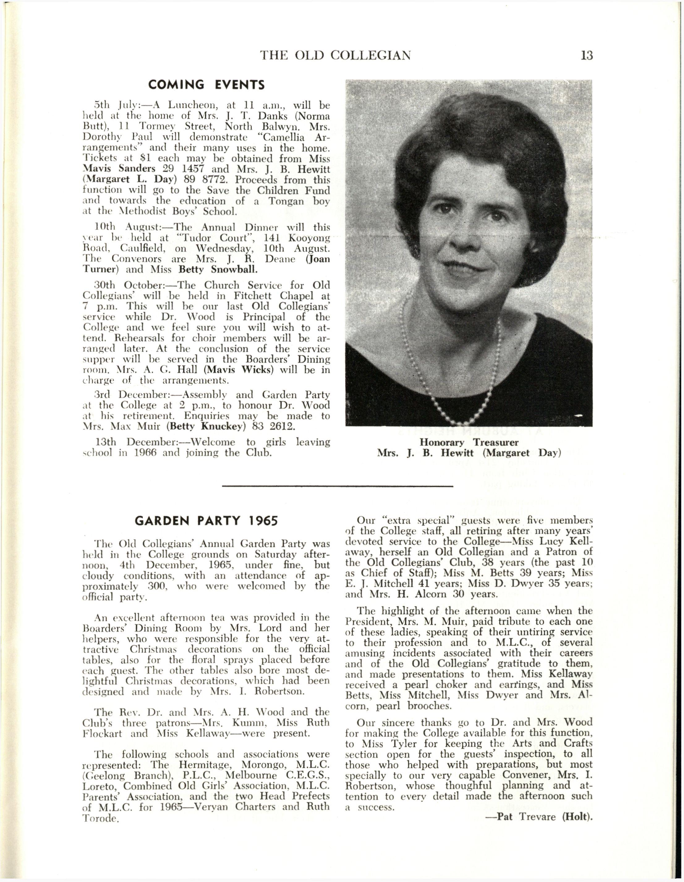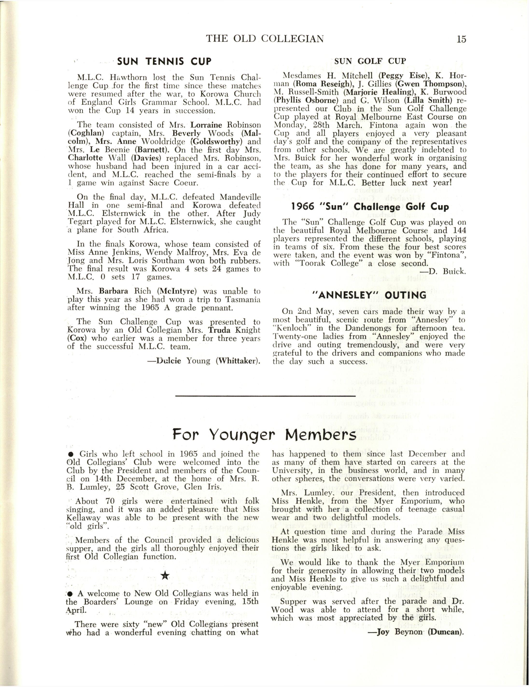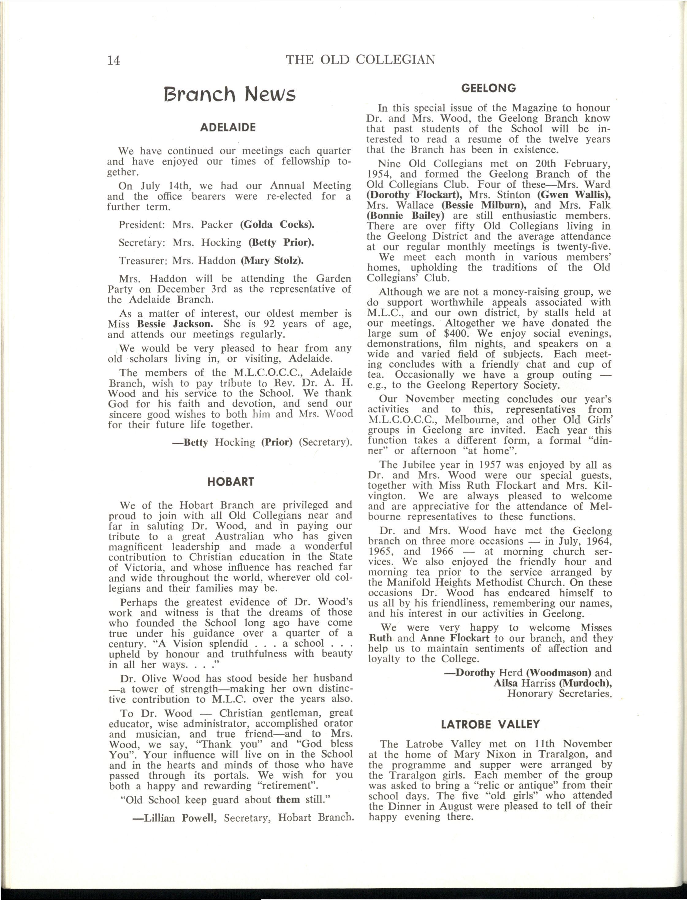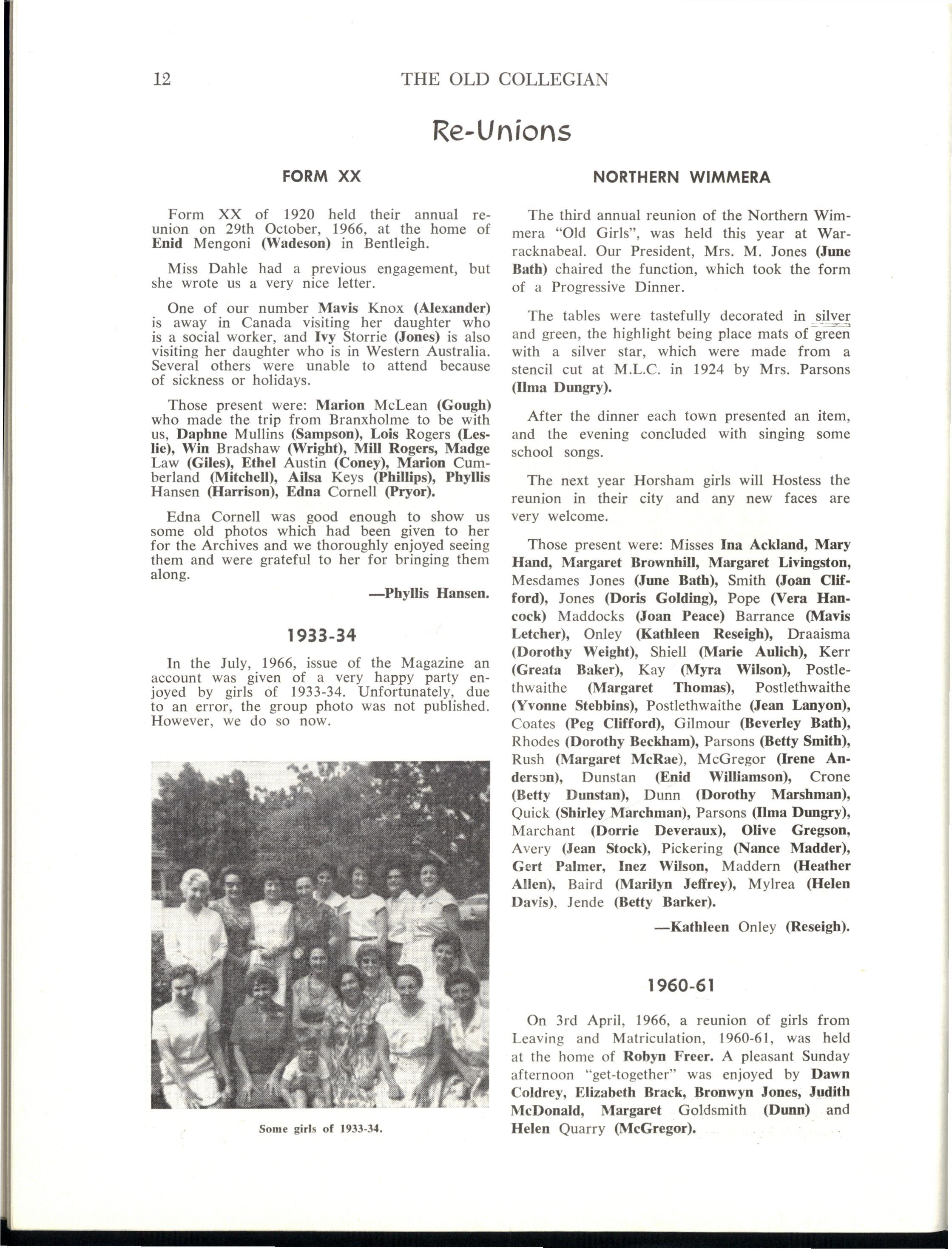 The Editress wishes to thank all those who have assisted in any way with the production of this Magazine Very special thanks are given to the President, Mrs. Lumley (Una Harrison), for her untiring assistance, to Mrs F Cornell (Edna Pryor), to Miss Margot Cant, to Miss Dorothy Nance and to Mrs J B Hewitt (Margaret Day) There are many who have contributed to this Magazine and we ask them to regard this as personal thanks