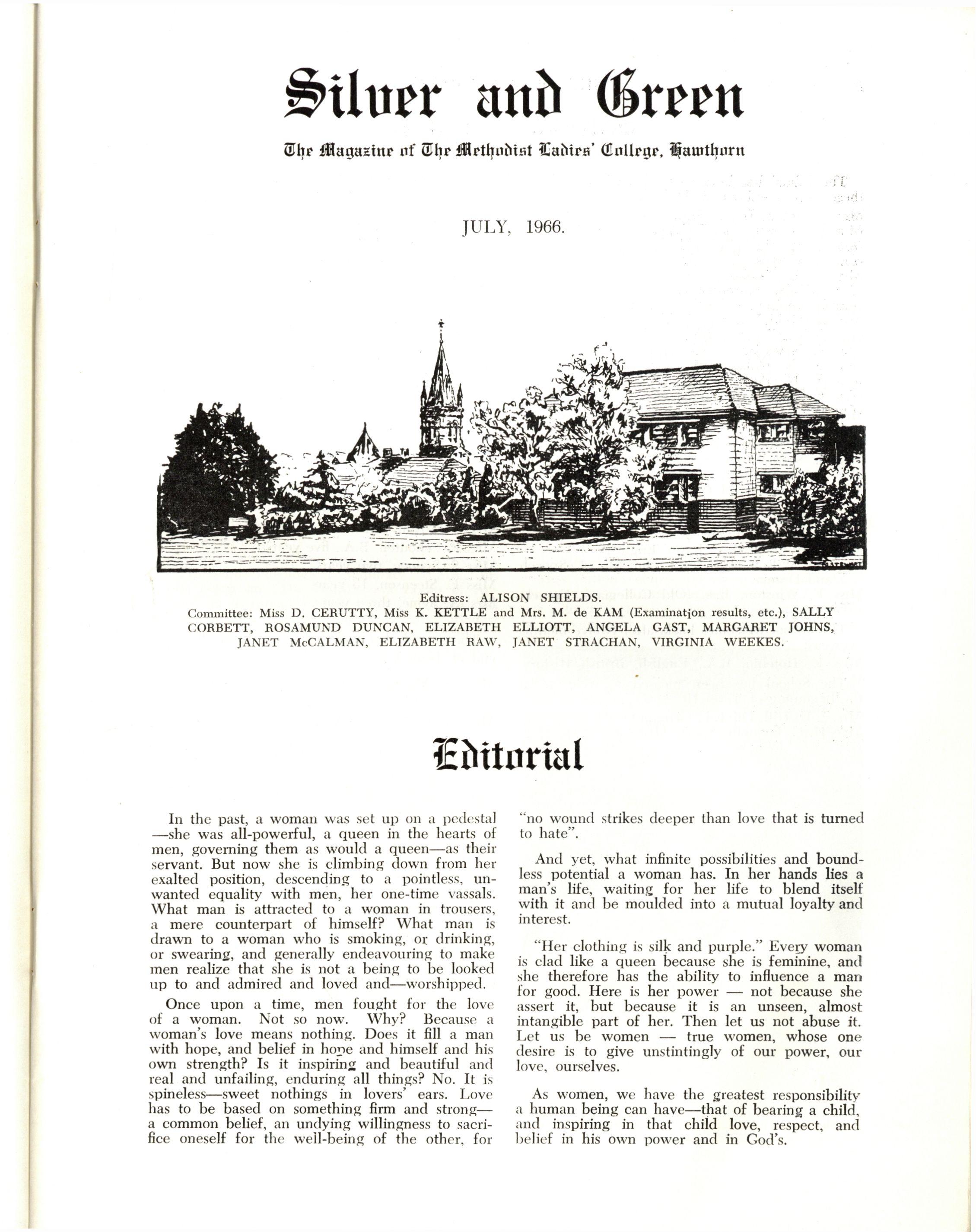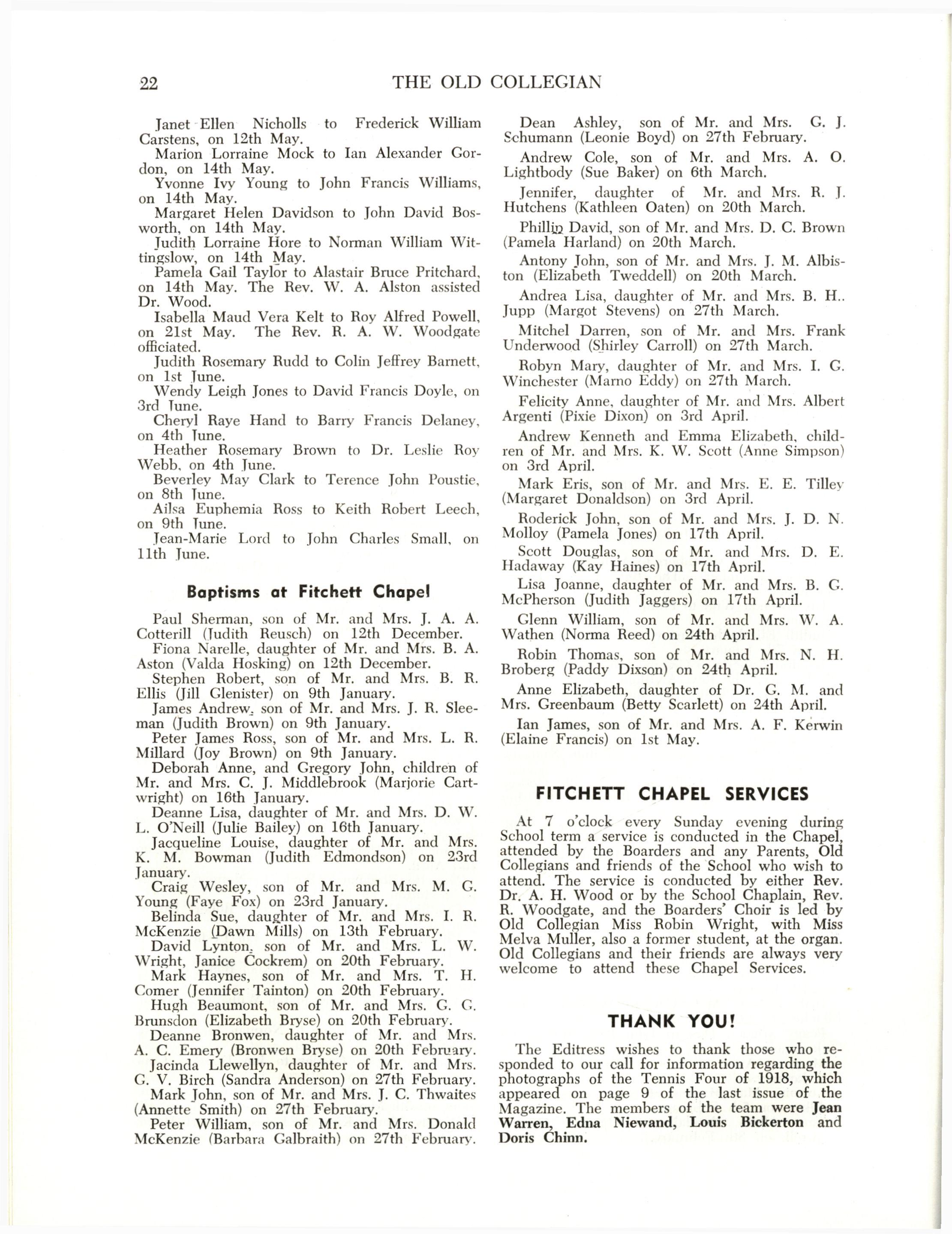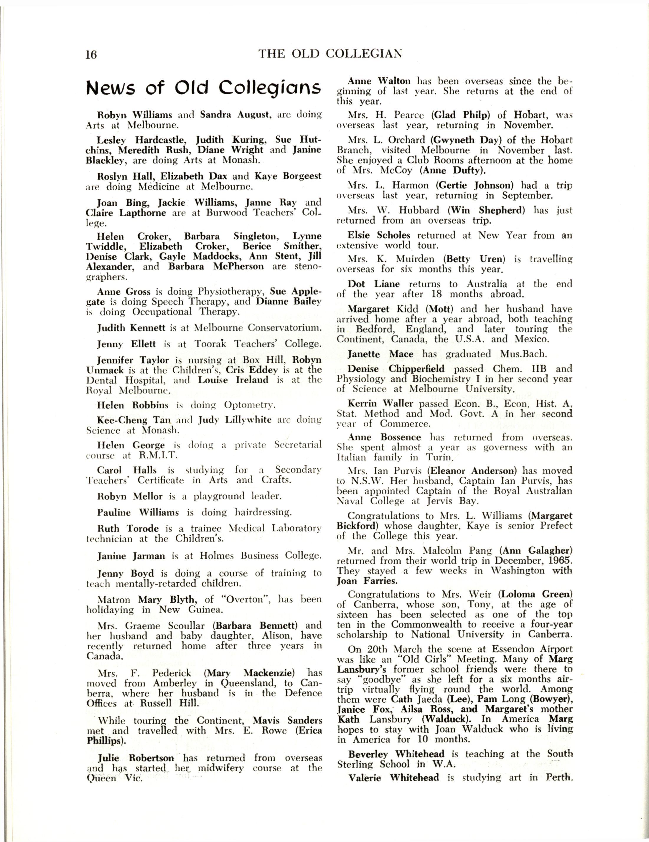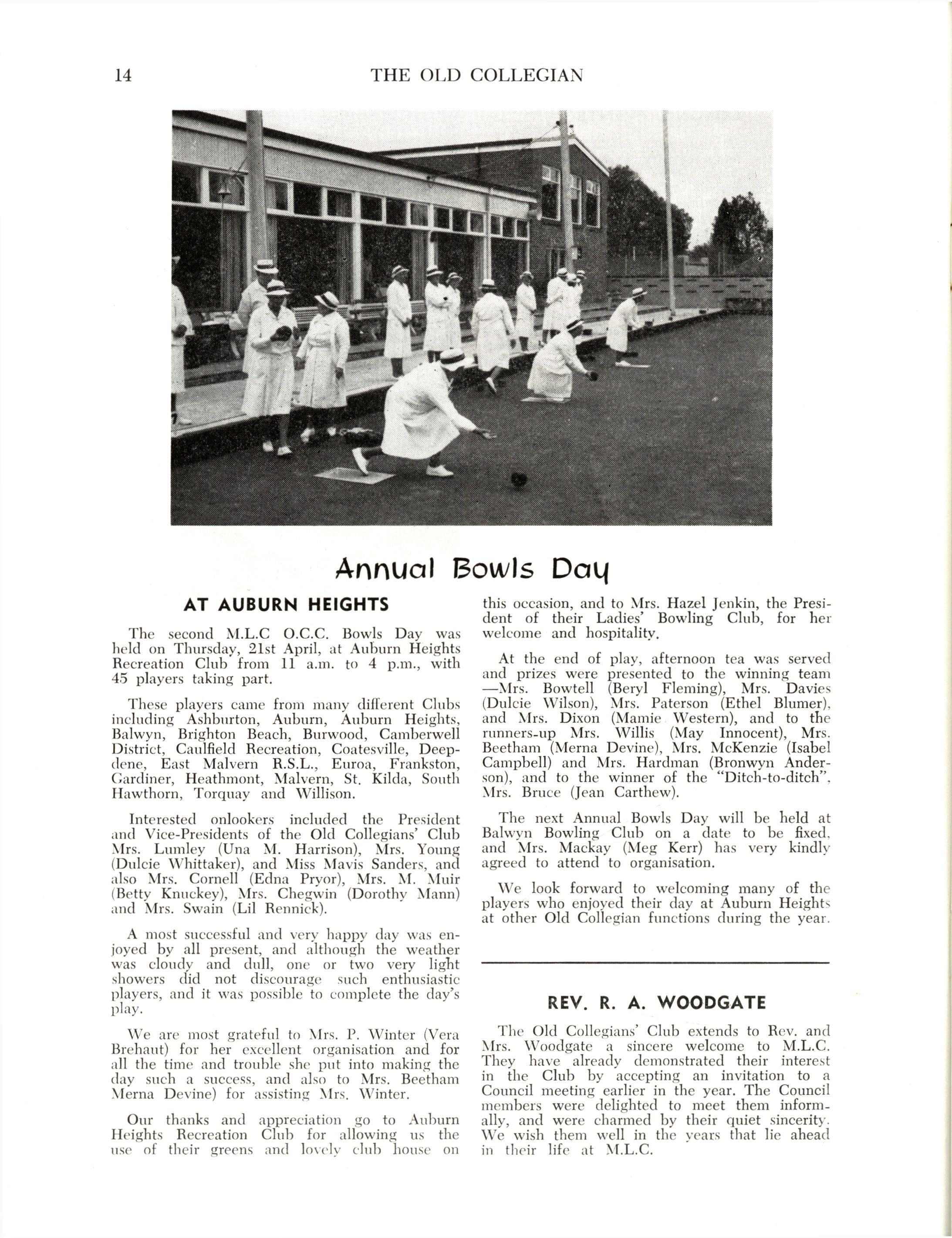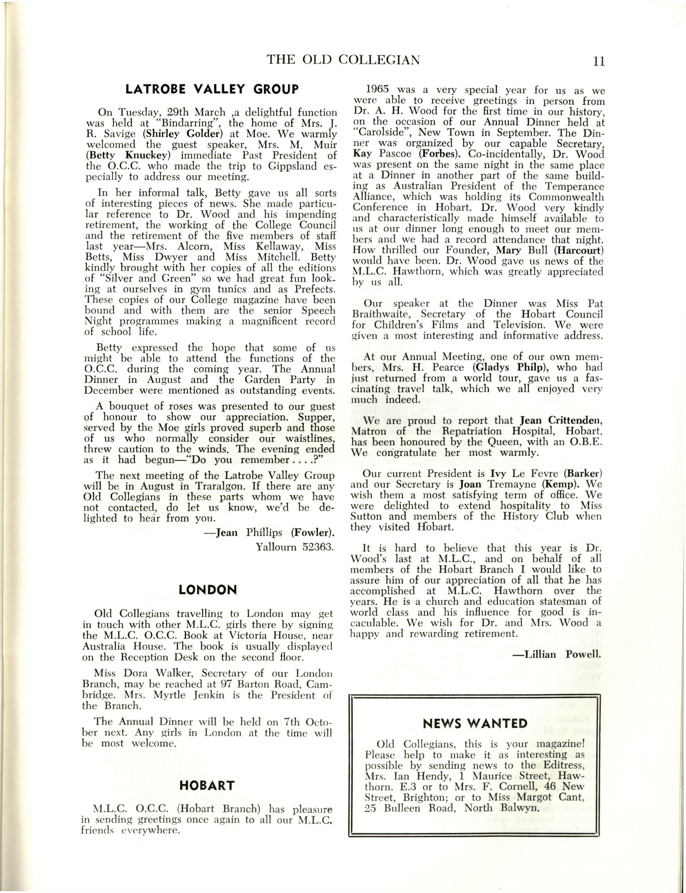 The Editress wishes to thank all those who have assisted in any way with the production of this Magazine Very special thanks are given to the President, Mrs. Lumley (Una Harrison), for her untiring assistance, to Mrs F Cornell (Edna Pryor), to Miss Margot Cant, to Miss Dorothy Nance and to Mrs J B Hewitt (Margaret Day) There are many who have contributed to this Magazine and we ask them to regard this as personal thanks