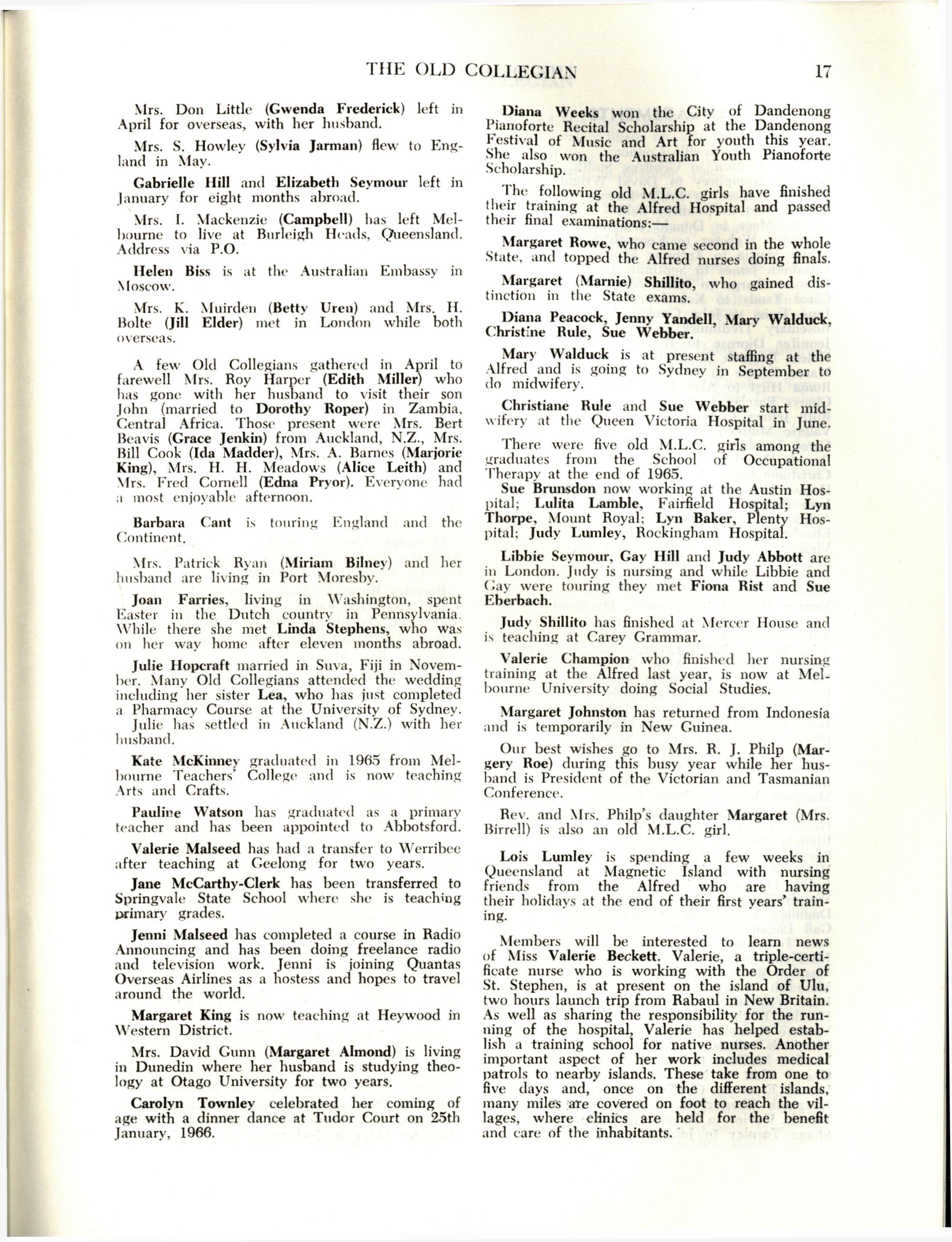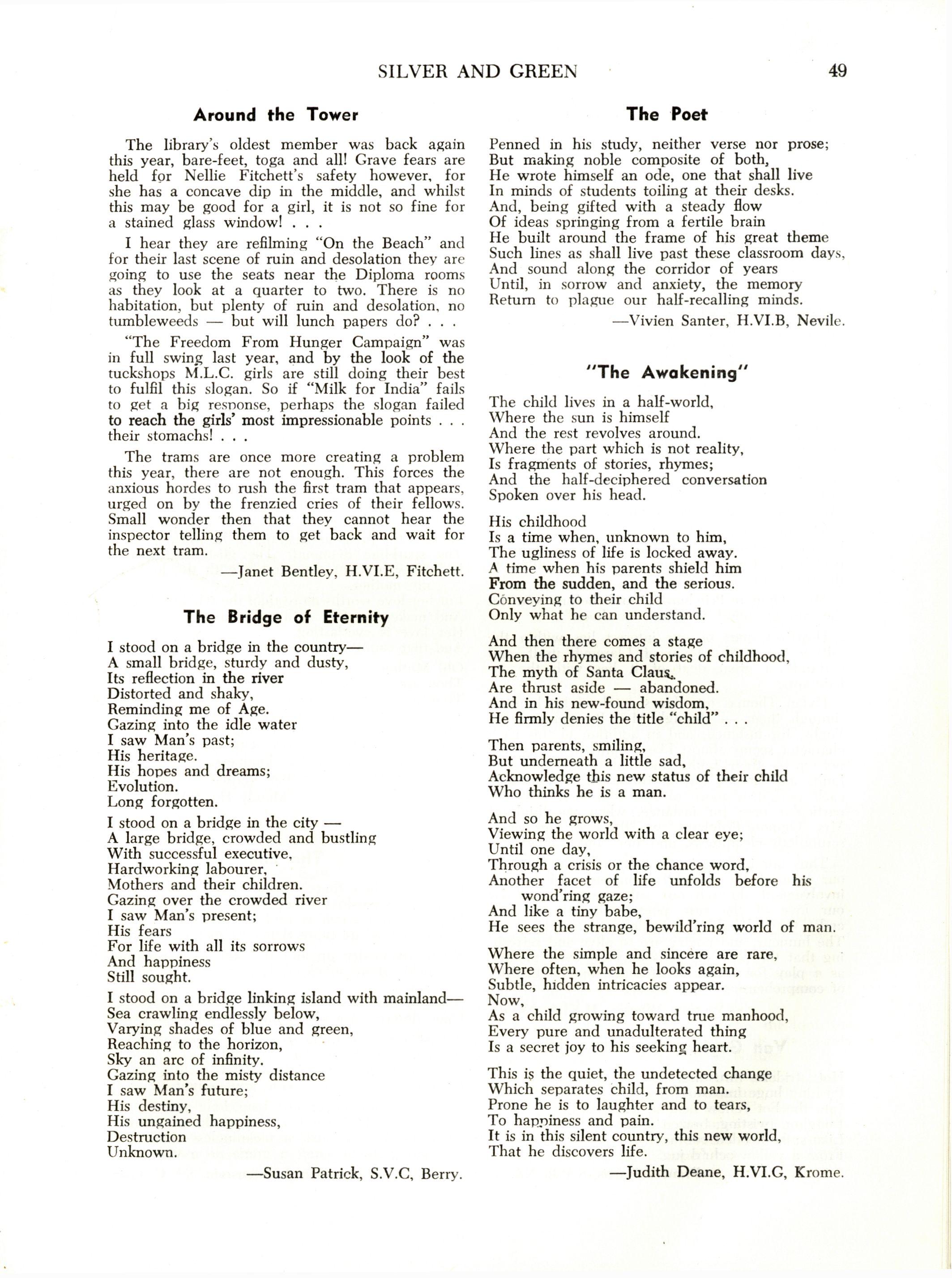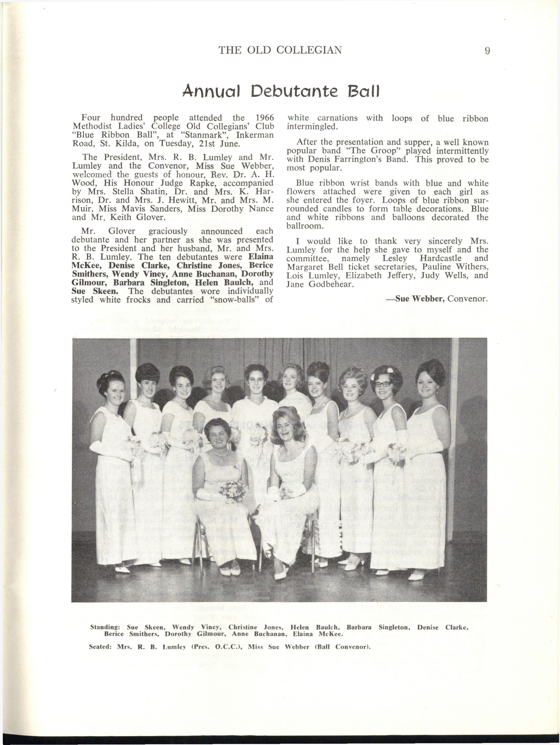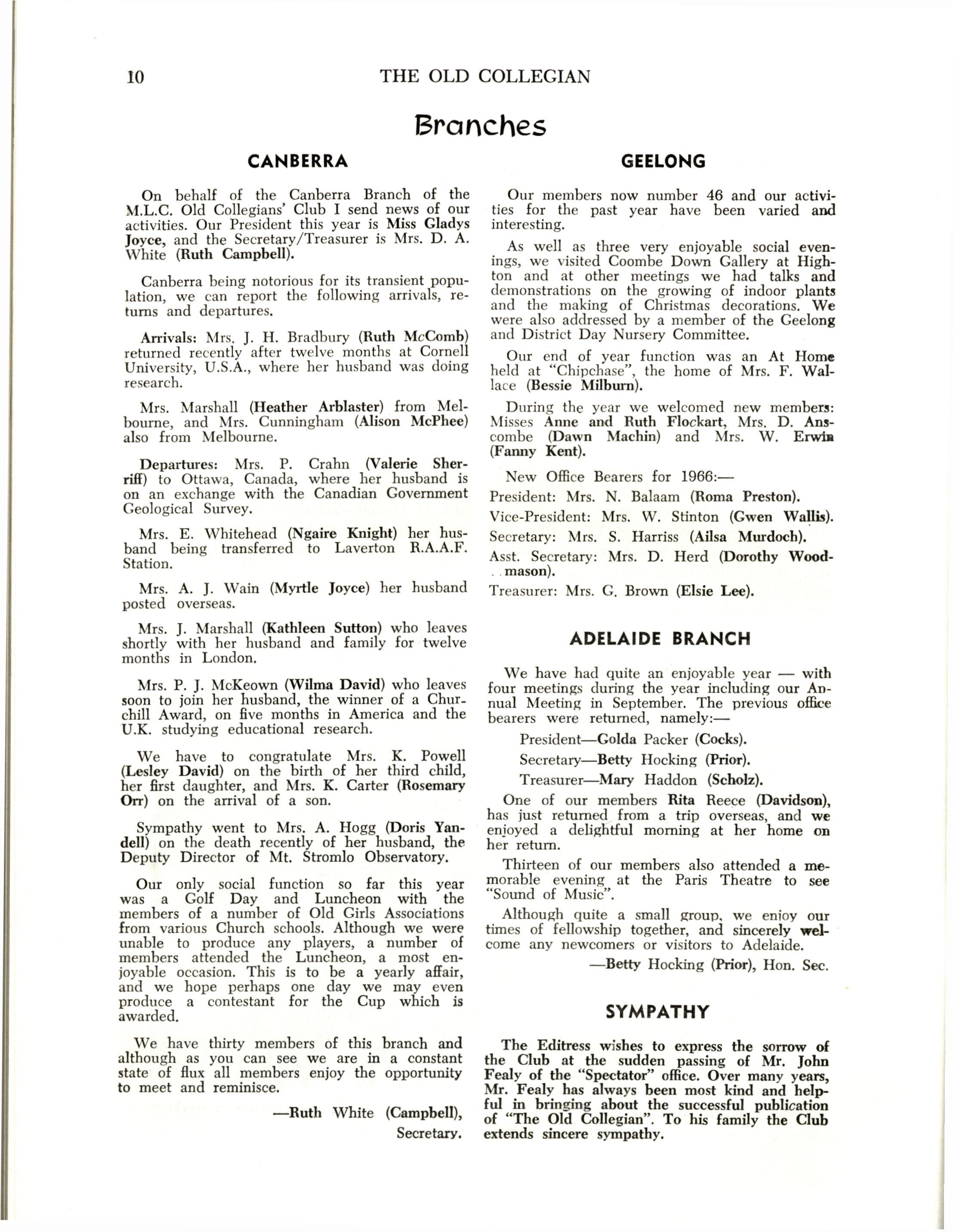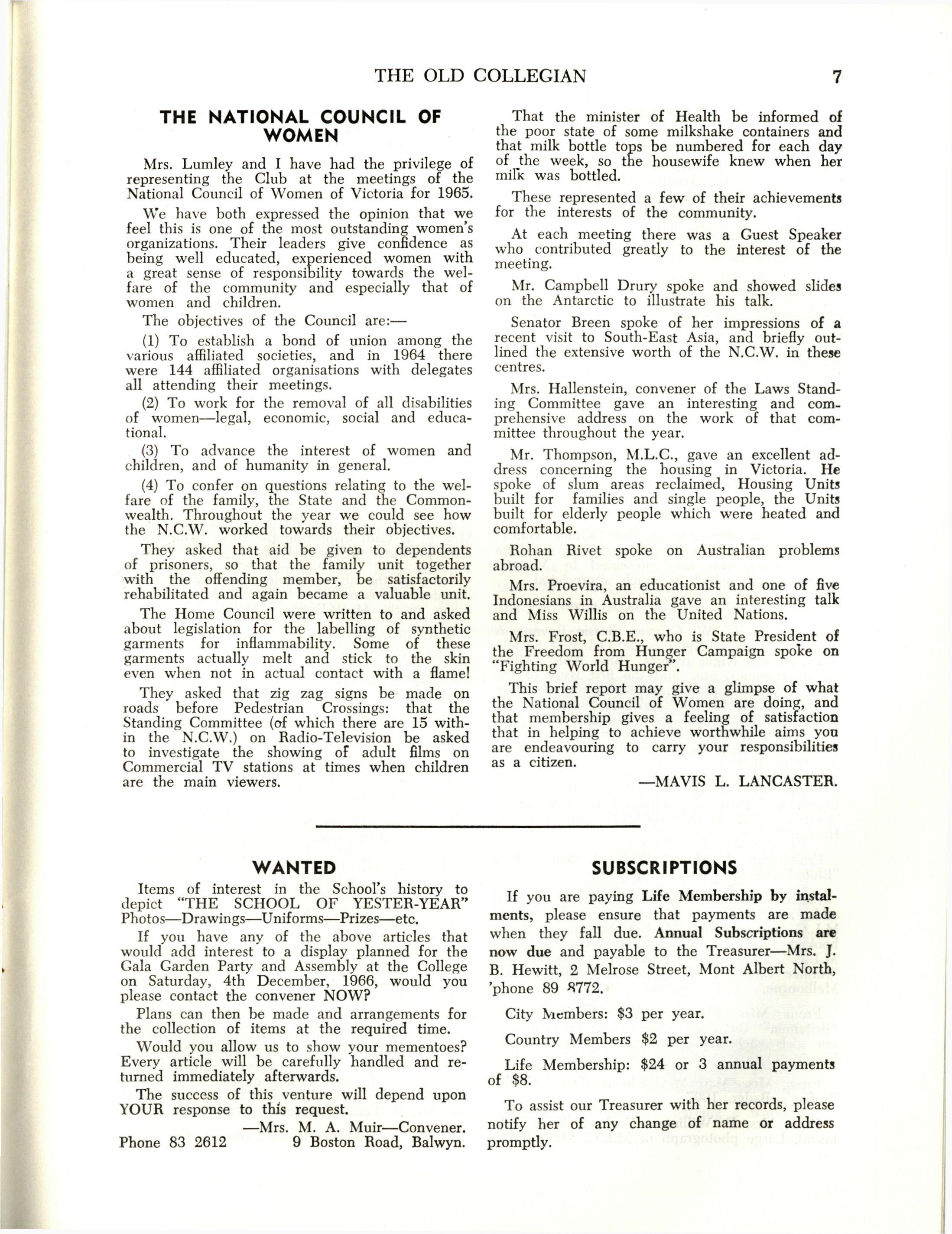 The Editress wishes to thank all those who have assisted in any way with the production of this Magazine Very special thanks are given to the President, Mrs. Lumley (Una Harrison), for her untiring assistance, to Mrs F Cornell (Edna Pryor), to Miss Margot Cant, to Miss Dorothy Nance and to Mrs J B Hewitt (Margaret Day) There are many who have contributed to this Magazine and we ask them to regard this as personal thanks