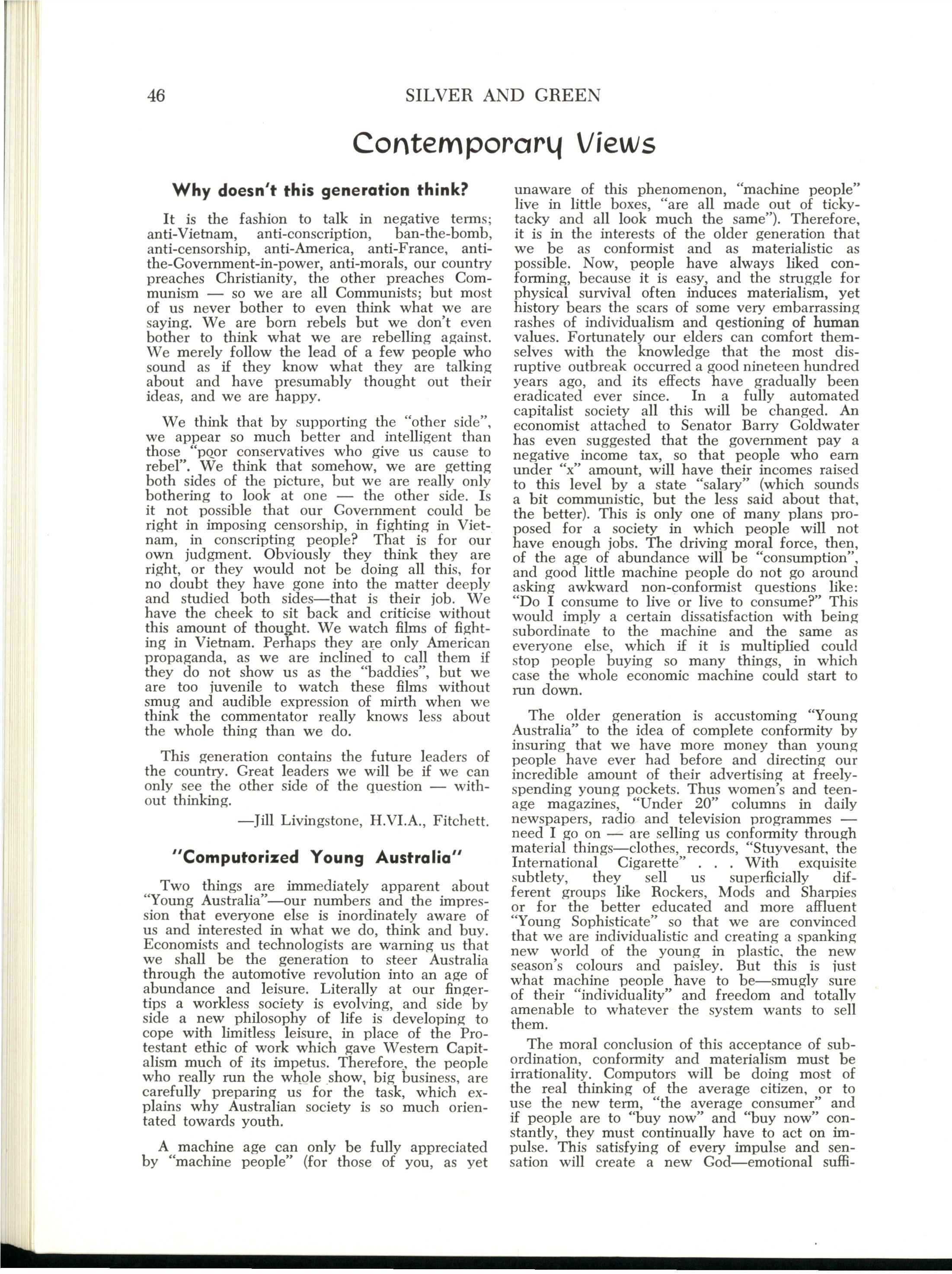 In presenting the 84th Annual Report, Dr Wood stressed the present ferment in education, the new methods which were becoming available, and the opportunities being made available to children Dr Wood also mentioned that, today, teaching is generally directed towards the average student, with the backward student receiving special attention in remedial work, and that the better-than-average student tended to be neglected. Programmed teaching for individual advancement would overcome this problem to a certain extent