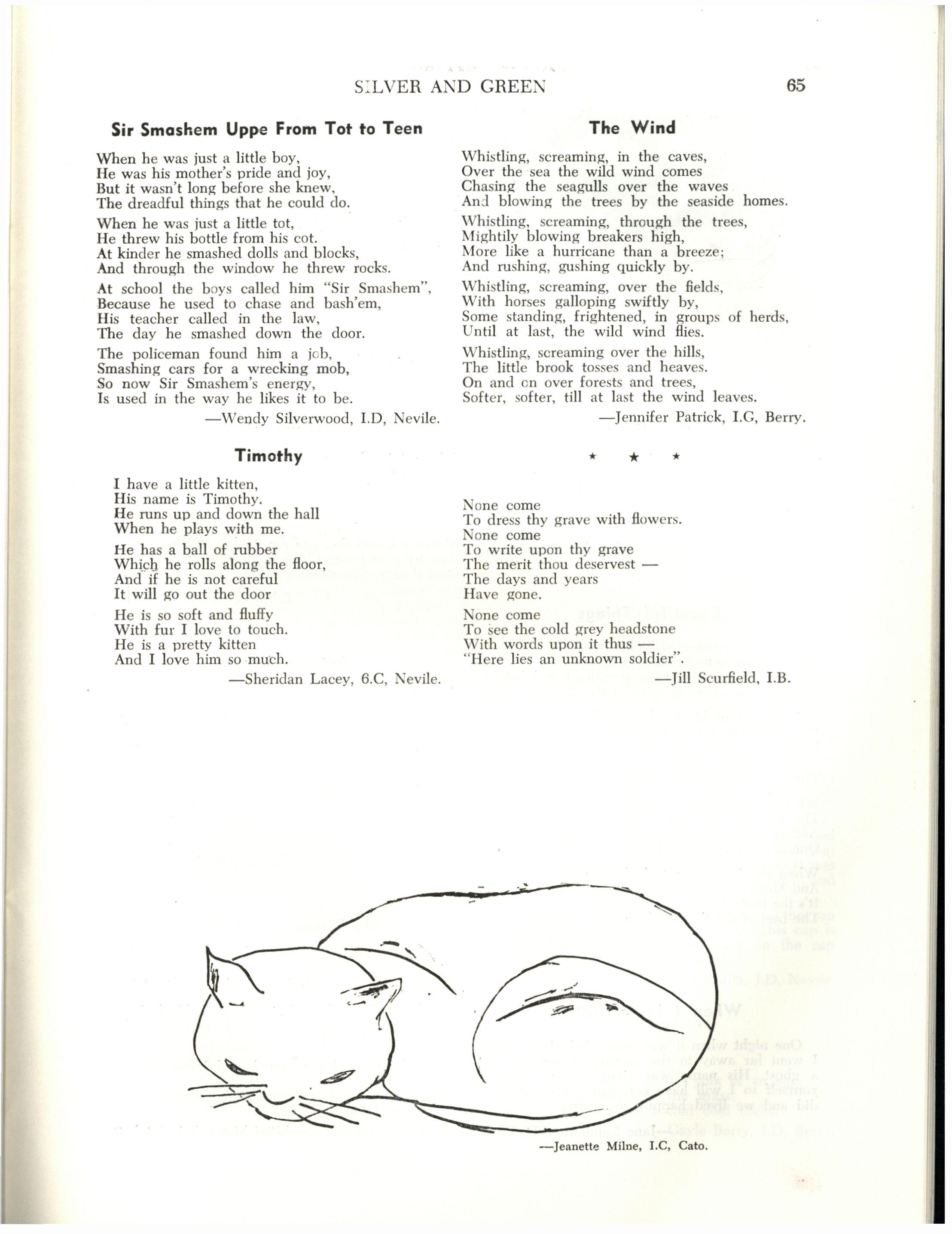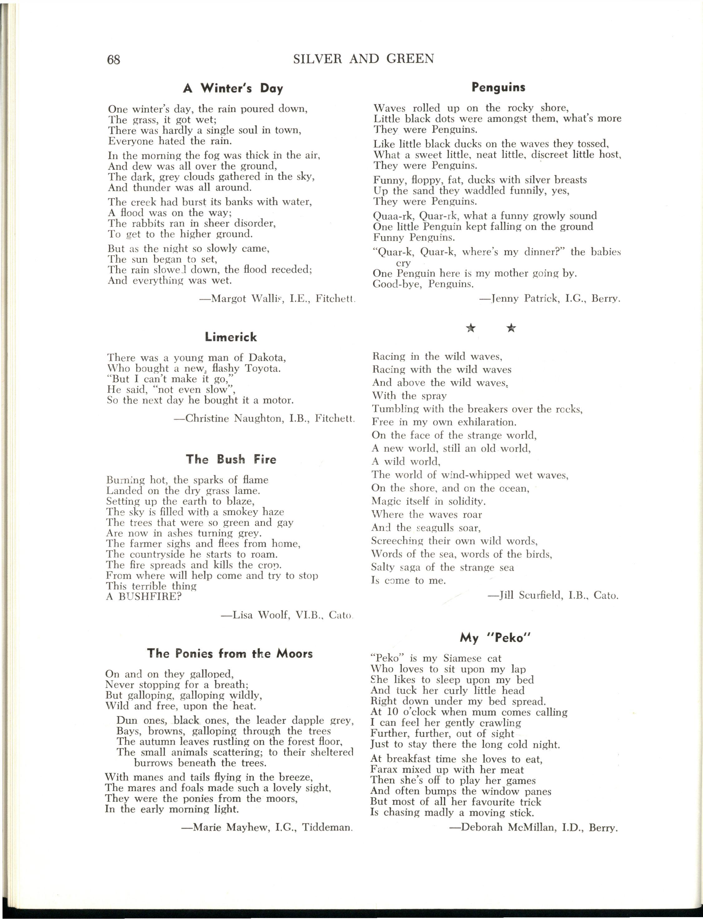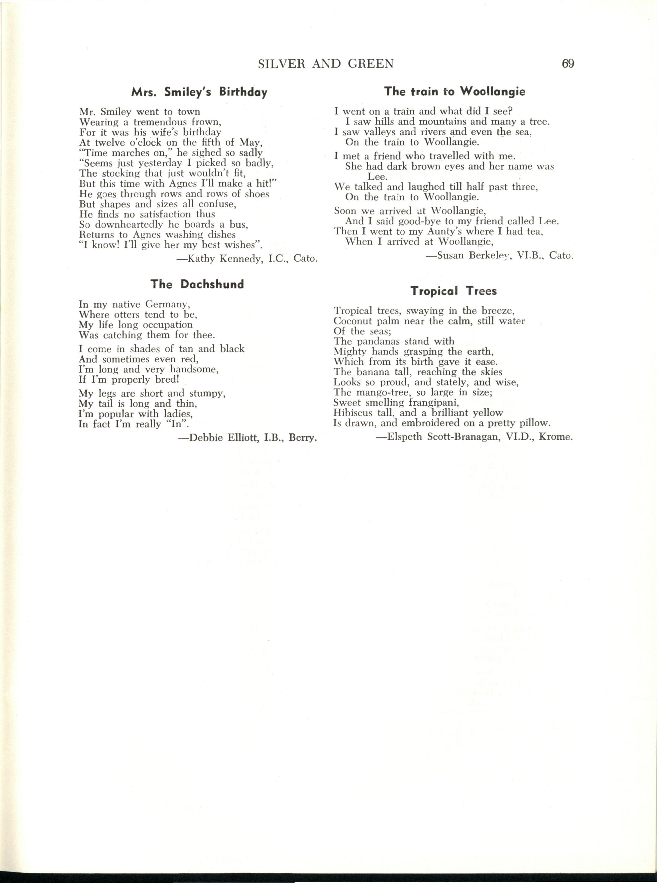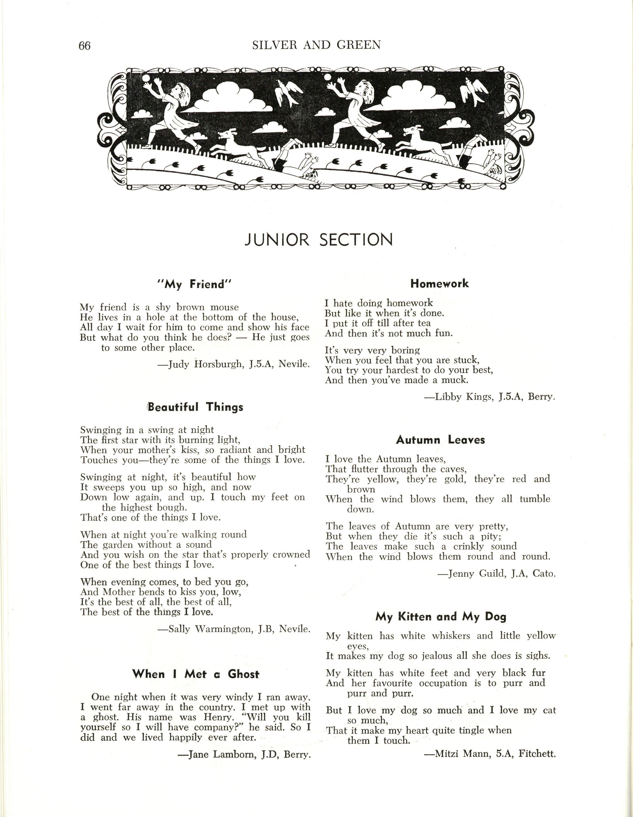 Jenny was a friendly happy person Her talents were many and varied Two of her poems appeared in "Silver and Green", and with her vivid imagination she was able to compose rhythmic, rhyming poems on the spot and set them to music She was a gifted artist