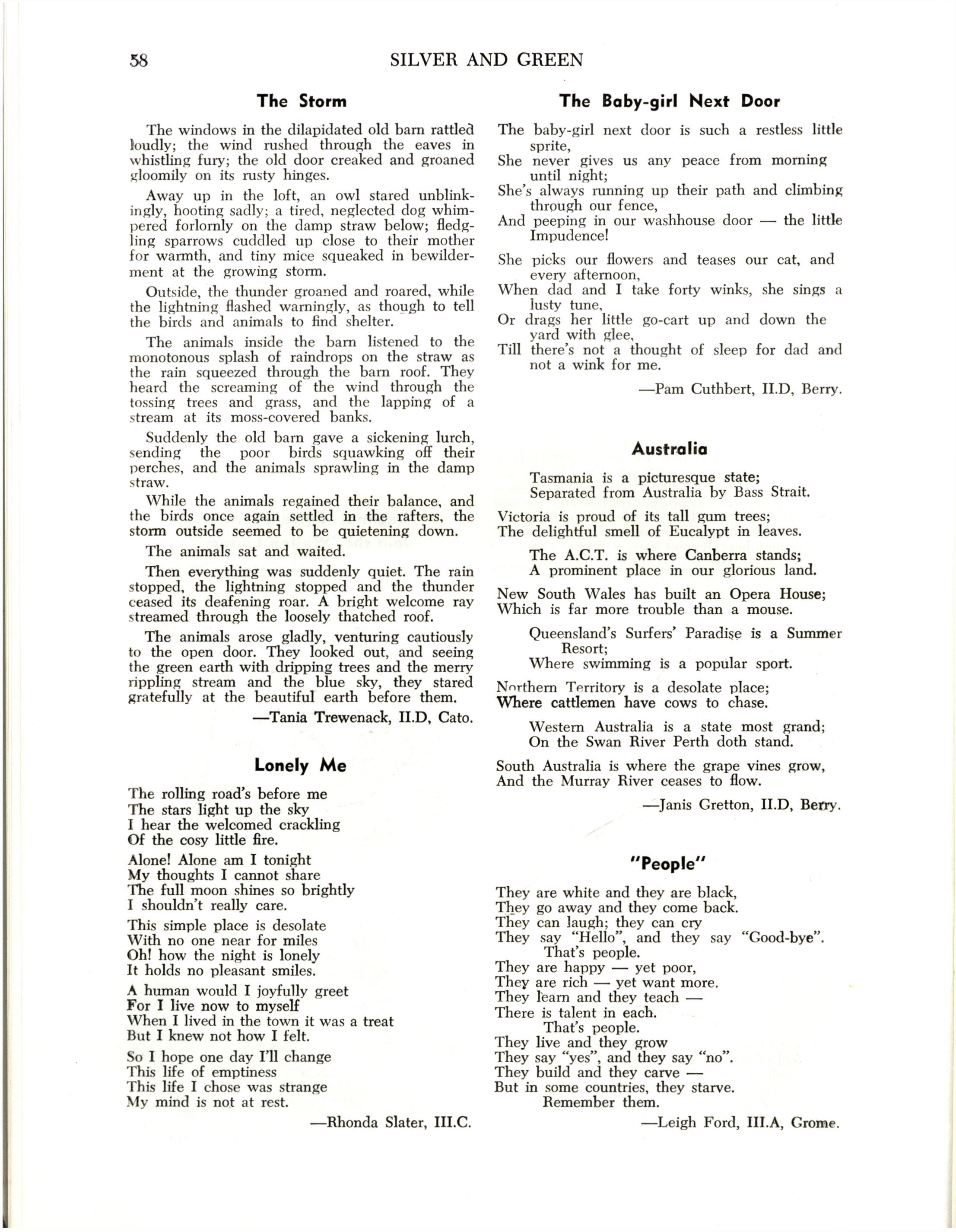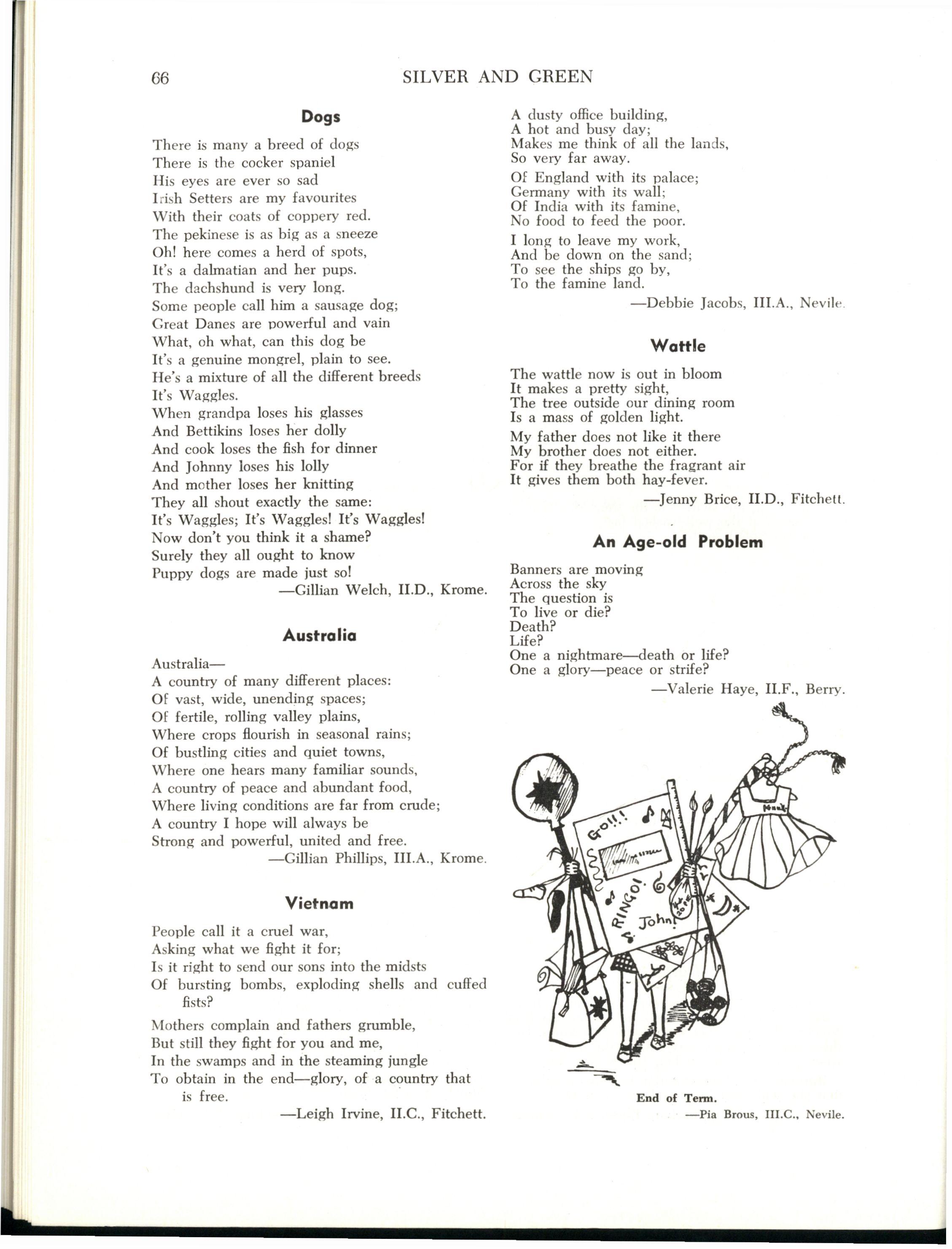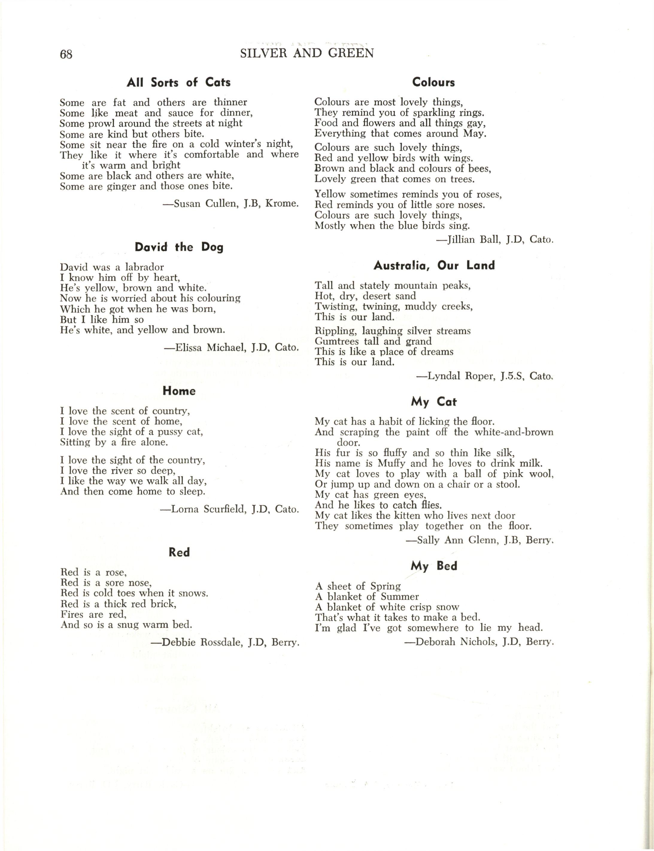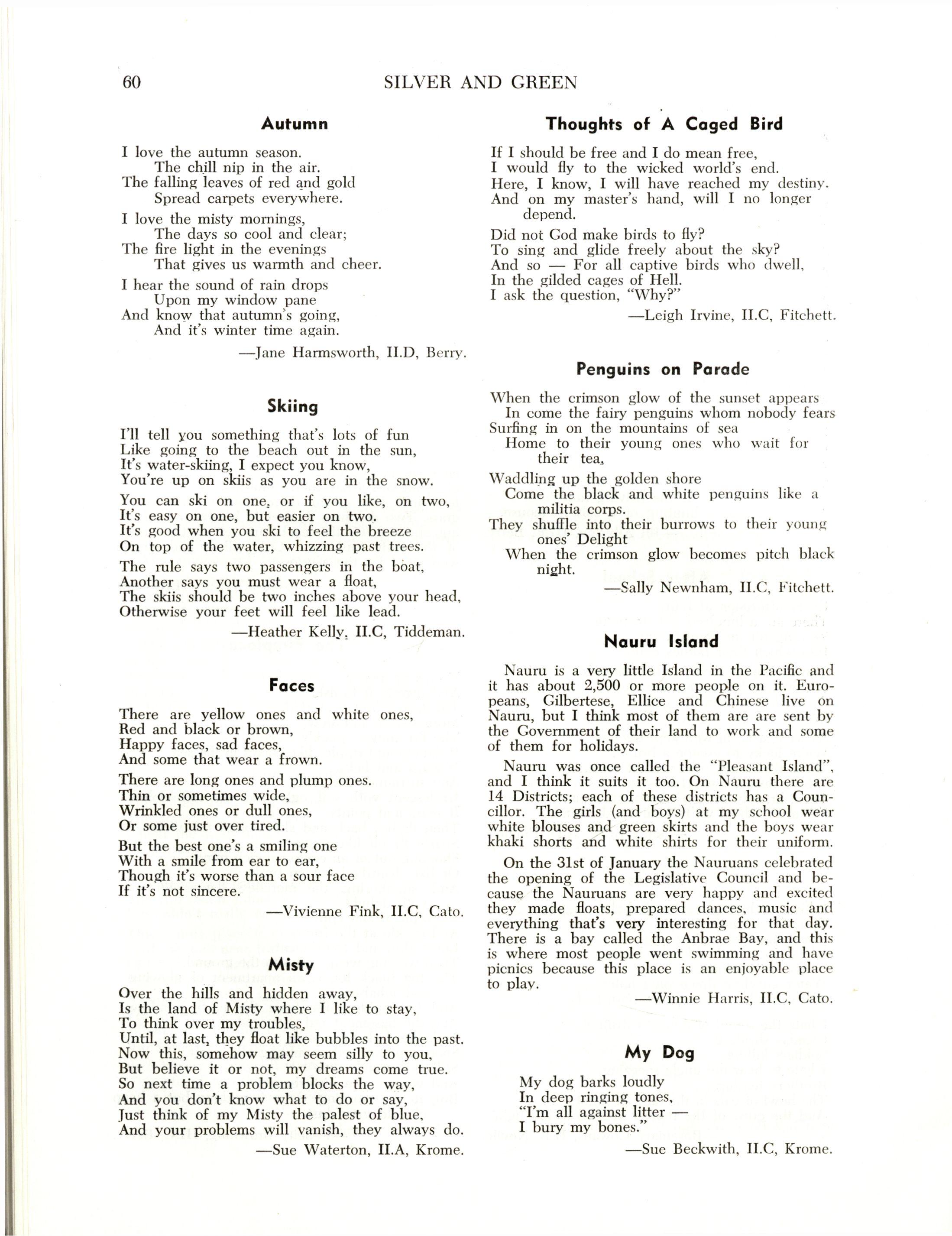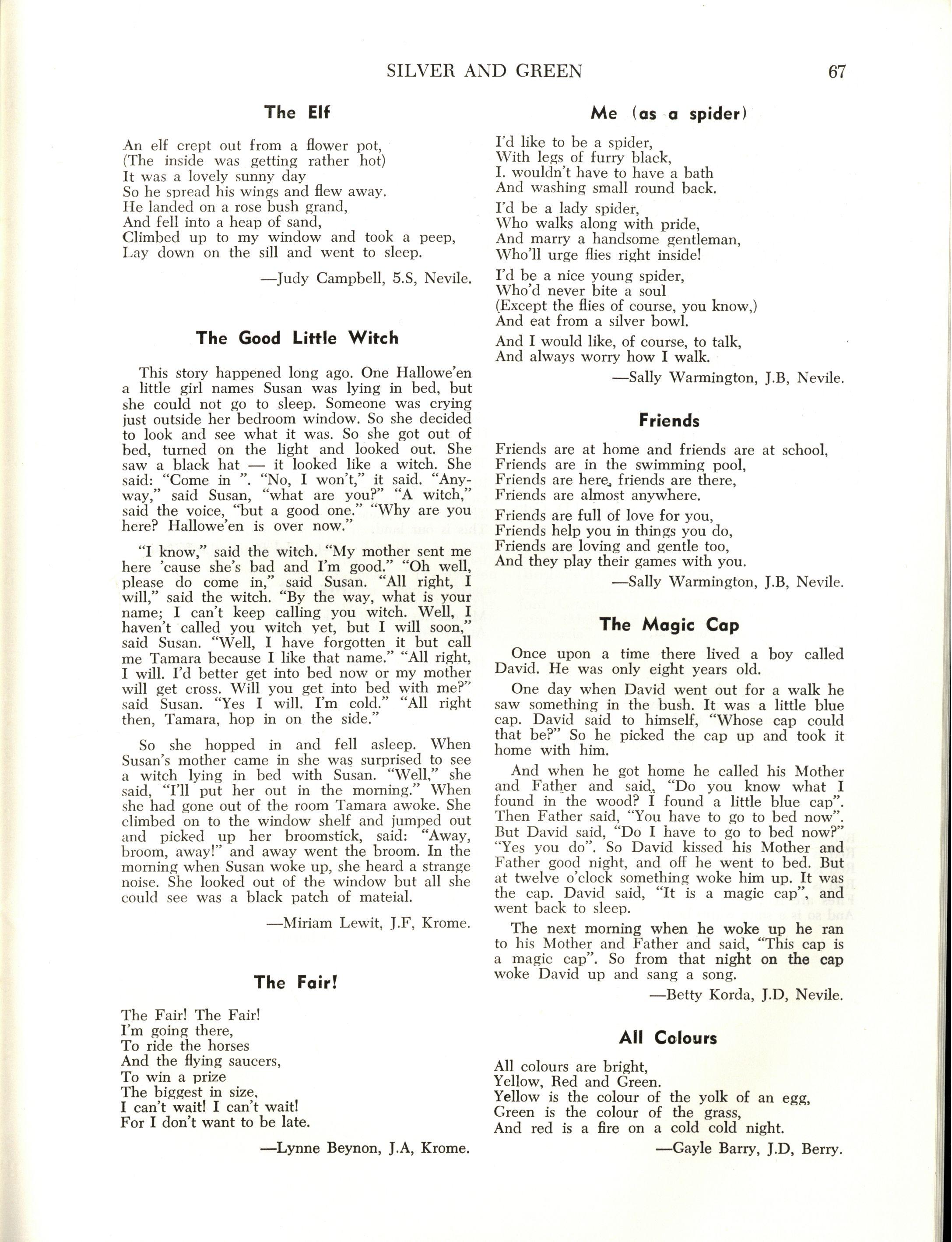 Jenny was a friendly happy person Her talents were many and varied Two of her poems appeared in "Silver and Green", and with her vivid imagination she was able to compose rhythmic, rhyming poems on the spot and set them to music She was a gifted artist