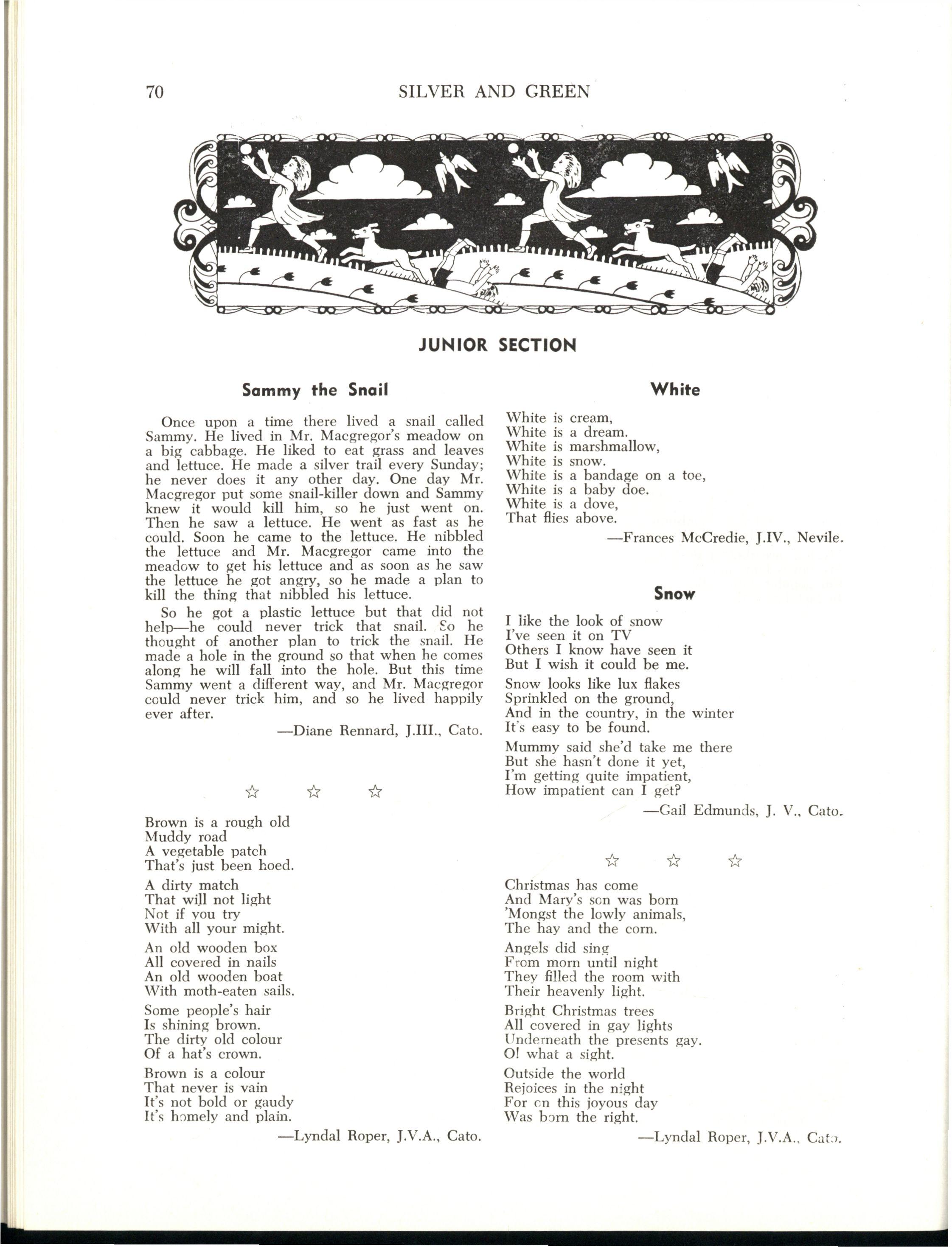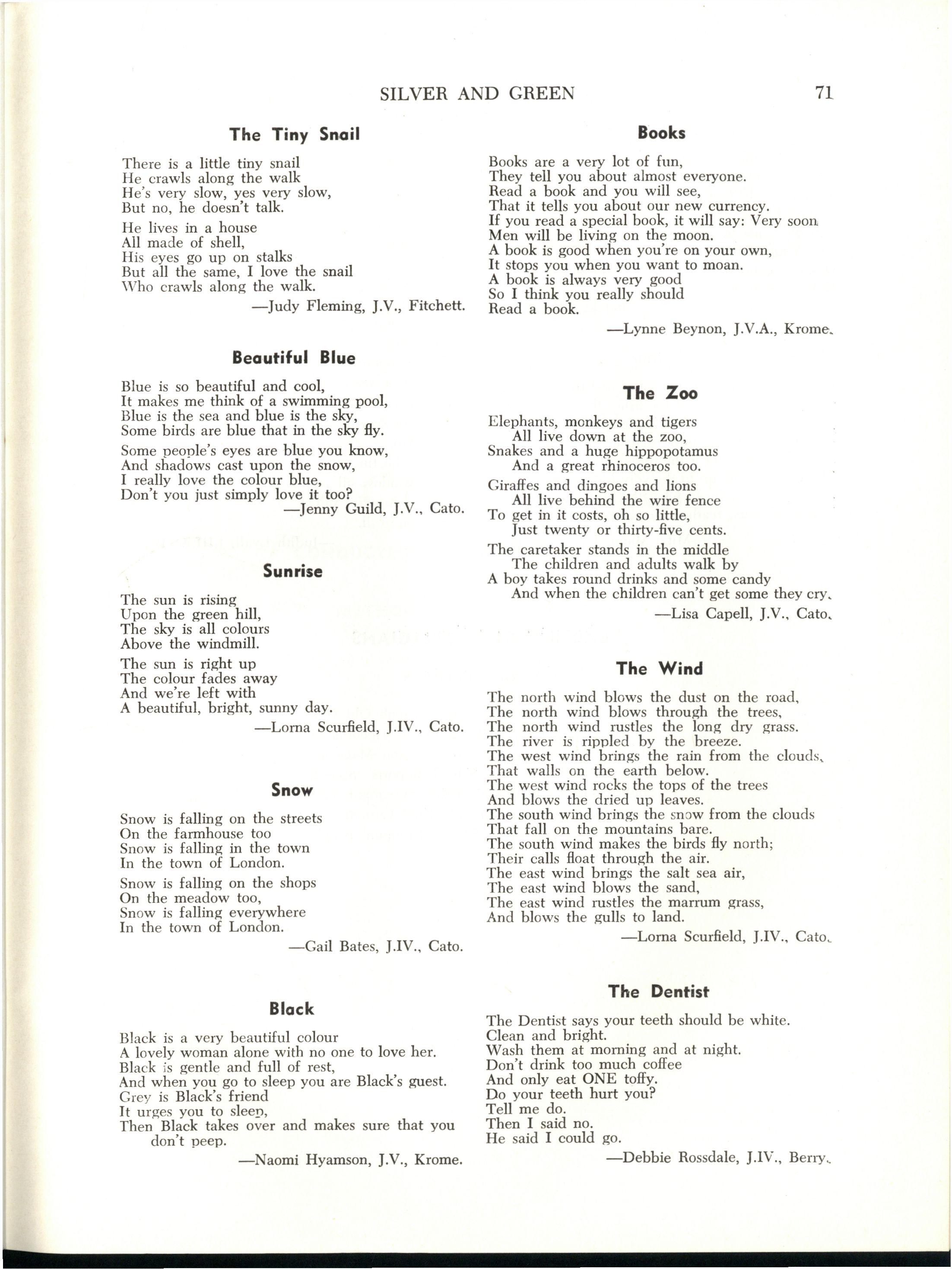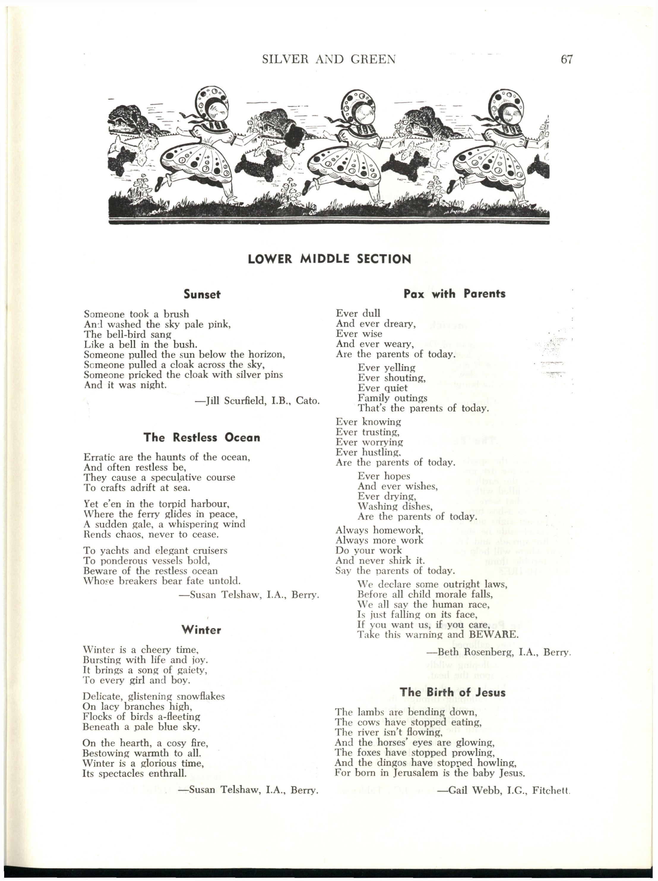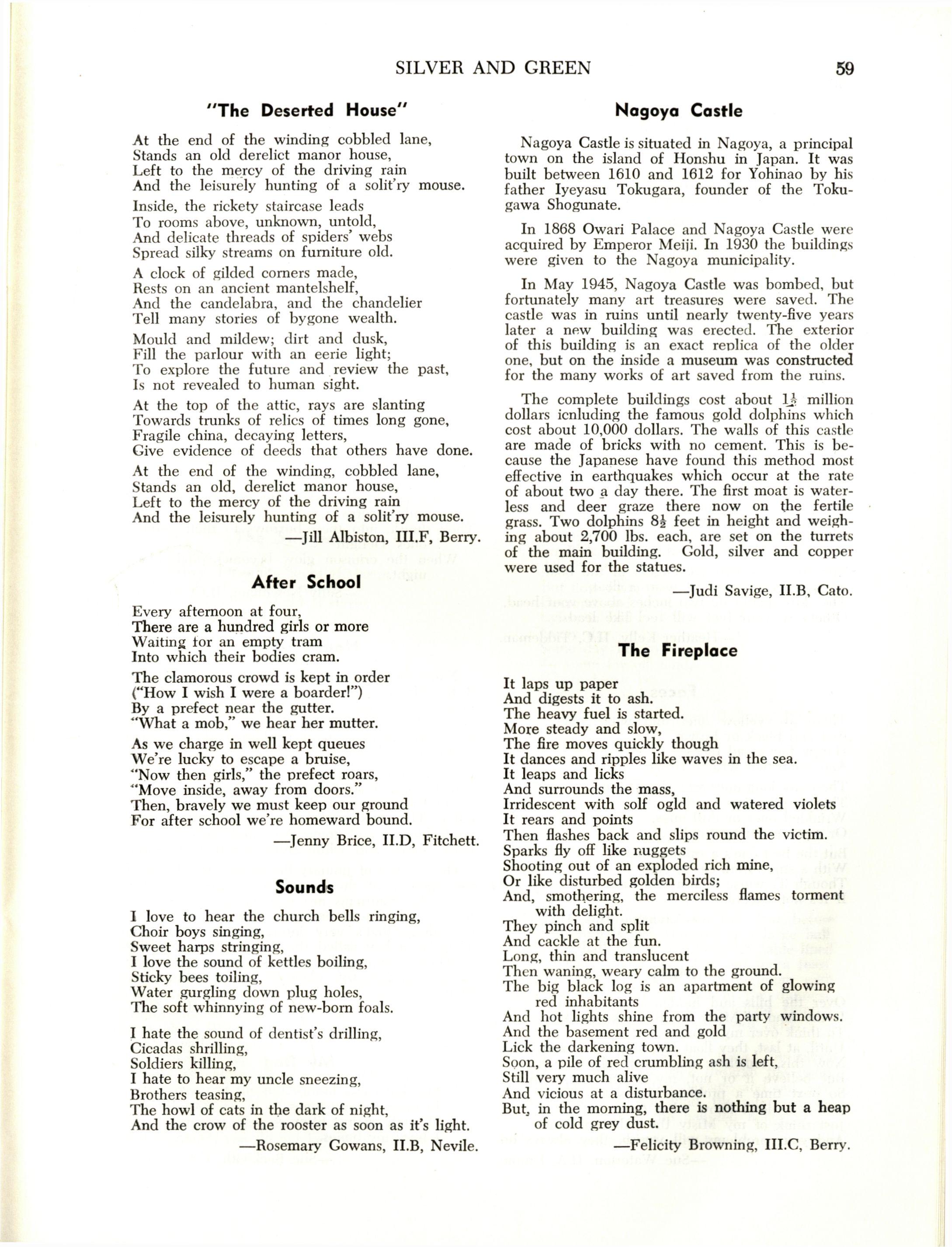 Jenny was a friendly happy person Her talents were many and varied Two of her poems appeared in "Silver and Green", and with her vivid imagination she was able to compose rhythmic, rhyming poems on the spot and set them to music She was a gifted artist