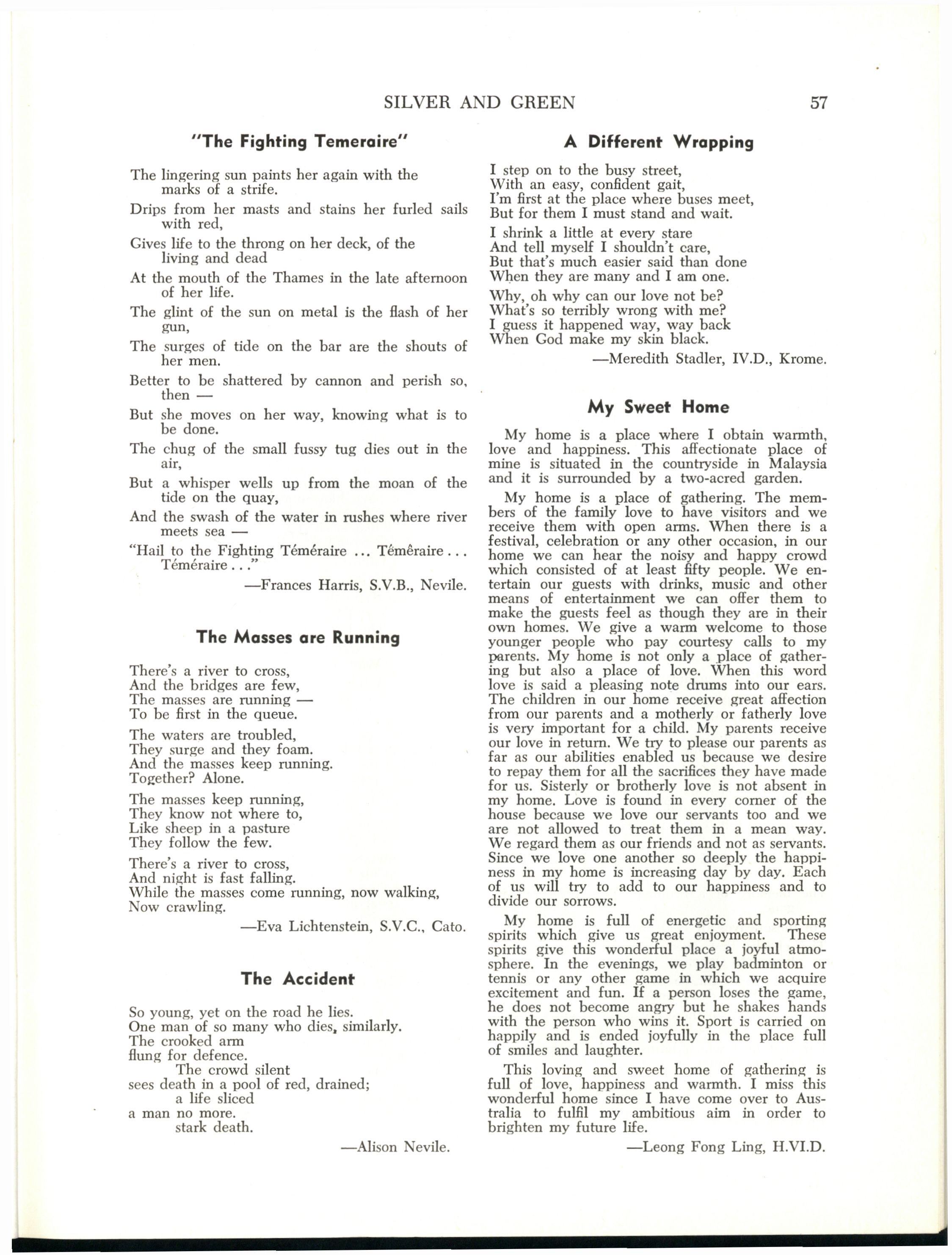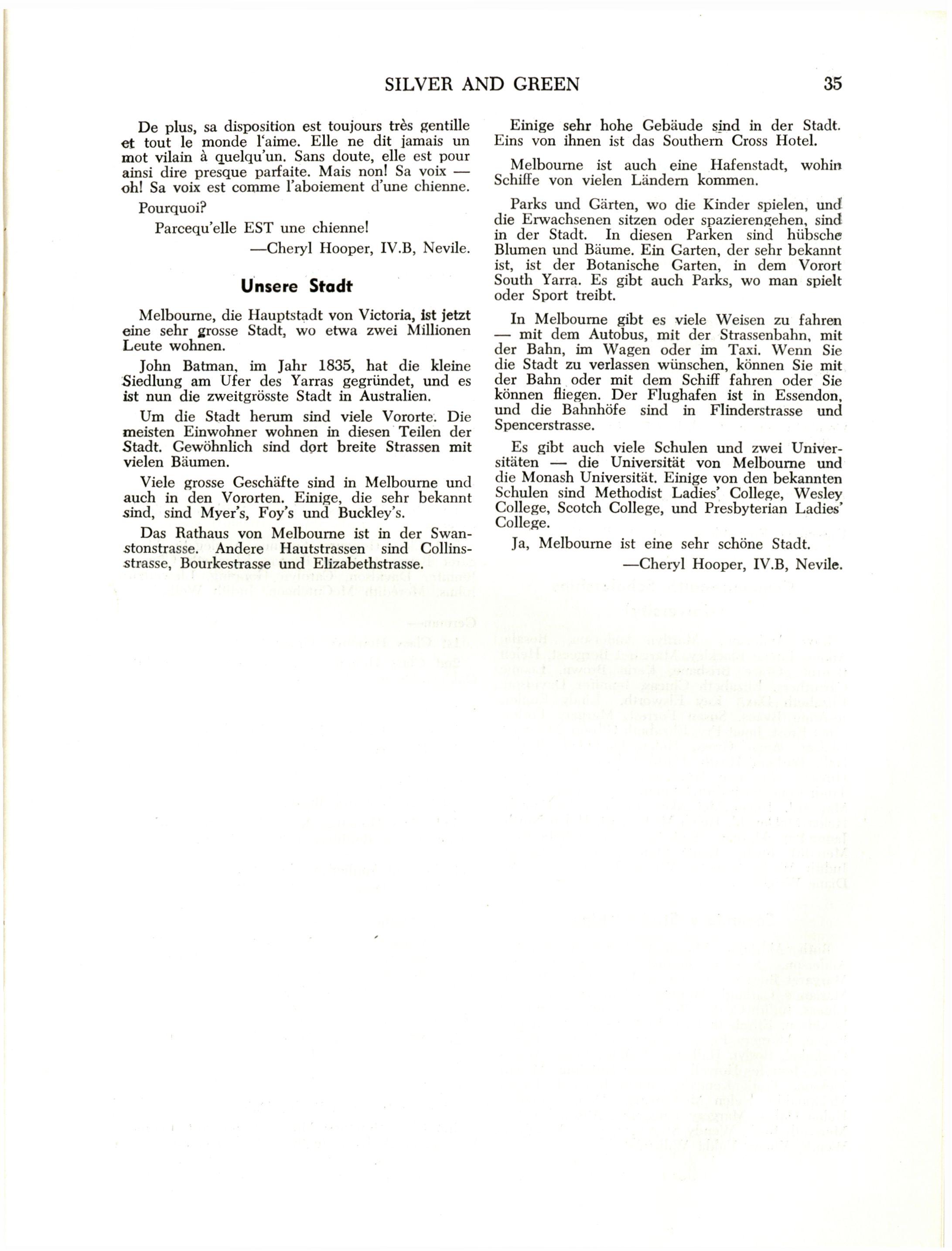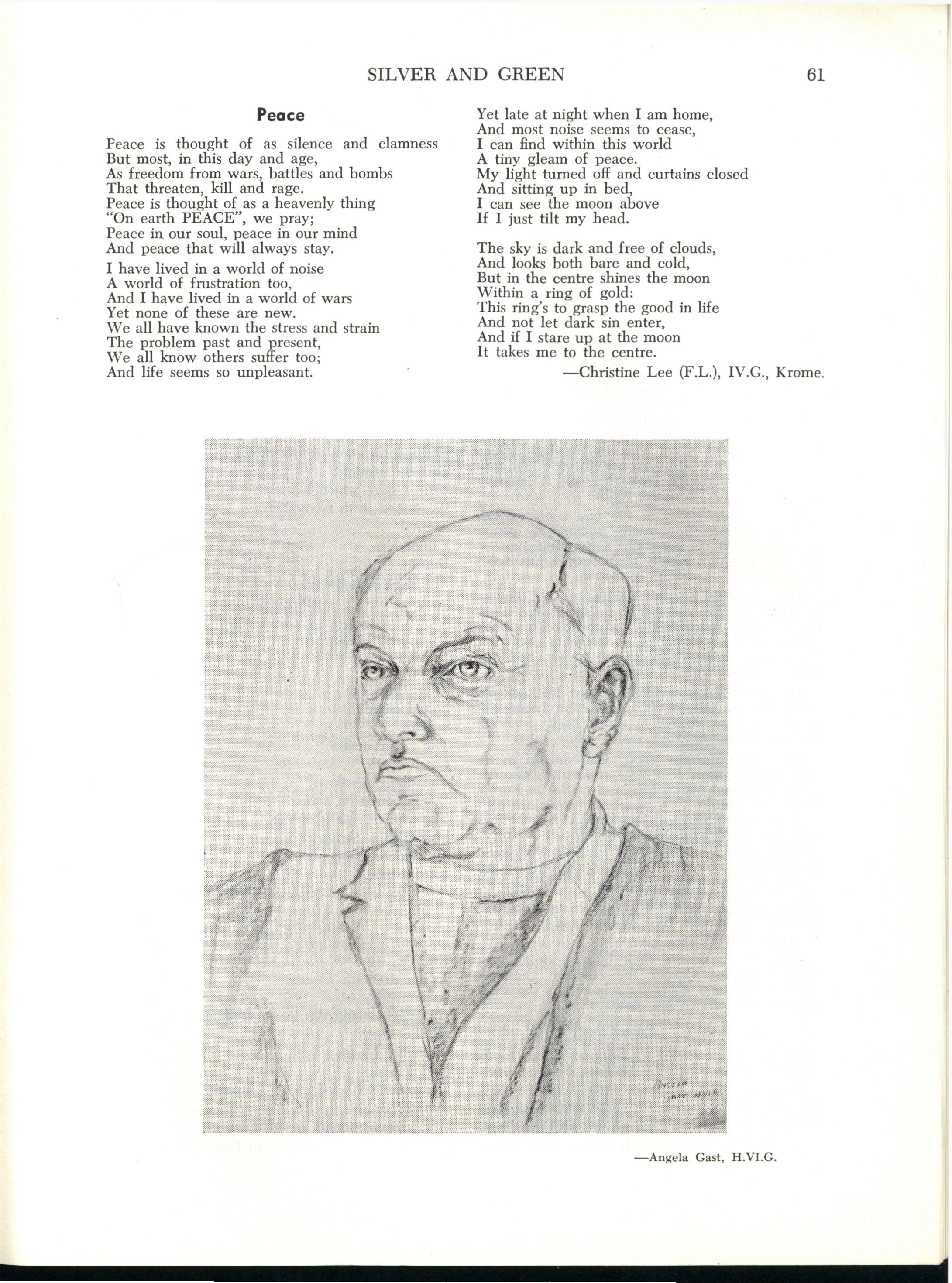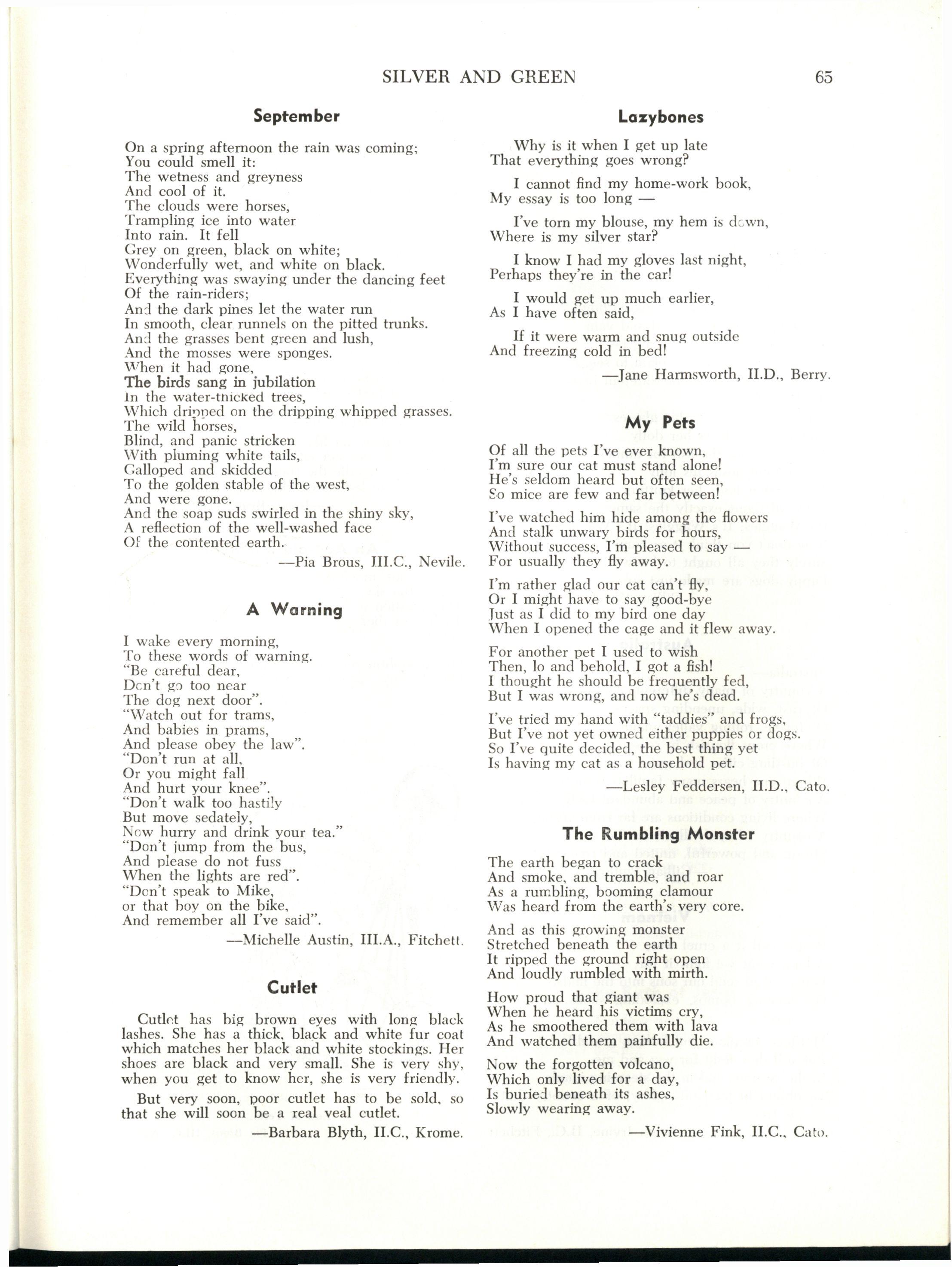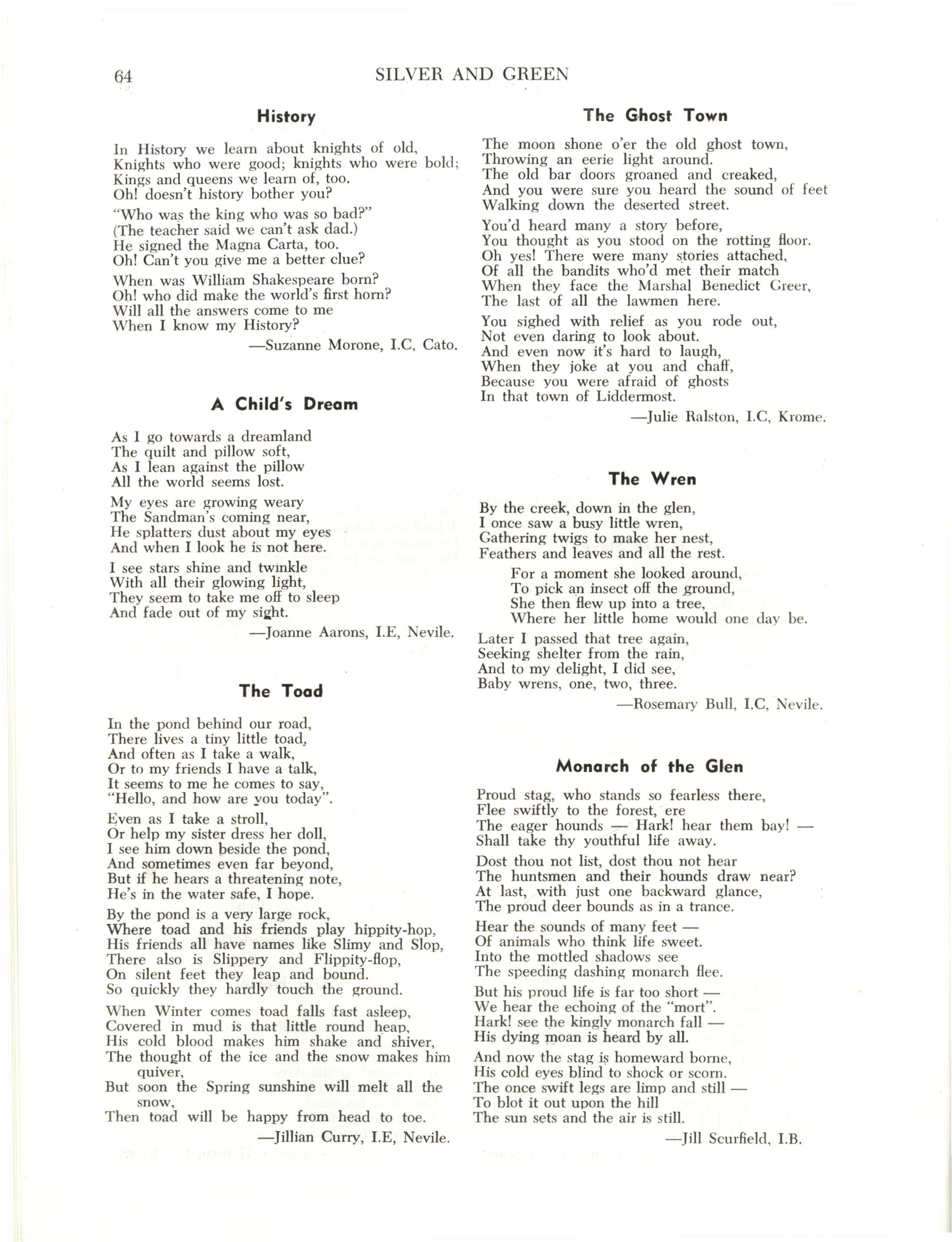 Jenny was a friendly happy person Her talents were many and varied Two of her poems appeared in "Silver and Green", and with her vivid imagination she was able to compose rhythmic, rhyming poems on the spot and set them to music She was a gifted artist