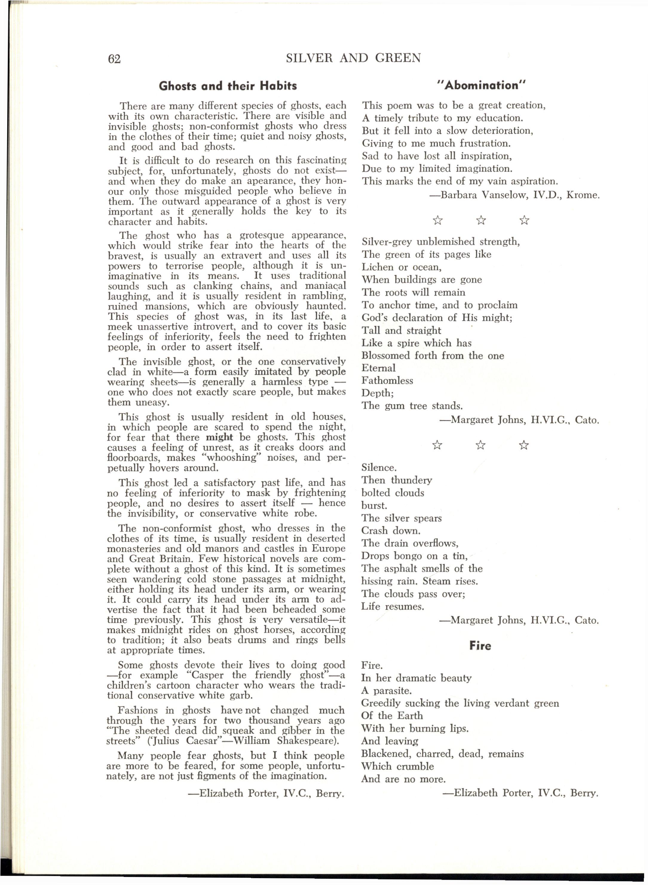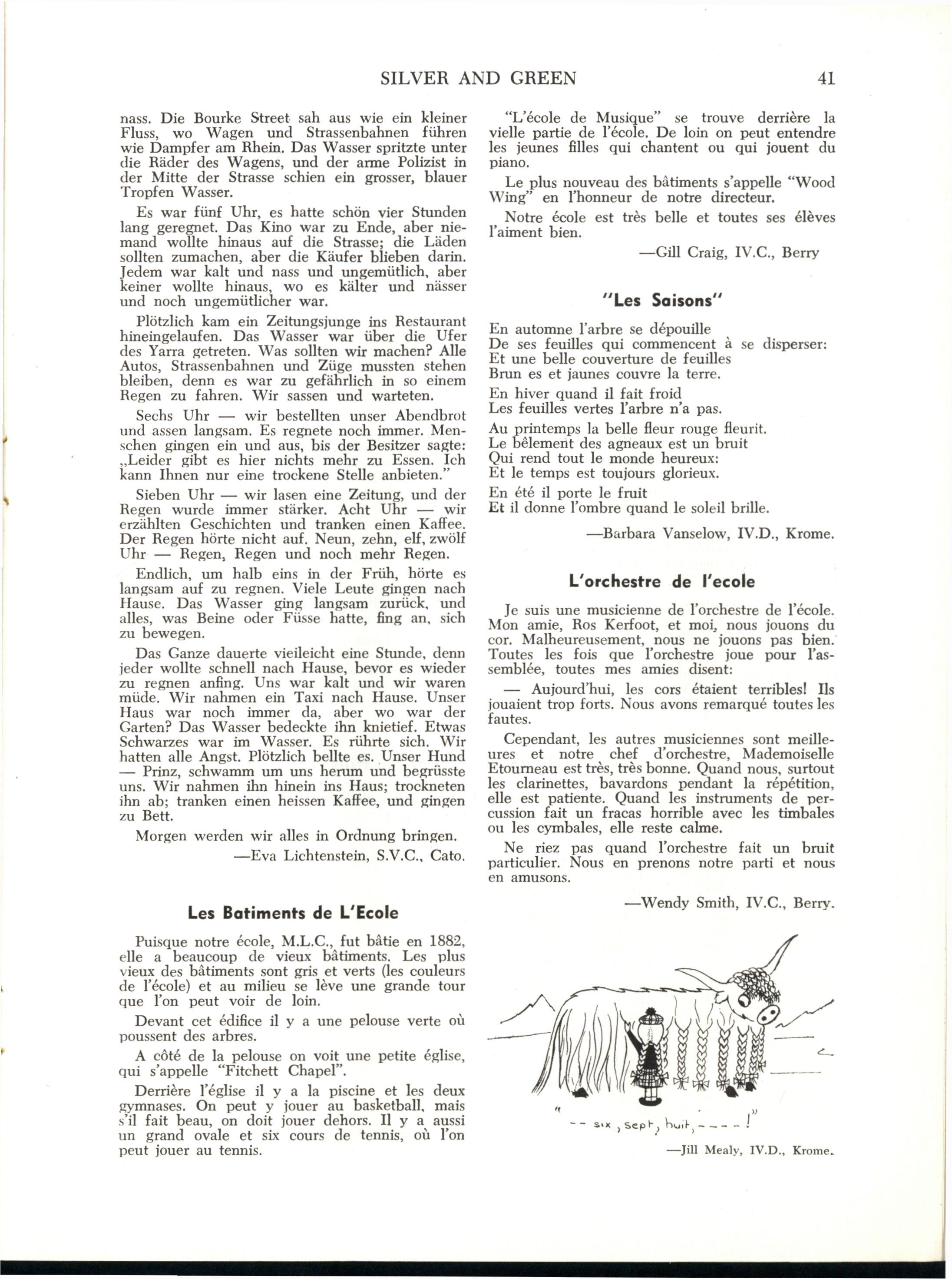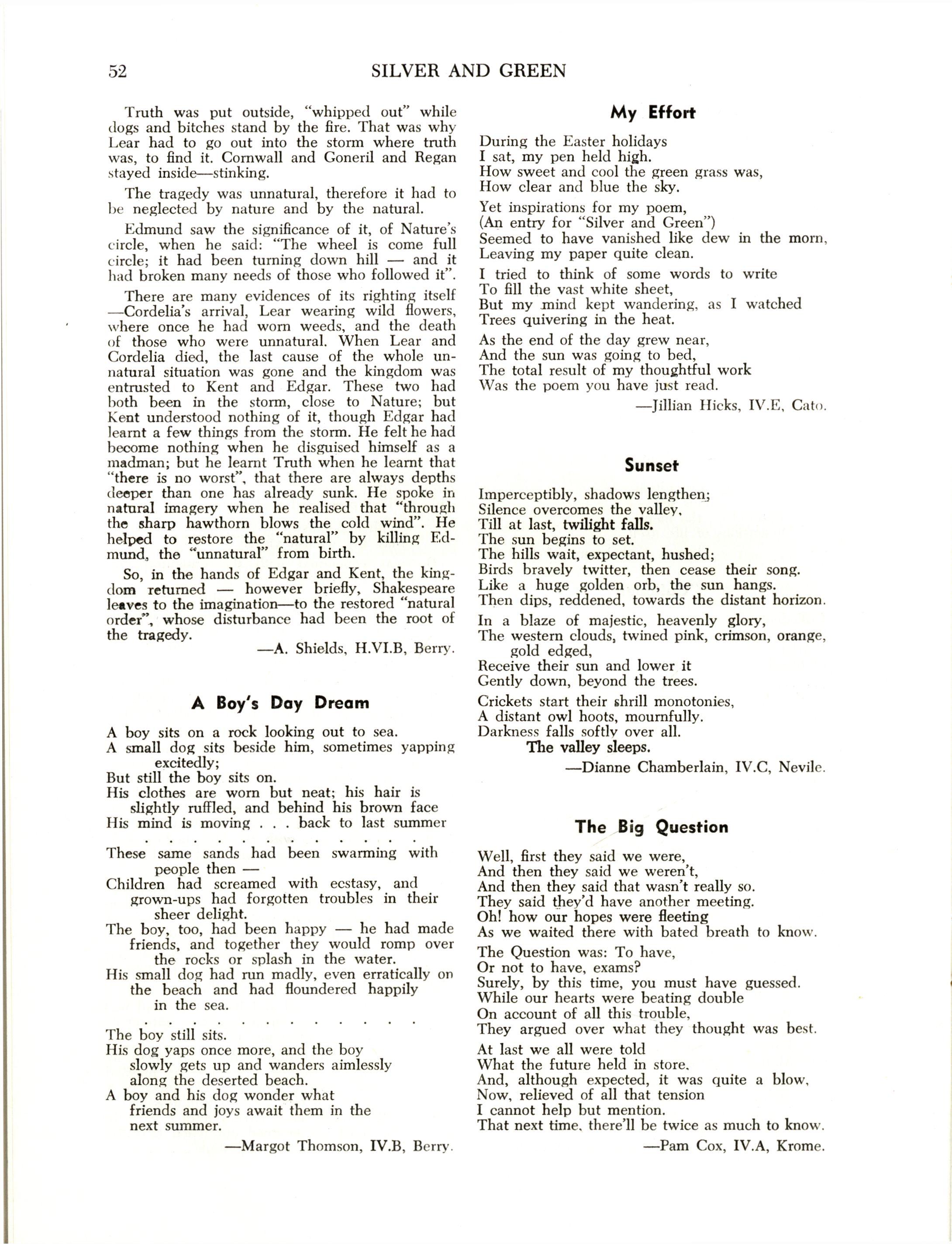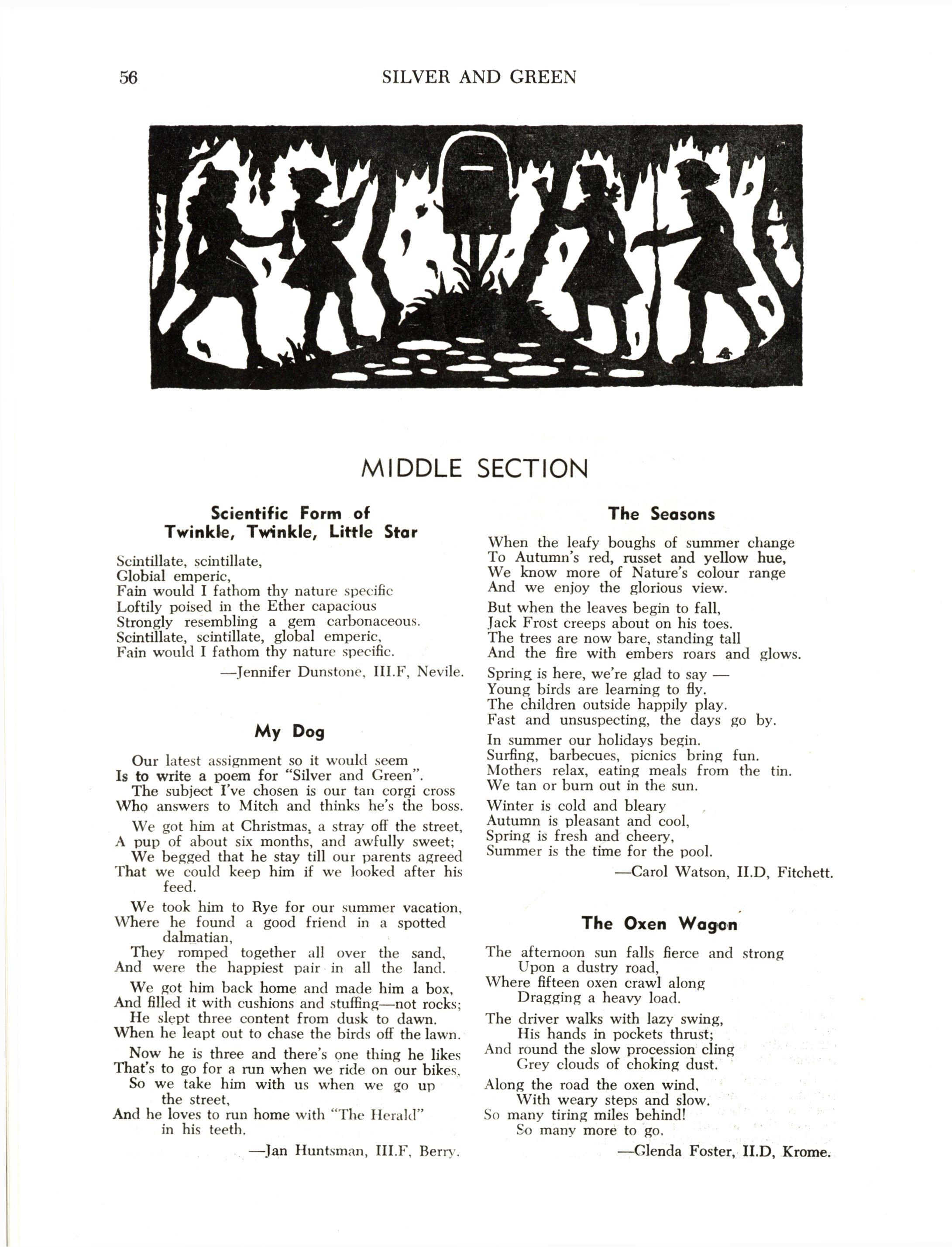 Jenny was a friendly happy person Her talents were many and varied Two of her poems appeared in "Silver and Green", and with her vivid imagination she was able to compose rhythmic, rhyming poems on the spot and set them to music She was a gifted artist