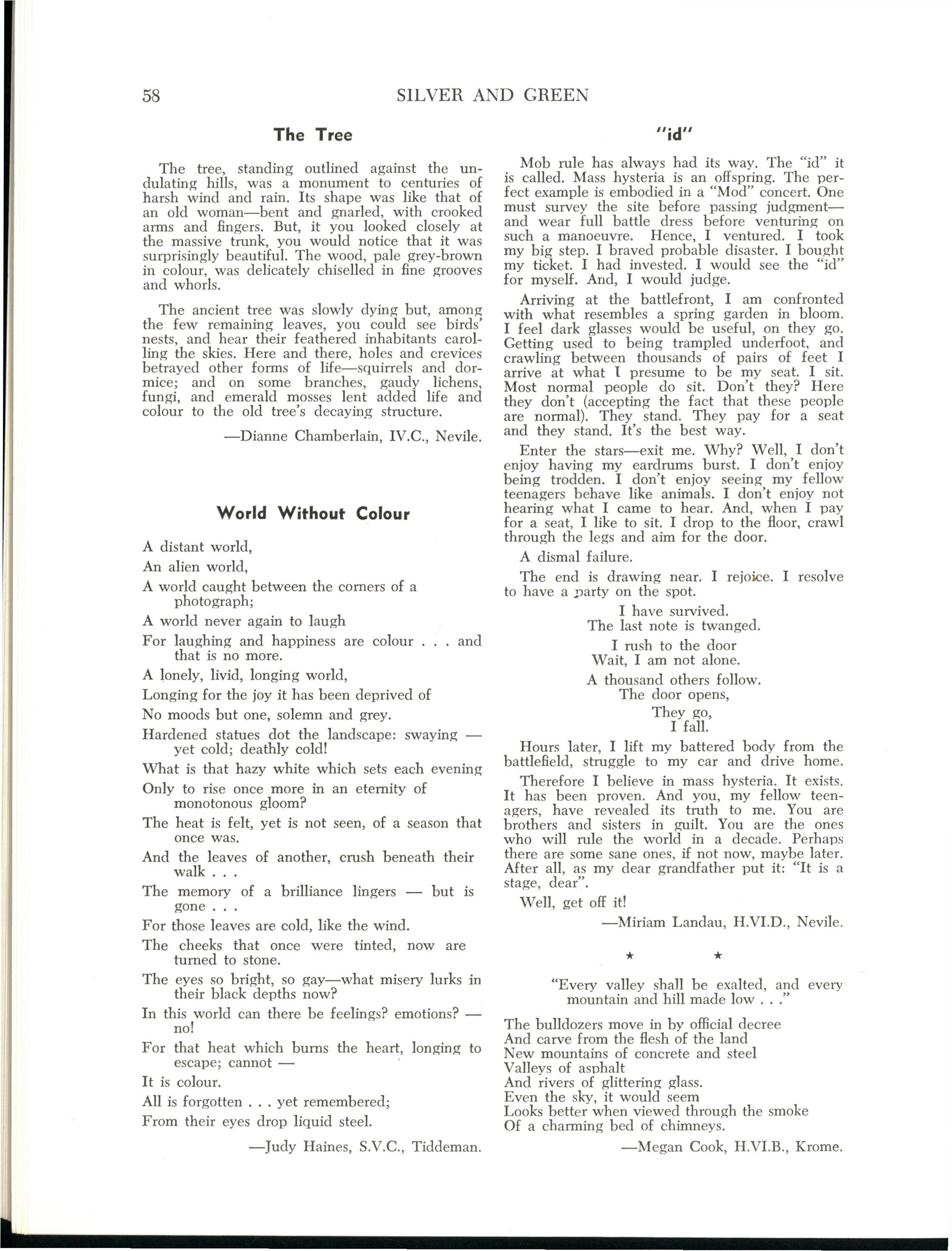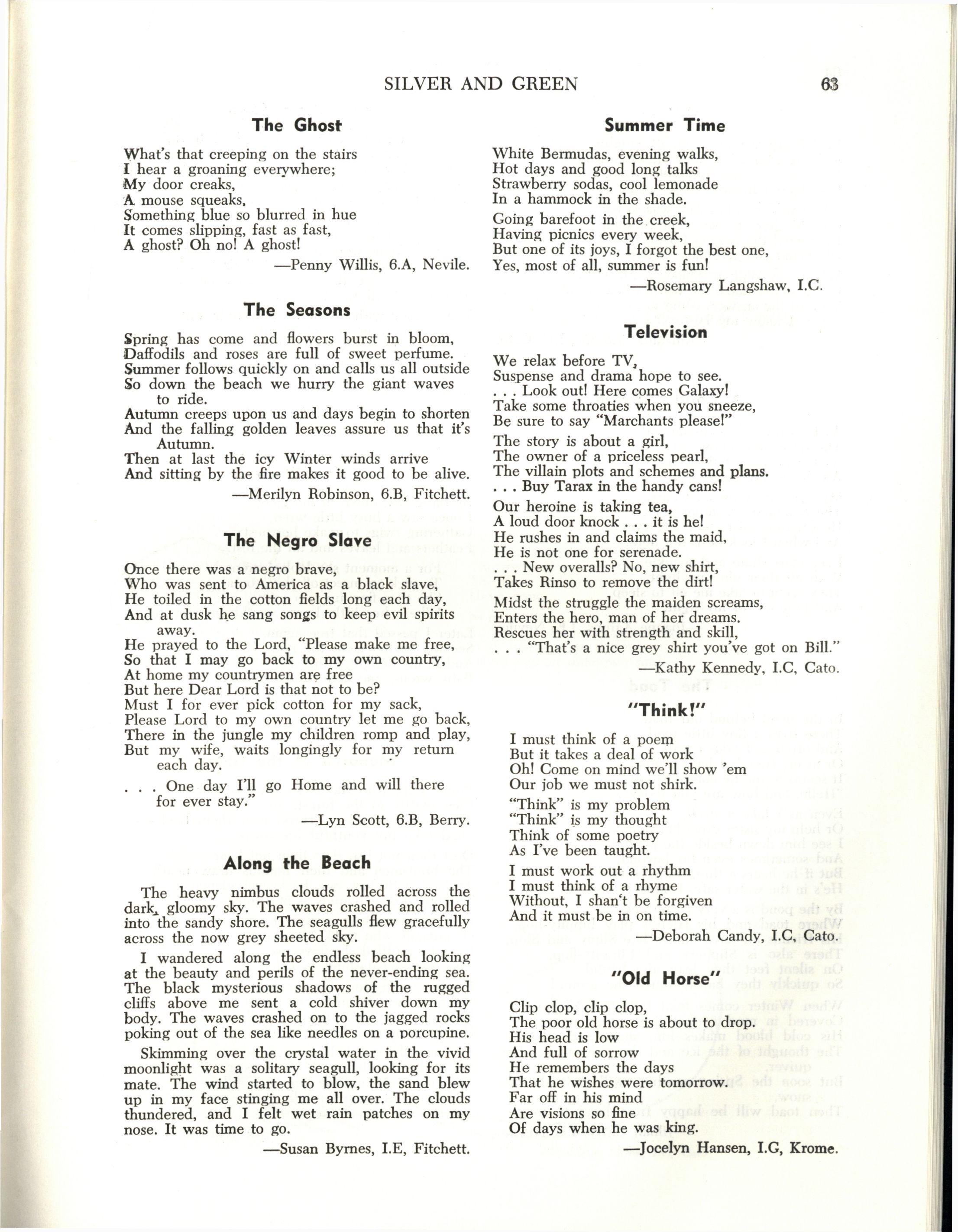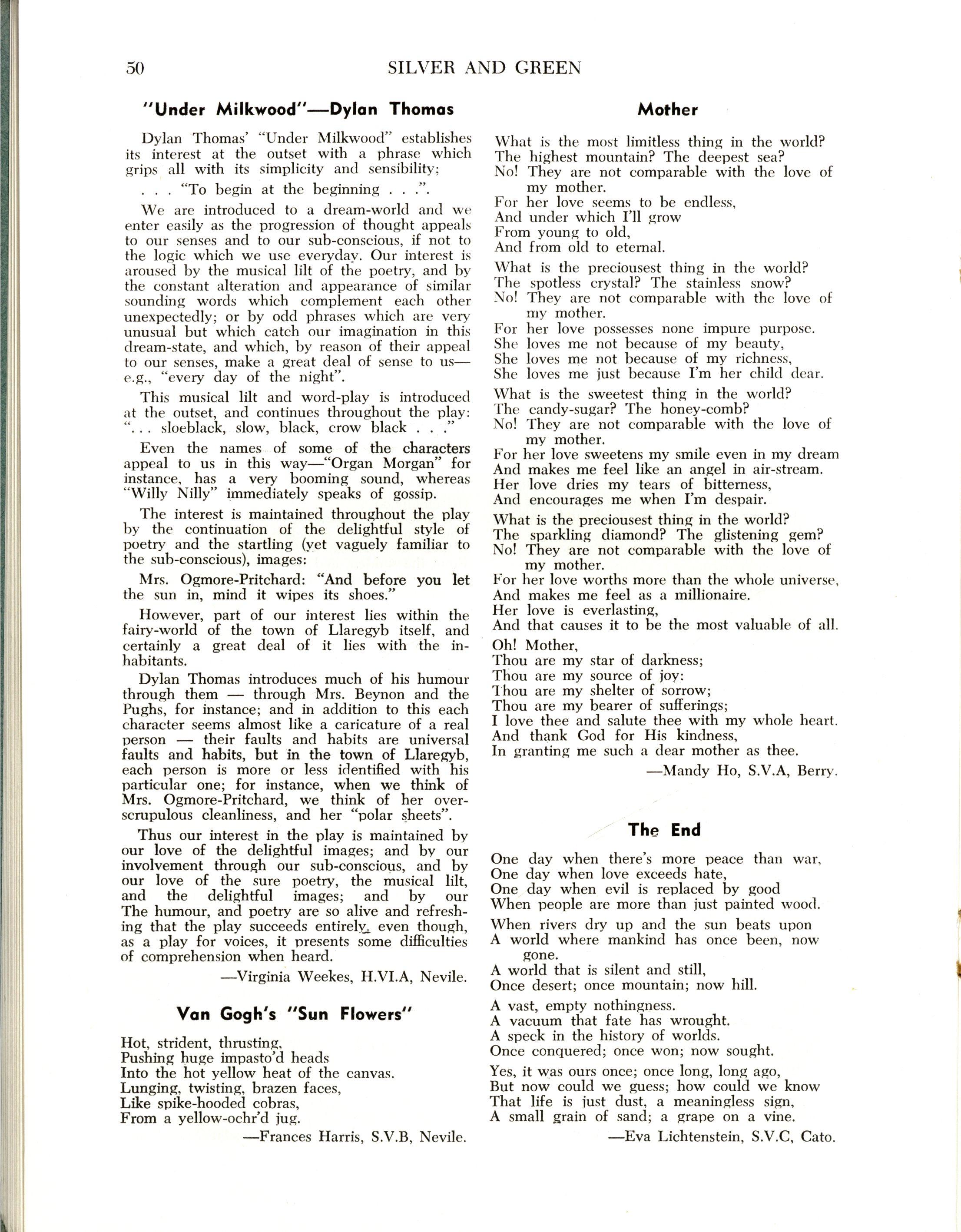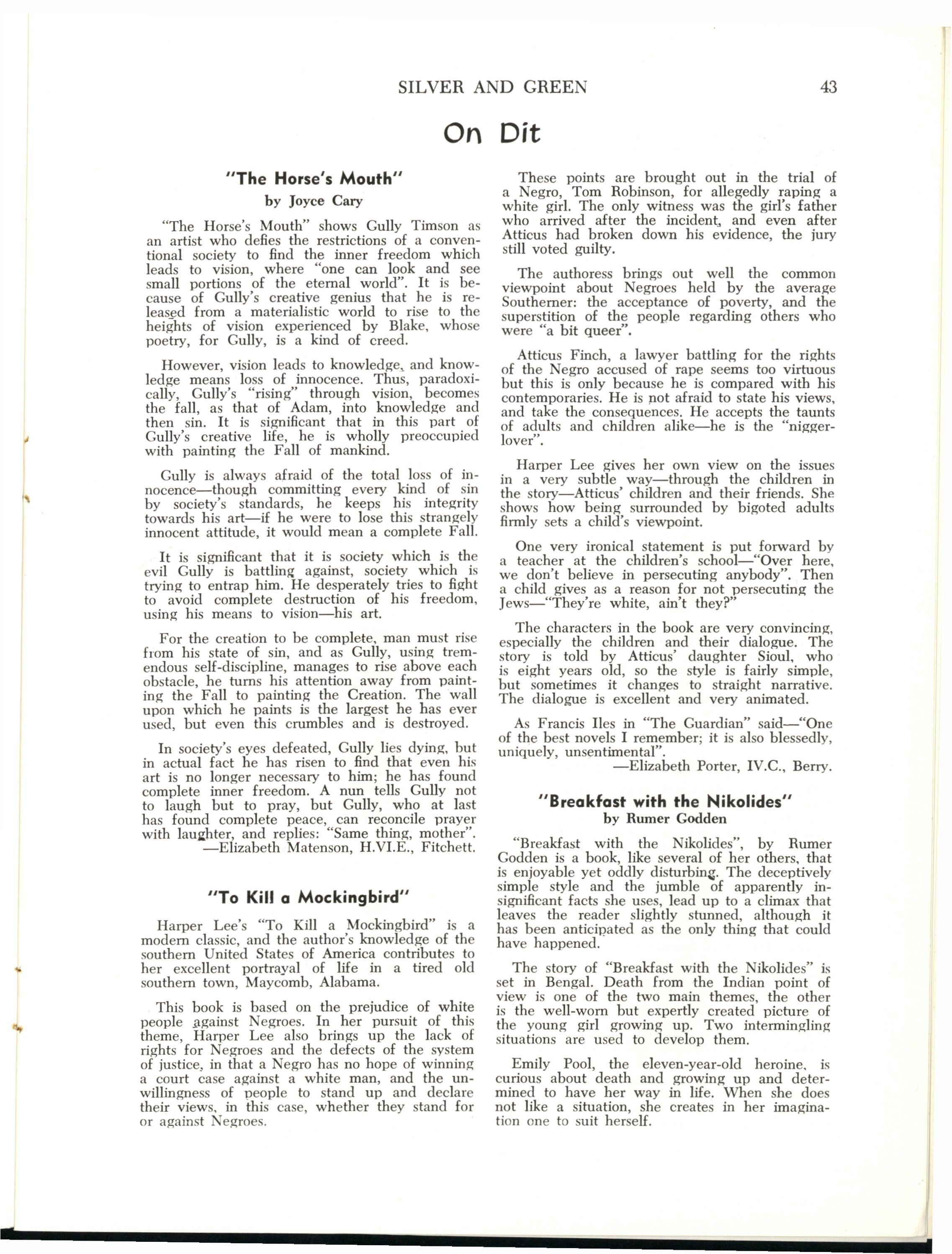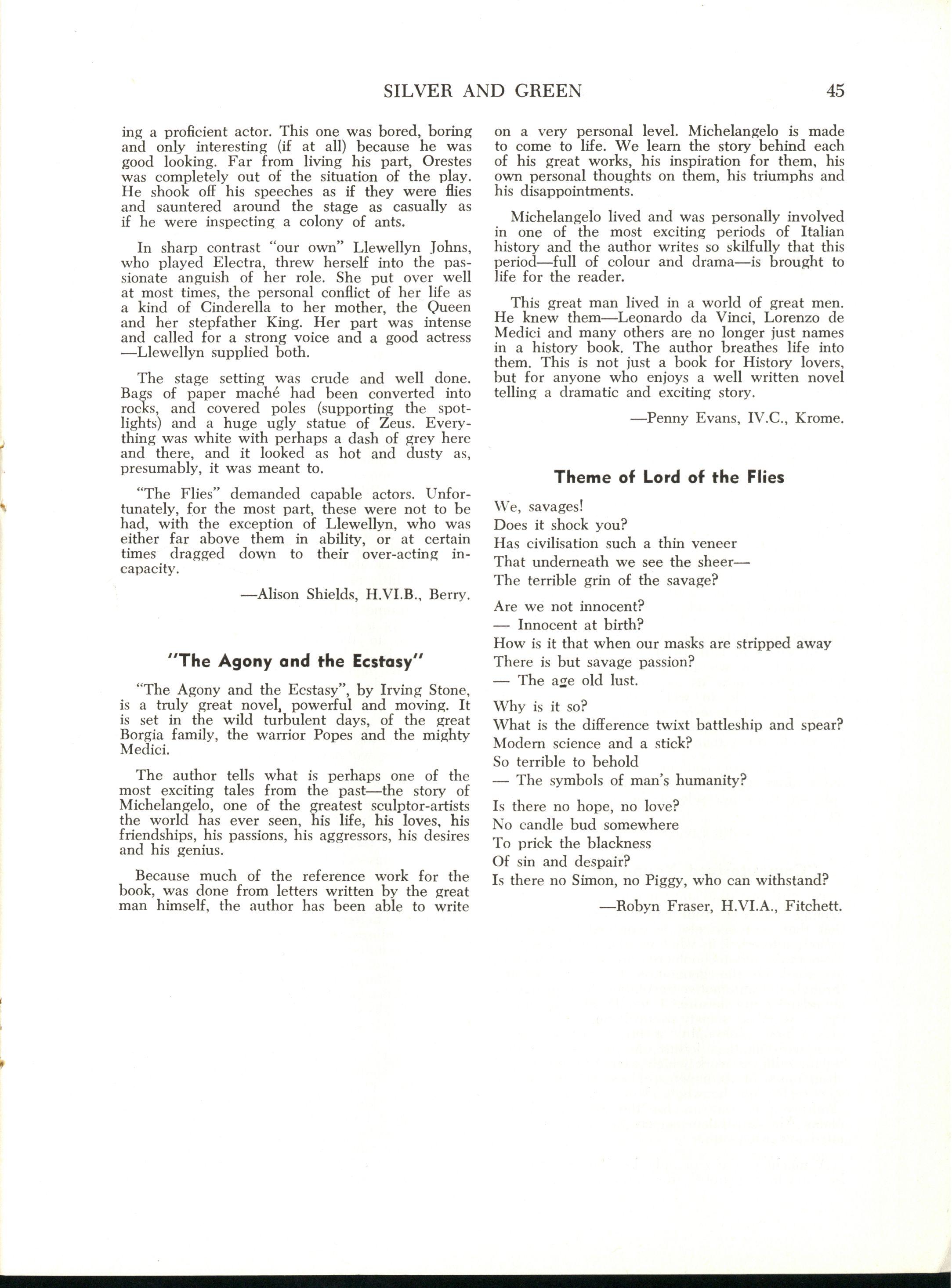 Jenny was a friendly happy person Her talents were many and varied Two of her poems appeared in "Silver and Green", and with her vivid imagination she was able to compose rhythmic, rhyming poems on the spot and set them to music She was a gifted artist