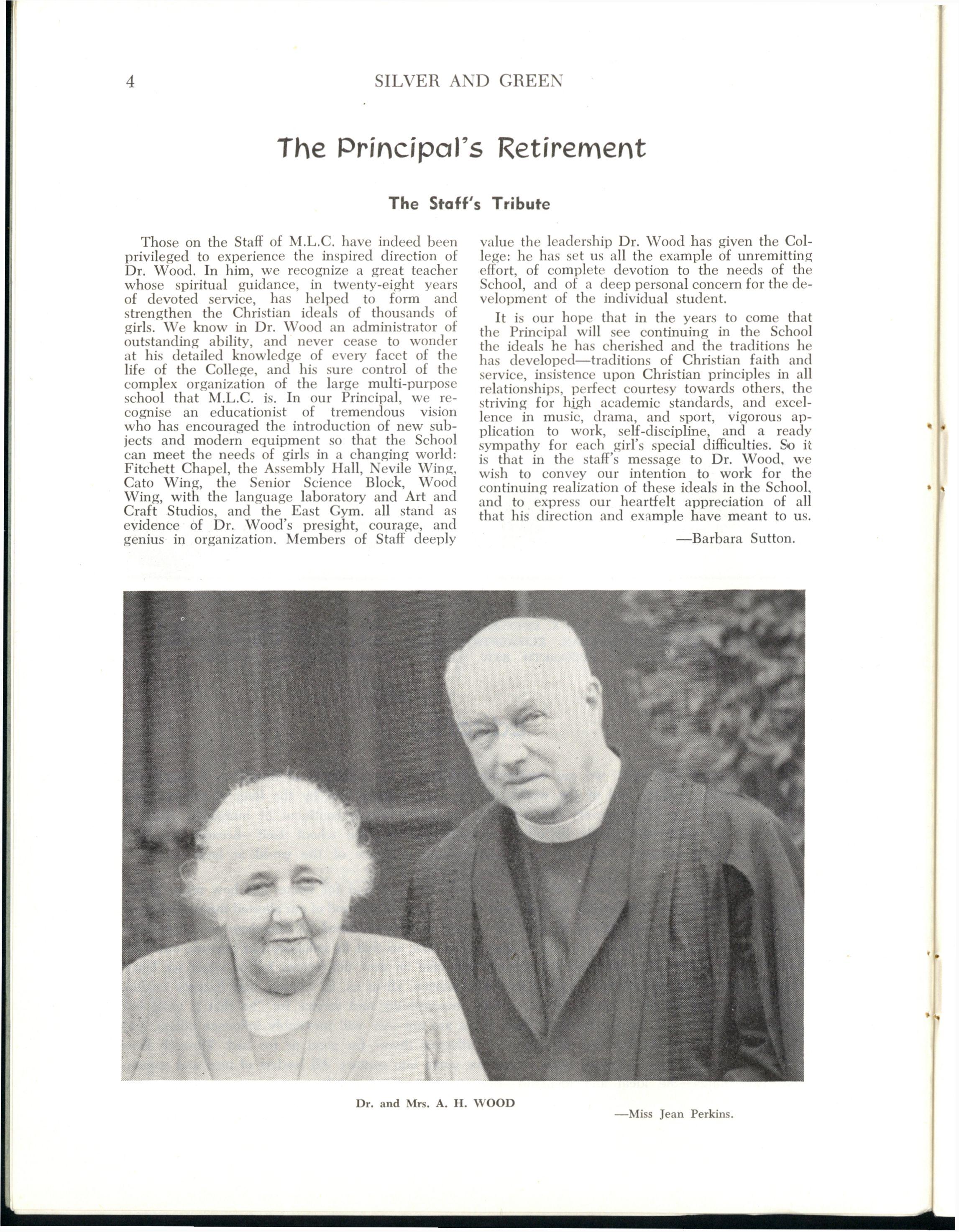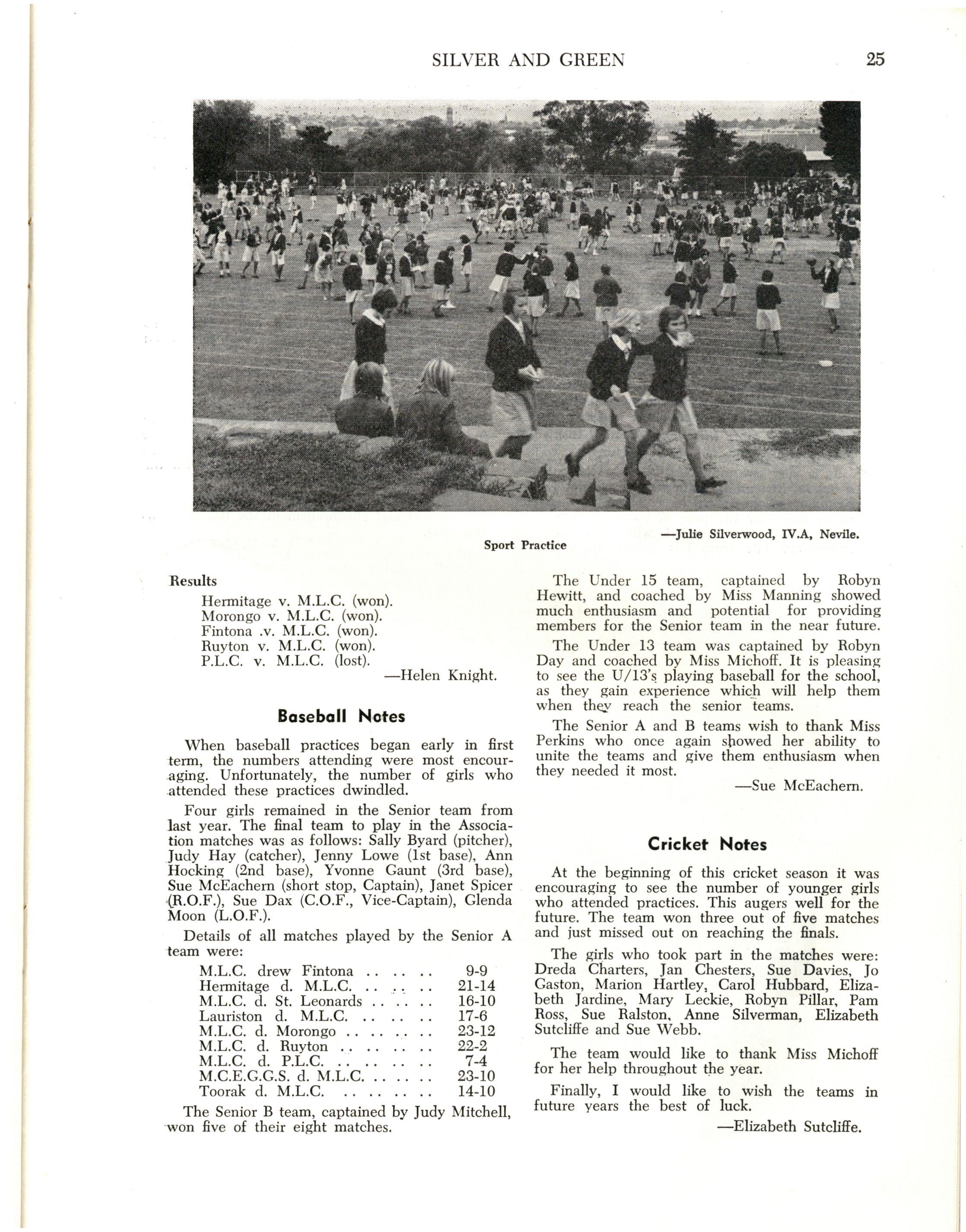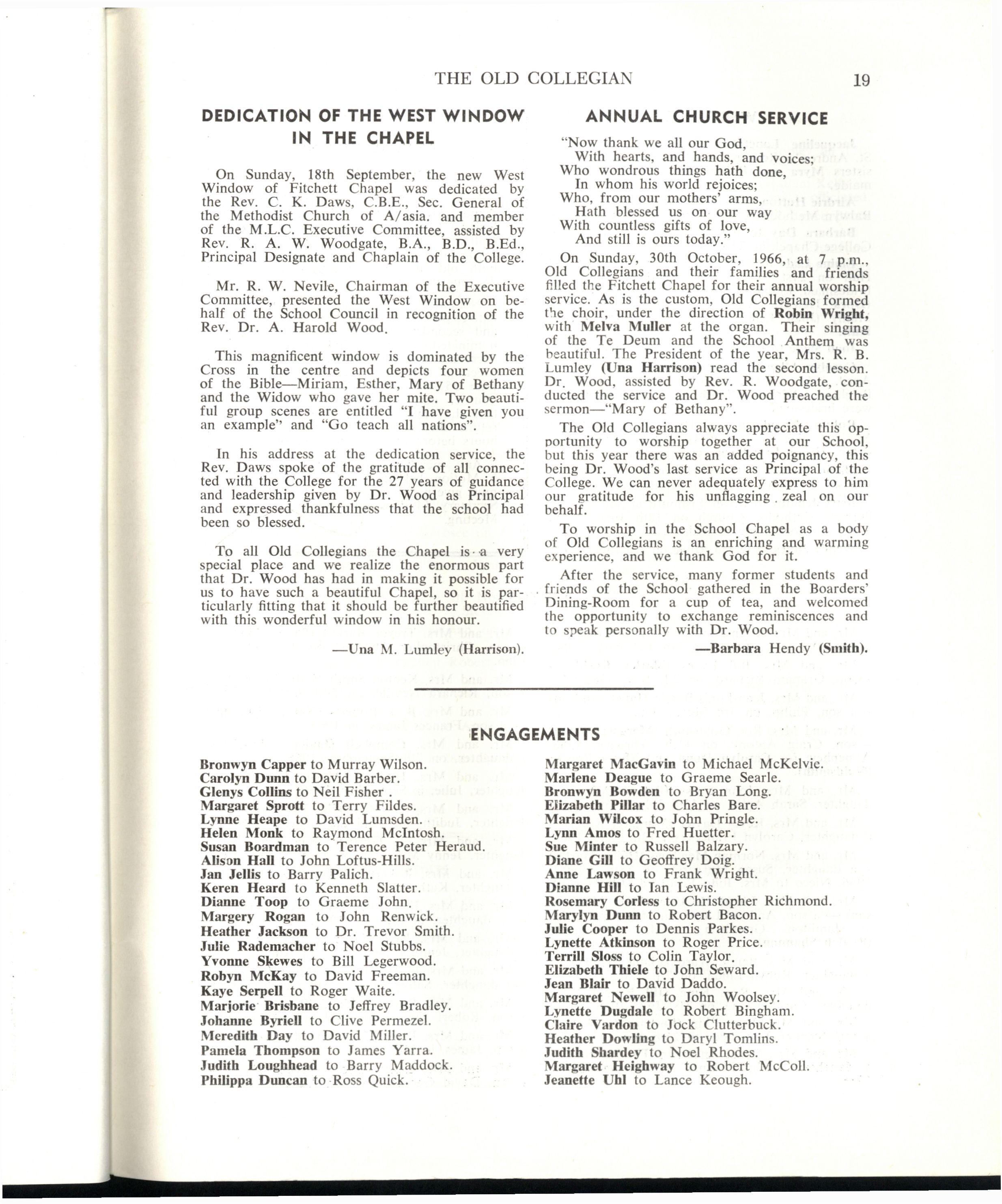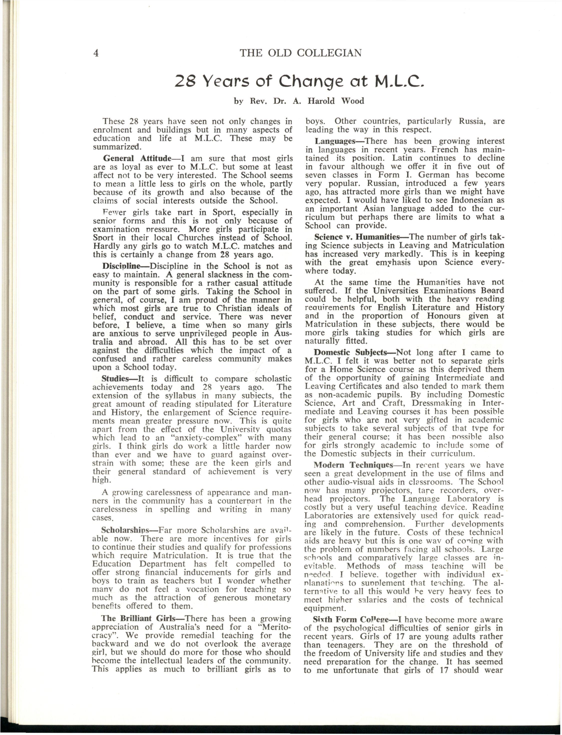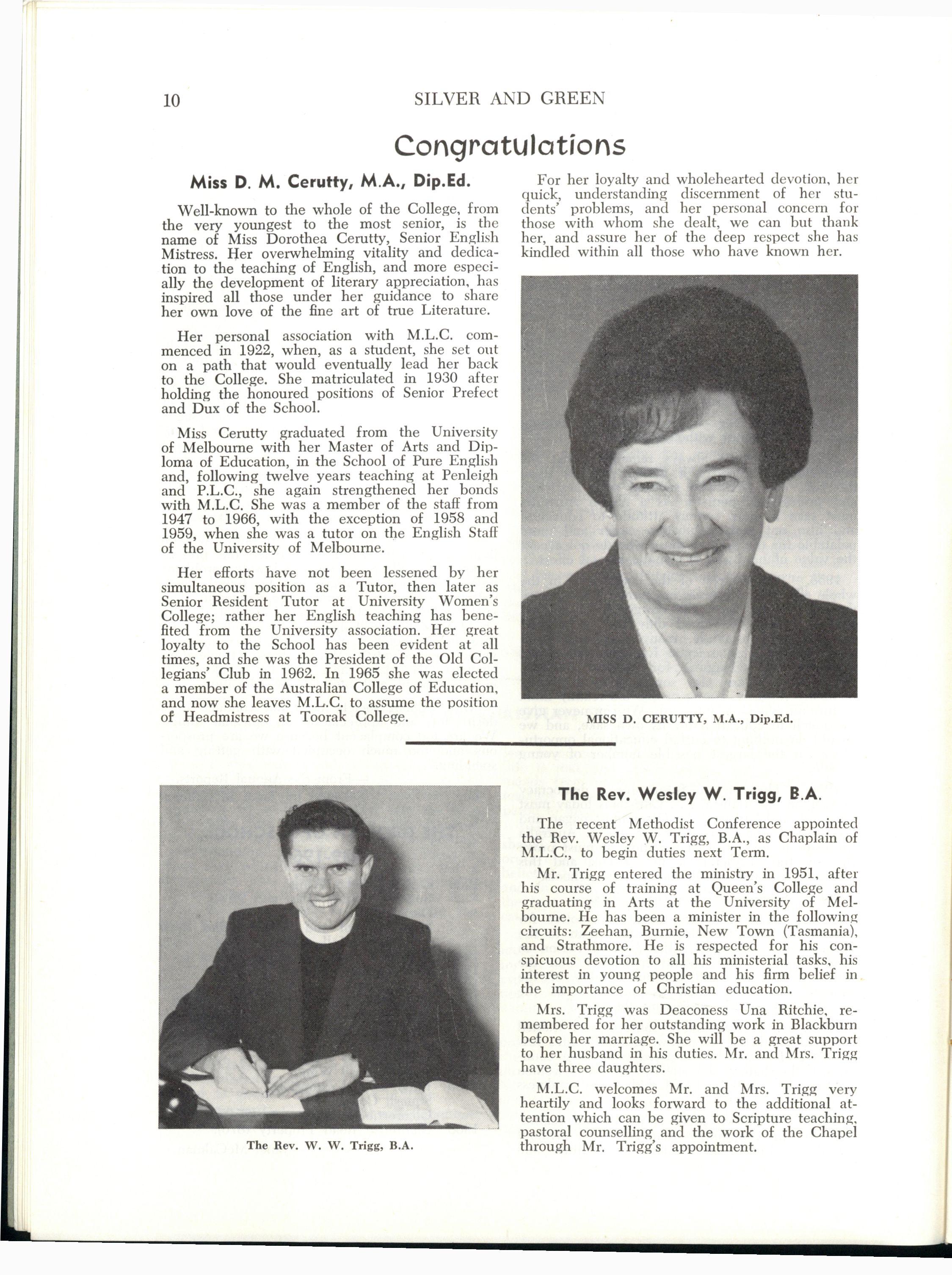 We were delighted to welcome Mr and Mrs Woodgate to M.L.C at the beginning of this year Already Mr Woodgate is showing himself to be interested in many school activities, and we were especially pleased to see him ably participating in the staff baseball match early in first term This event also provided us the opportunity of seeing how well he had accomplished the task of acquainting himself with the teachers As our School Chaplain and in all other capacities, Mr Woodgate invites our trust and confidence