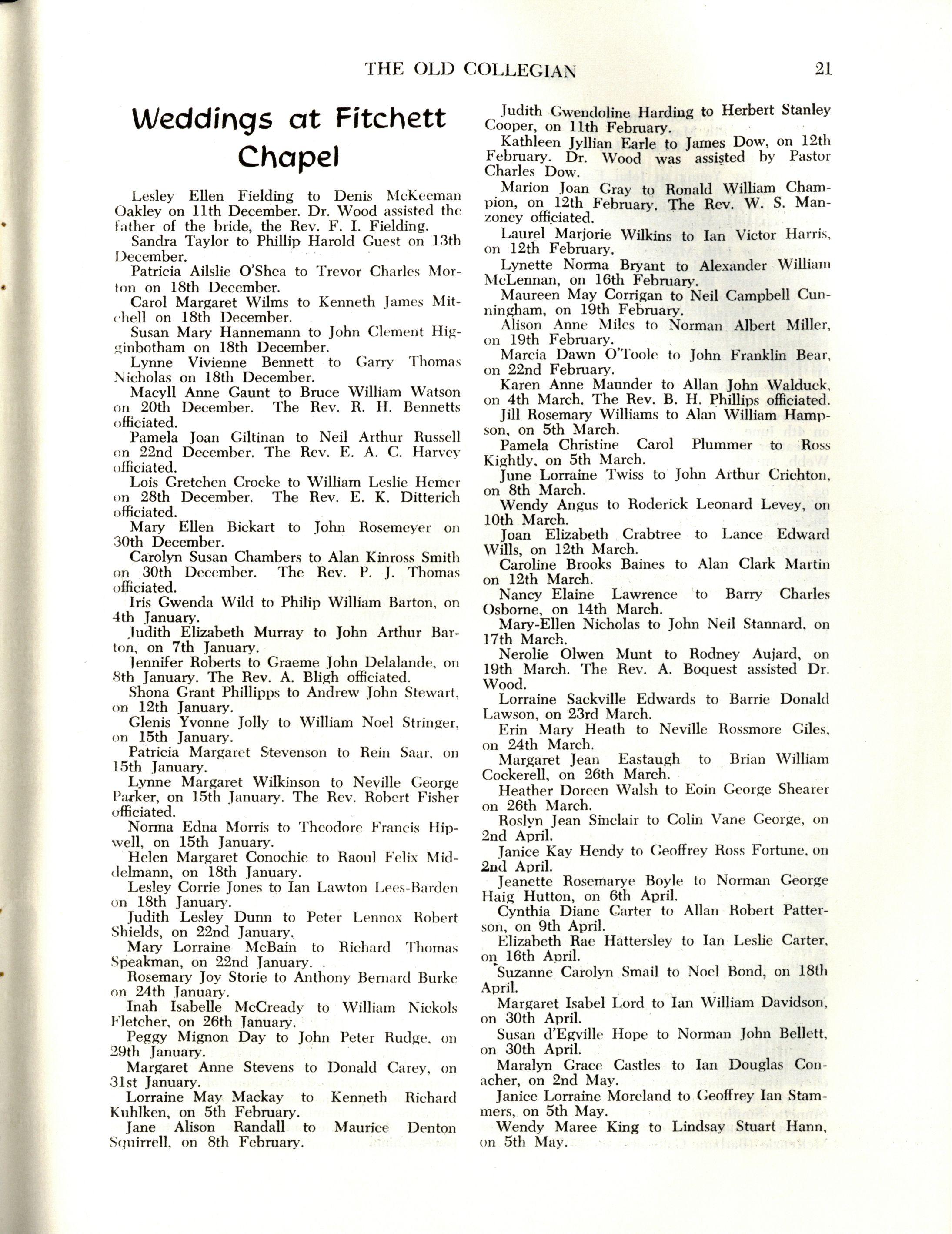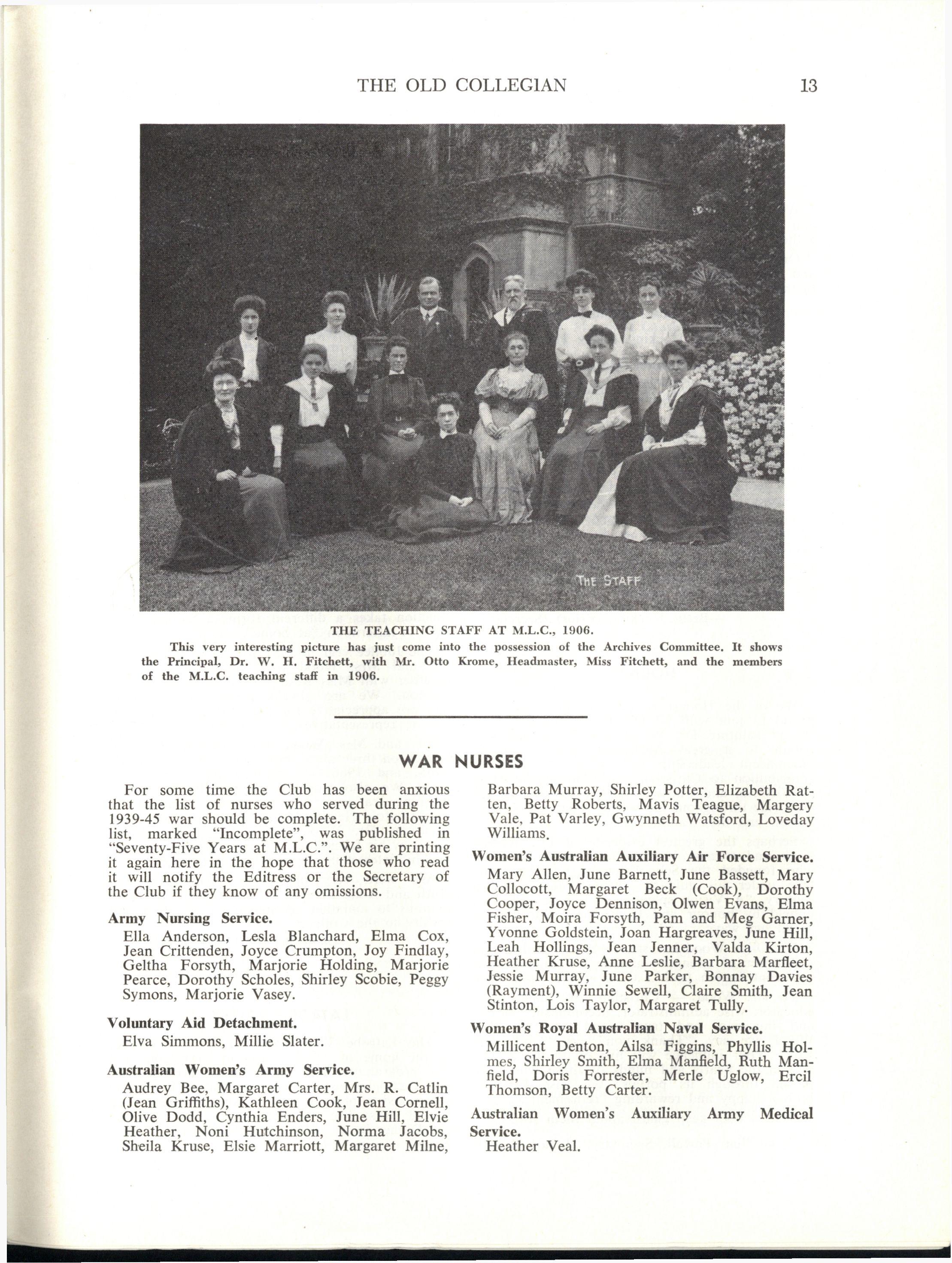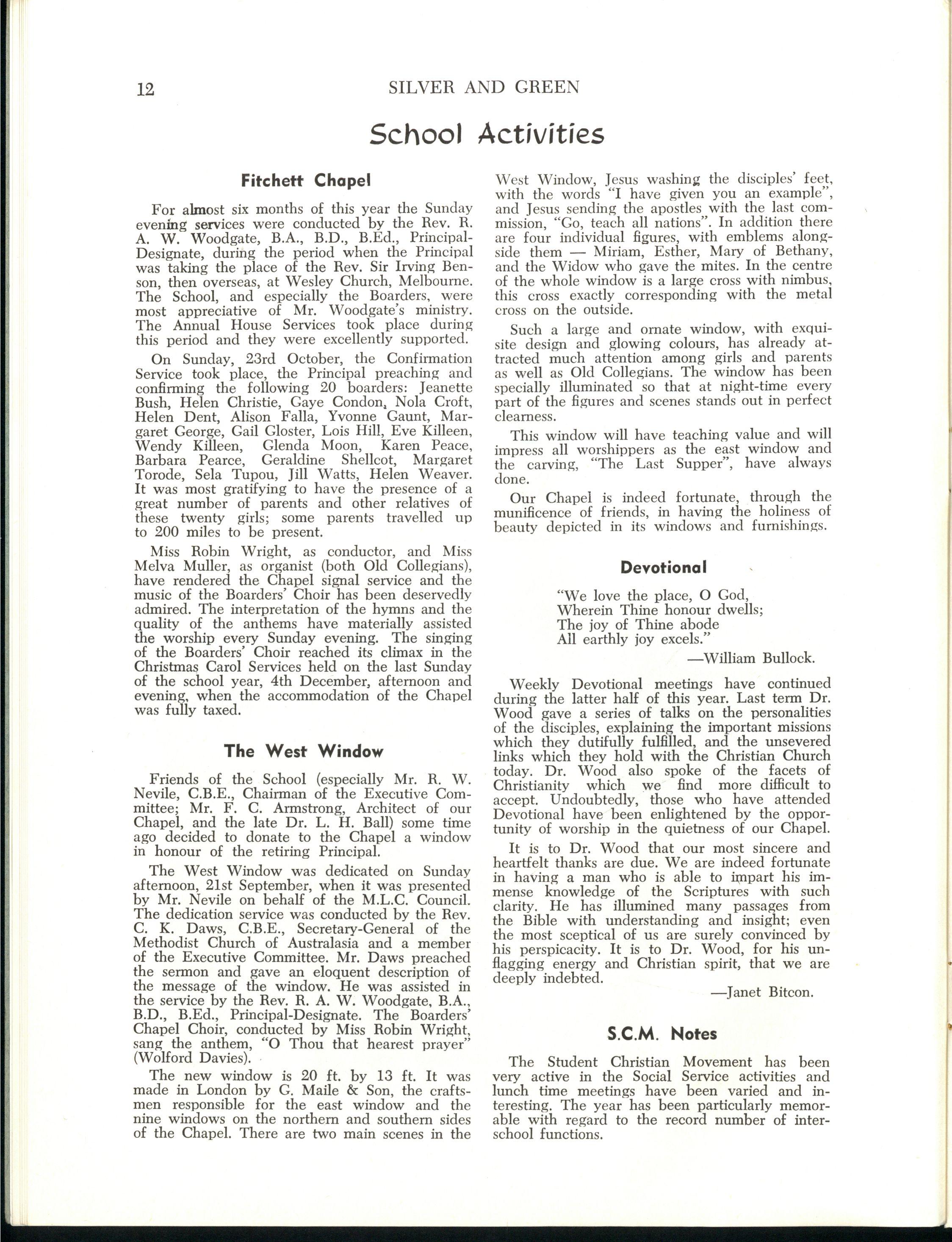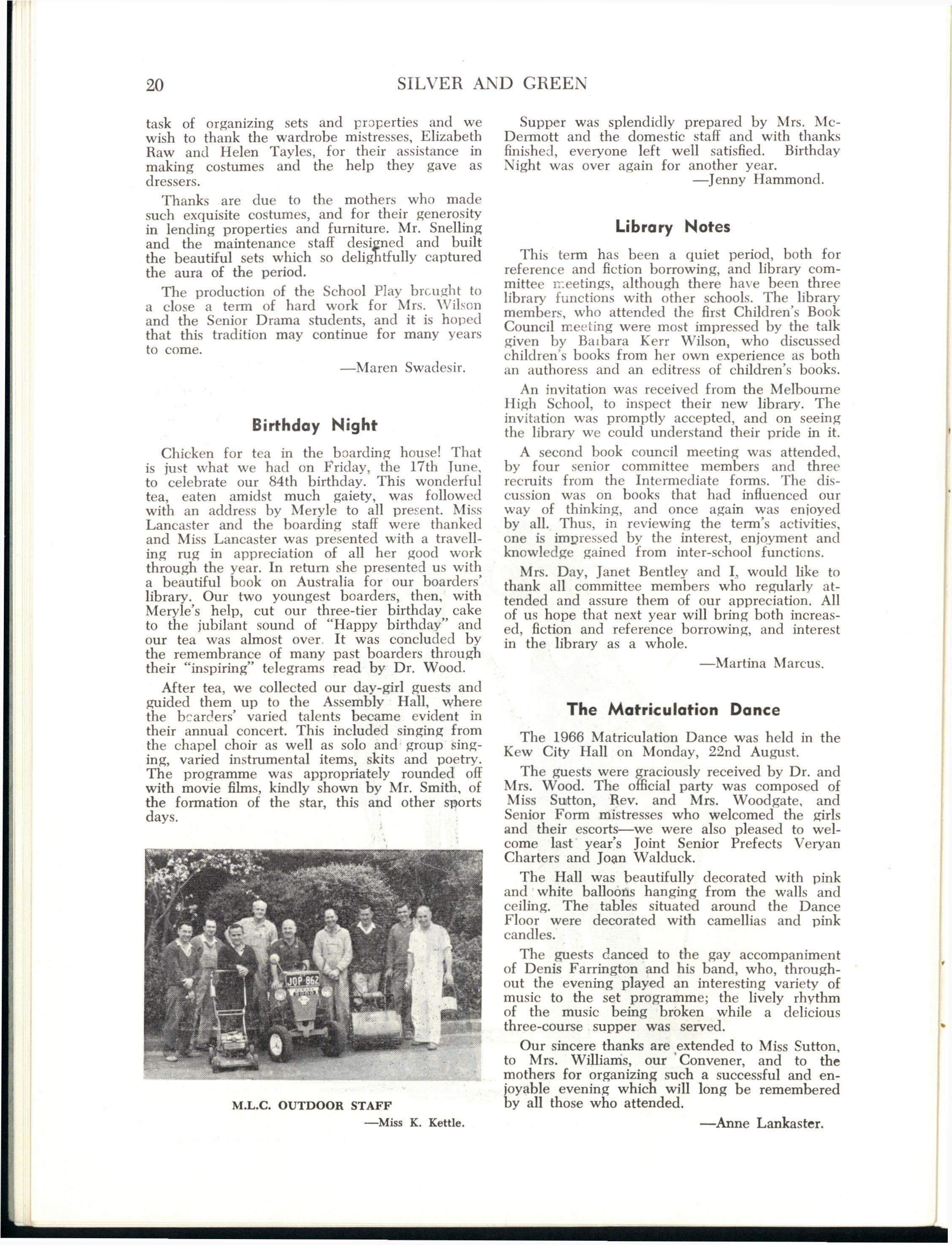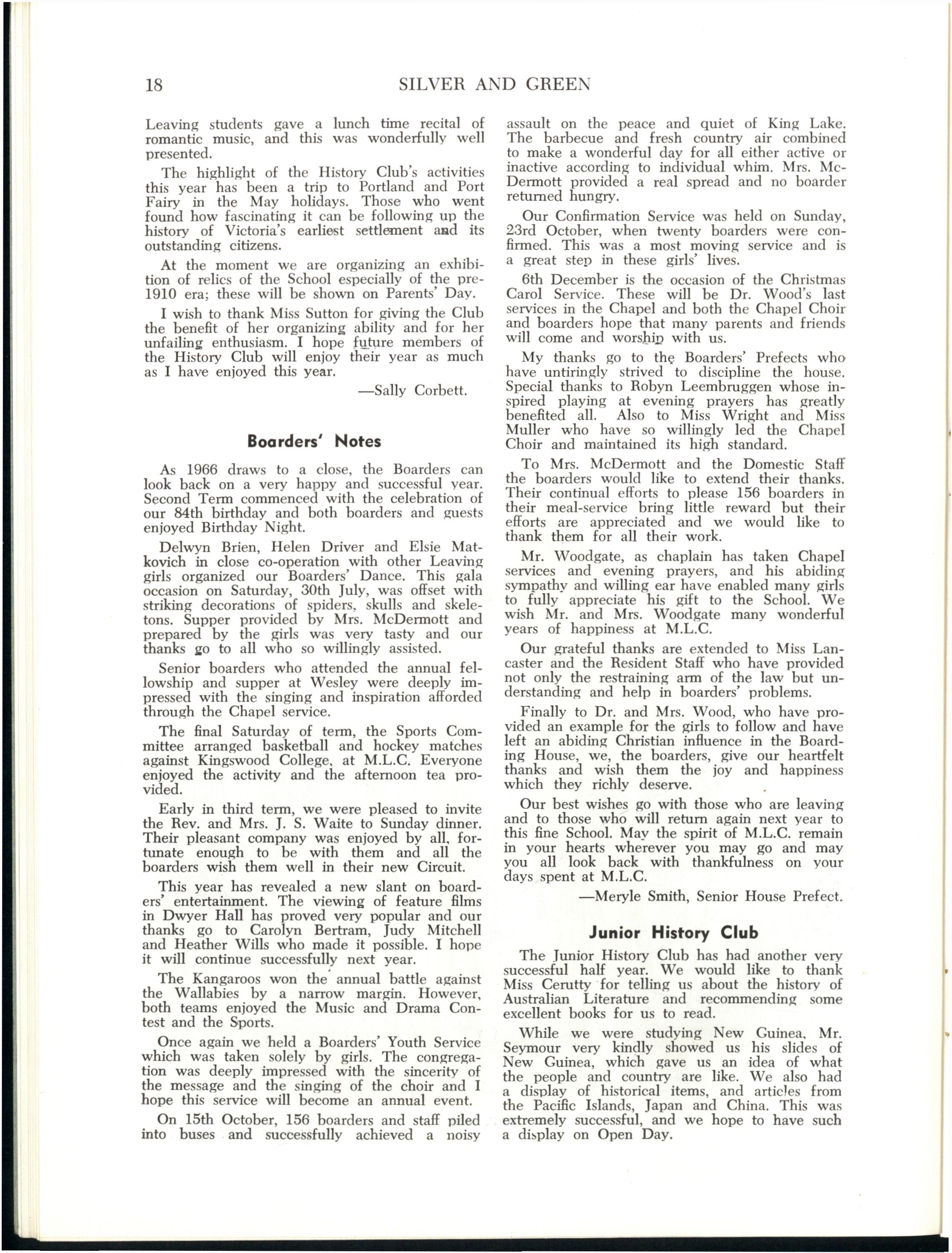 We were delighted to welcome Mr and Mrs Woodgate to M.L.C at the beginning of this year Already Mr Woodgate is showing himself to be interested in many school activities, and we were especially pleased to see him ably participating in the staff baseball match early in first term This event also provided us the opportunity of seeing how well he had accomplished the task of acquainting himself with the teachers As our School Chaplain and in all other capacities, Mr Woodgate invites our trust and confidence