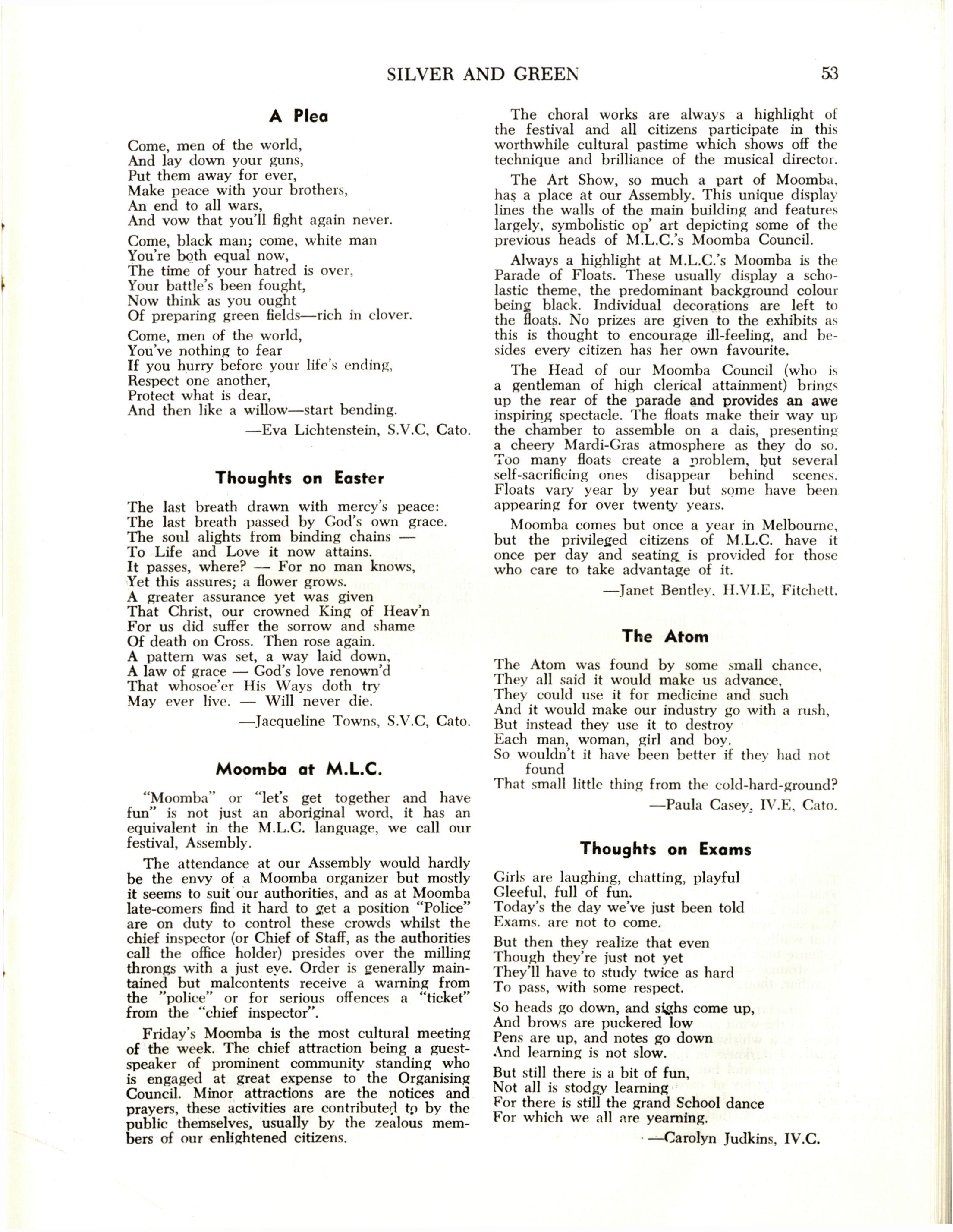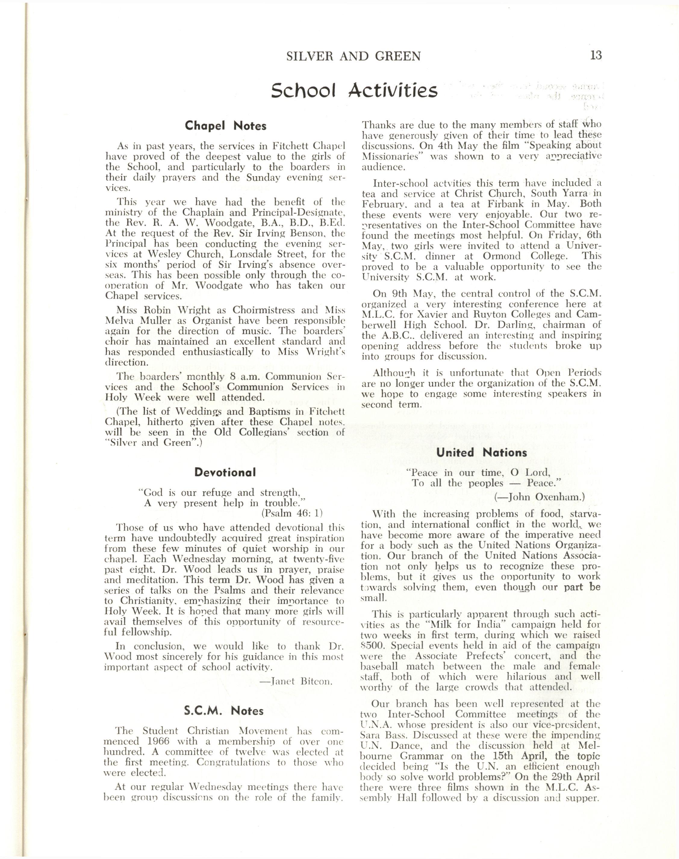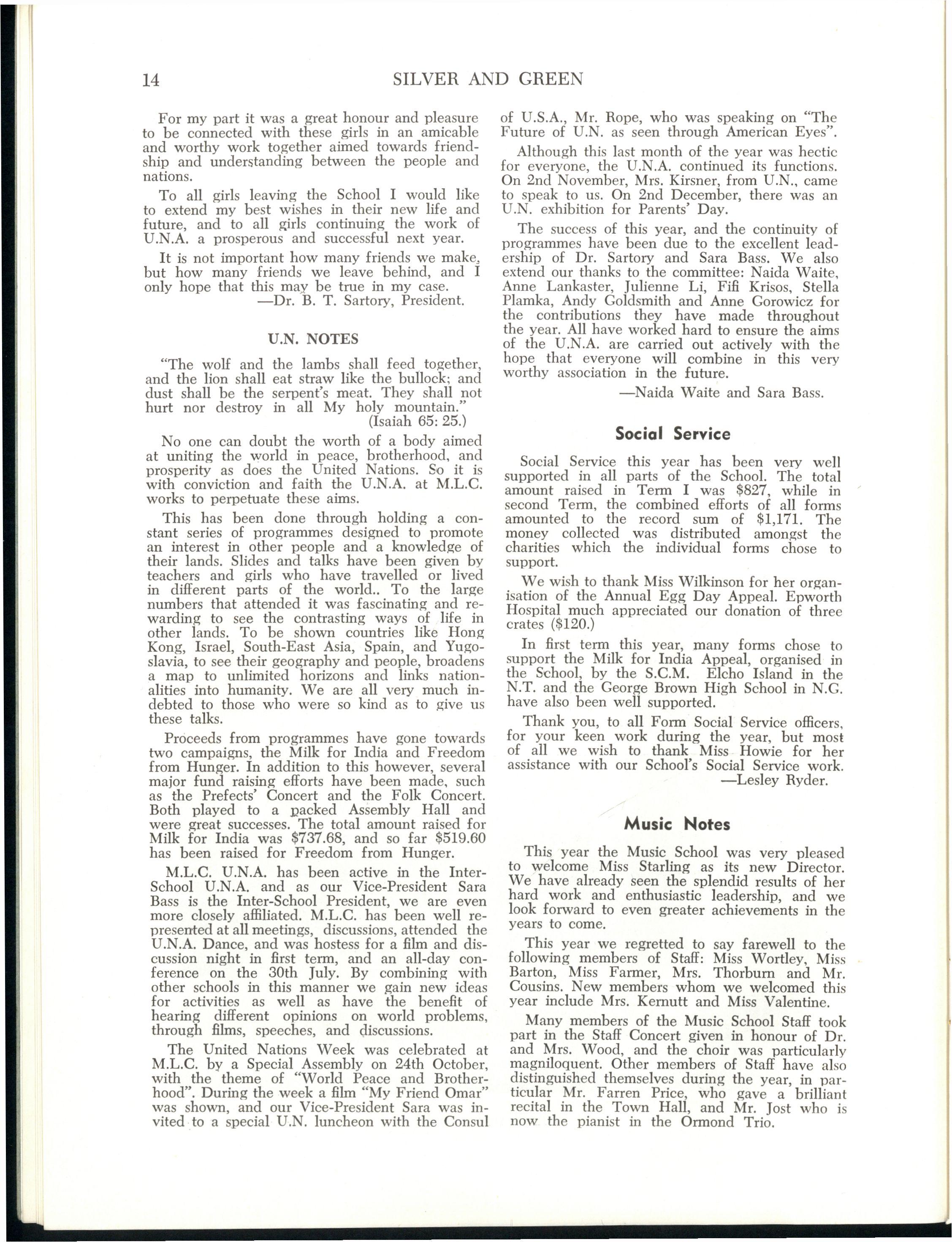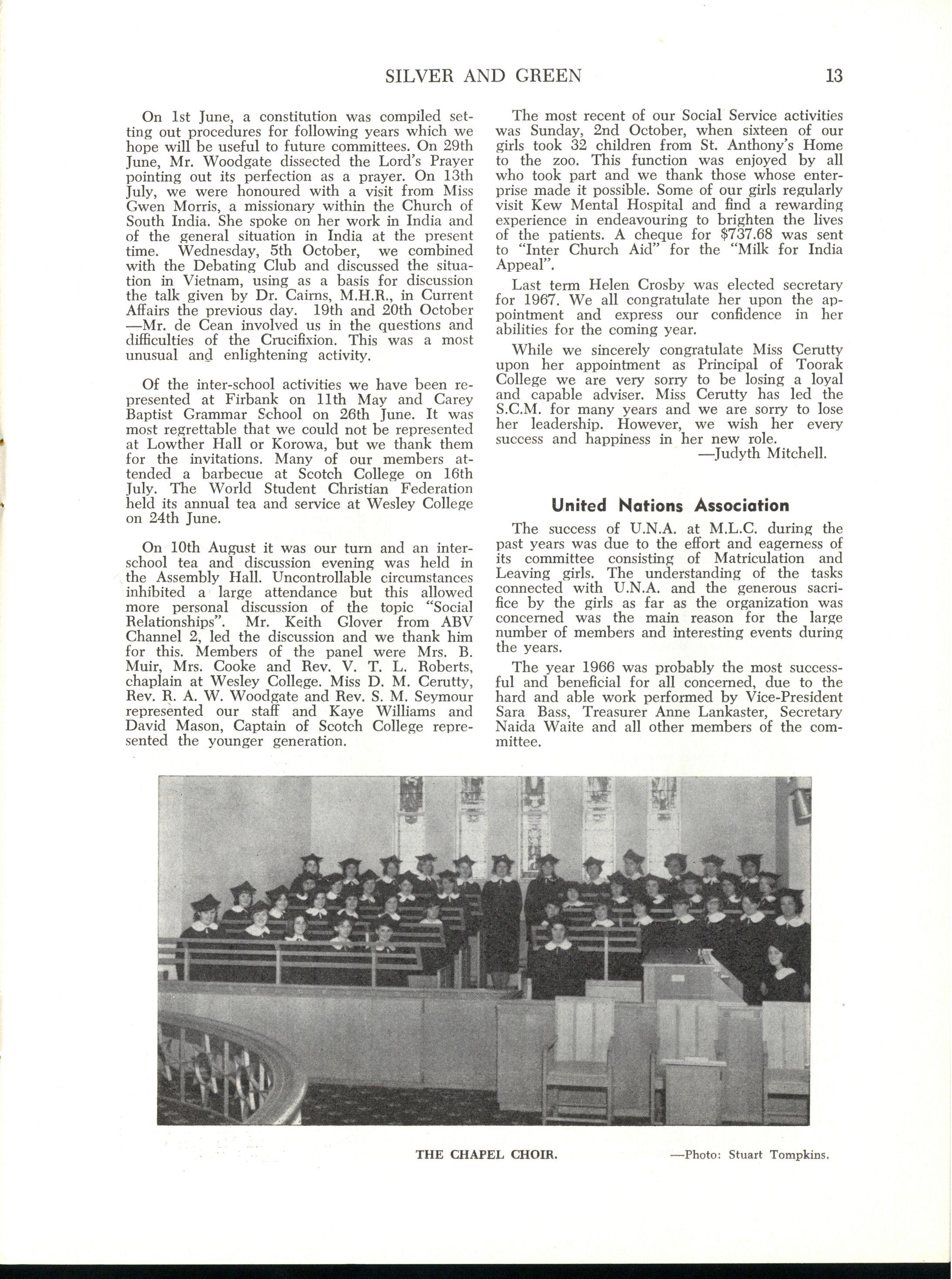 We were delighted to welcome Mr and Mrs Woodgate to M.L.C at the beginning of this year Already Mr Woodgate is showing himself to be interested in many school activities, and we were especially pleased to see him ably participating in the staff baseball match early in first term This event also provided us the opportunity of seeing how well he had accomplished the task of acquainting himself with the teachers As our School Chaplain and in all other capacities, Mr Woodgate invites our trust and confidence