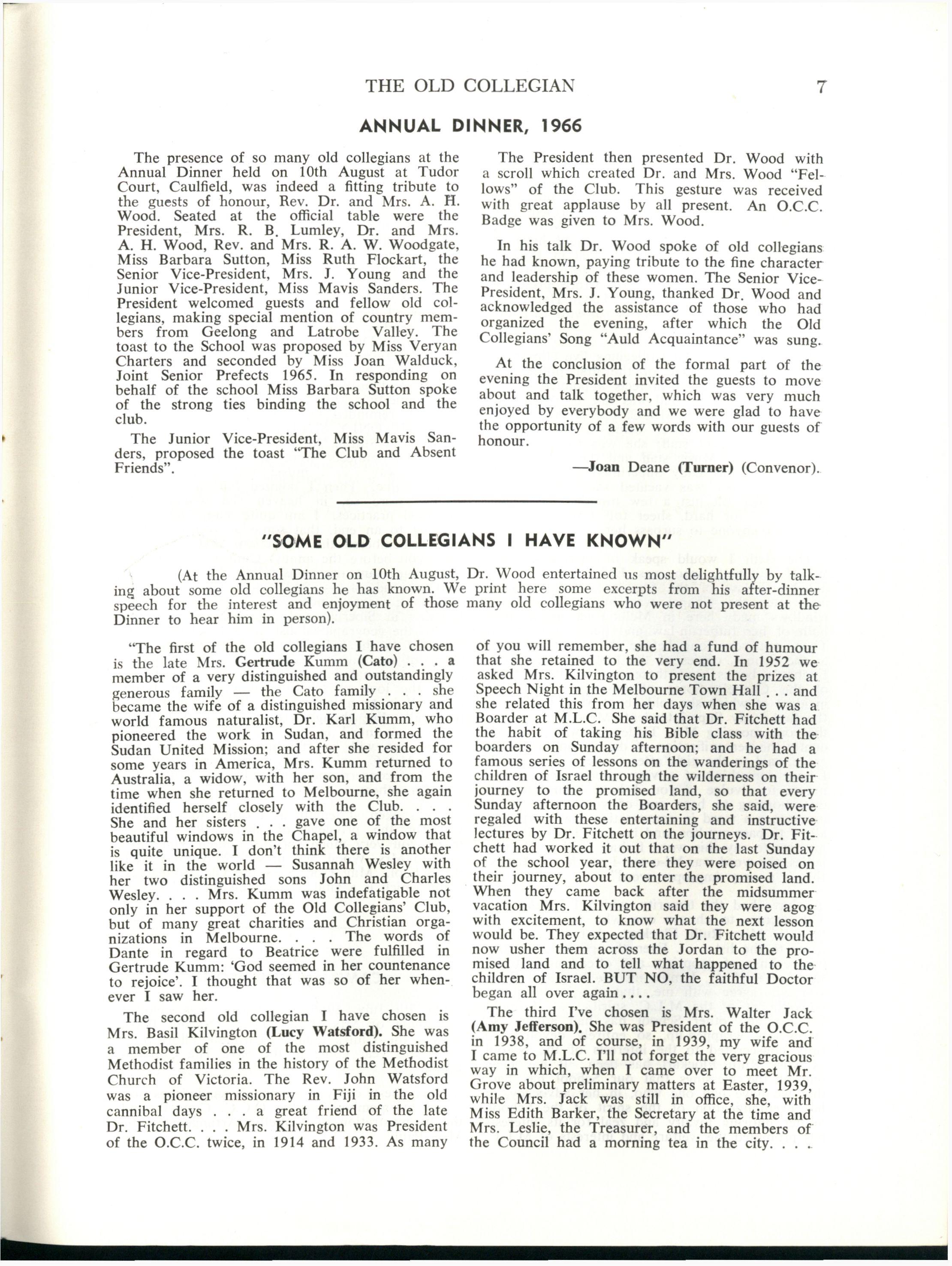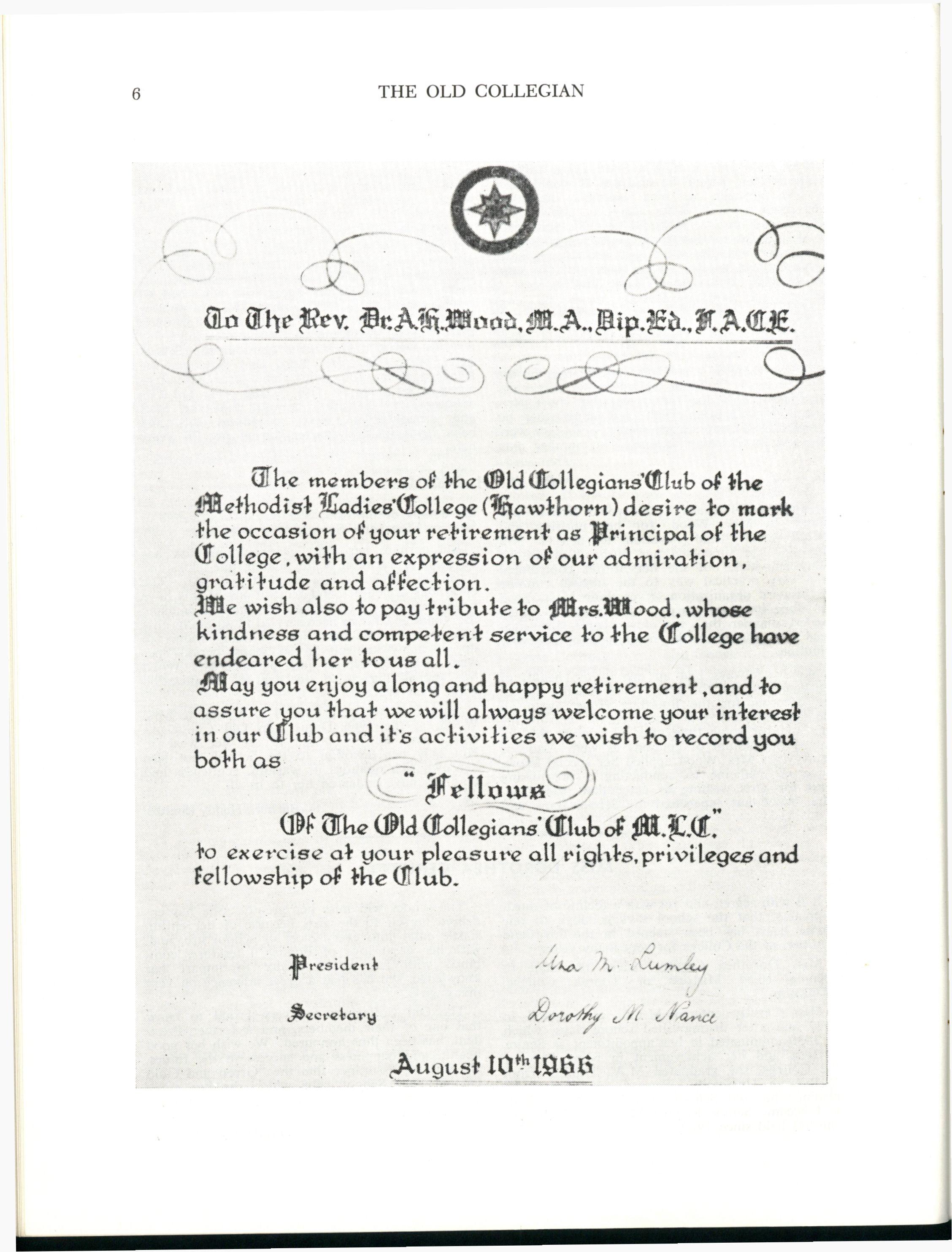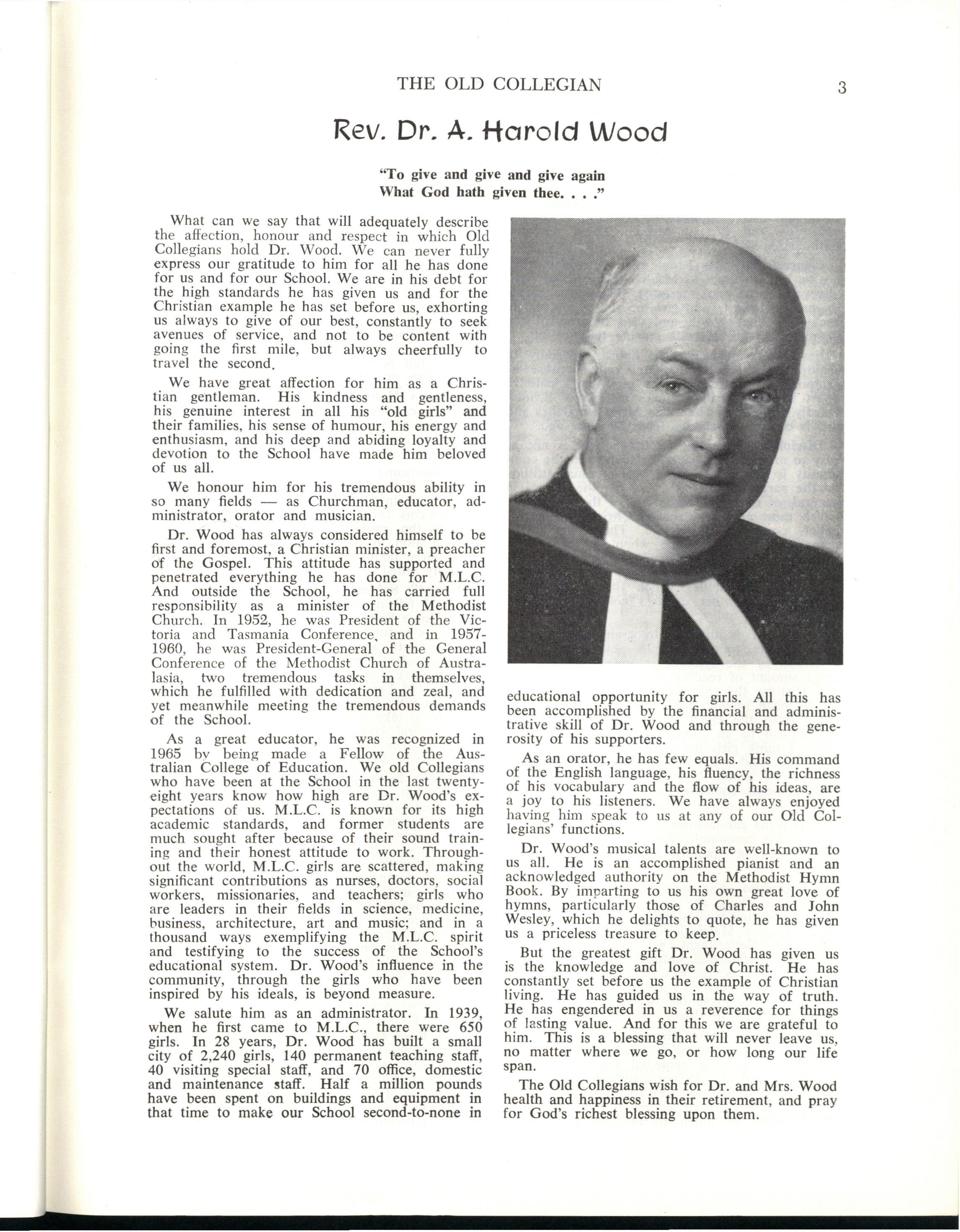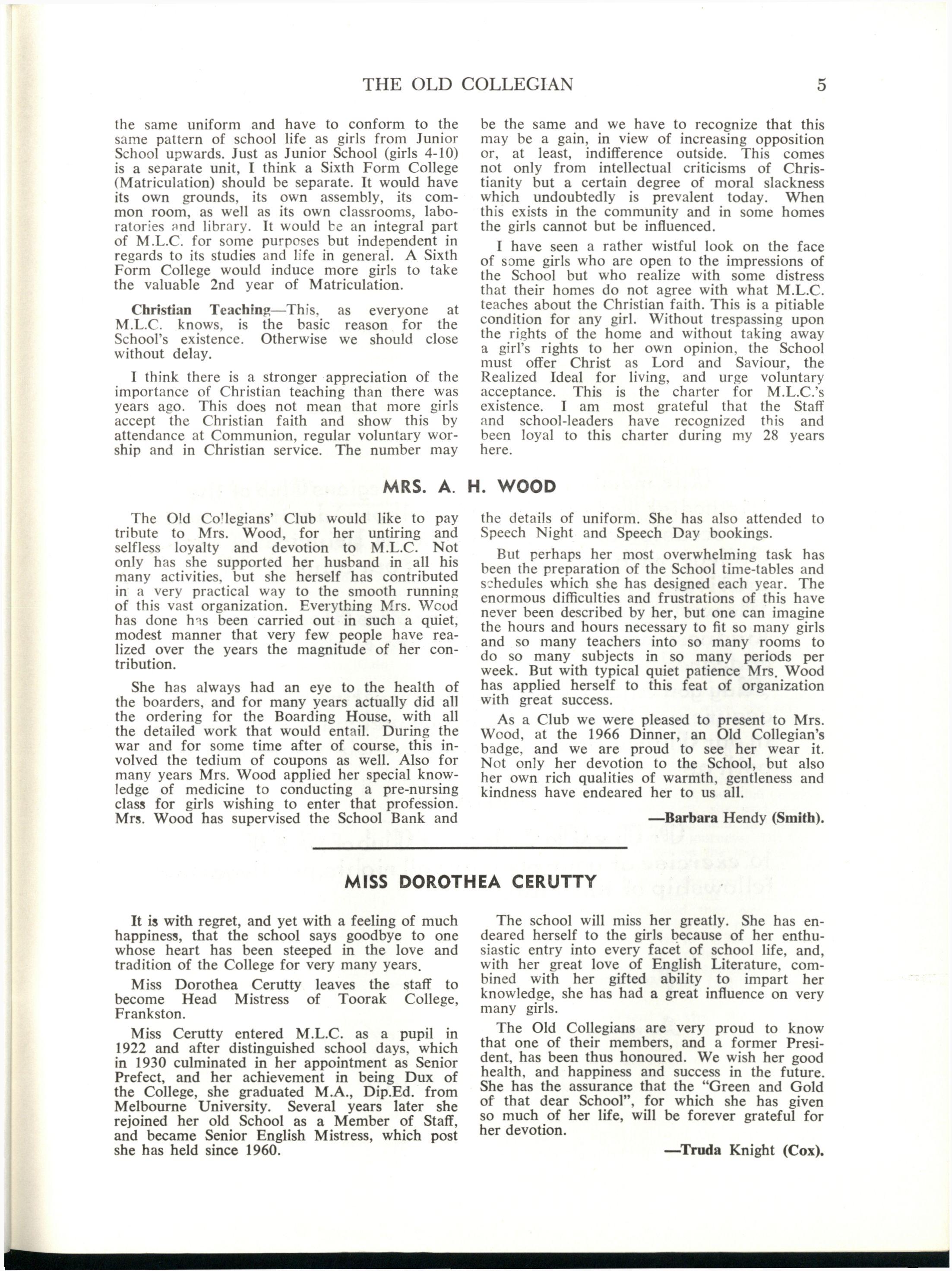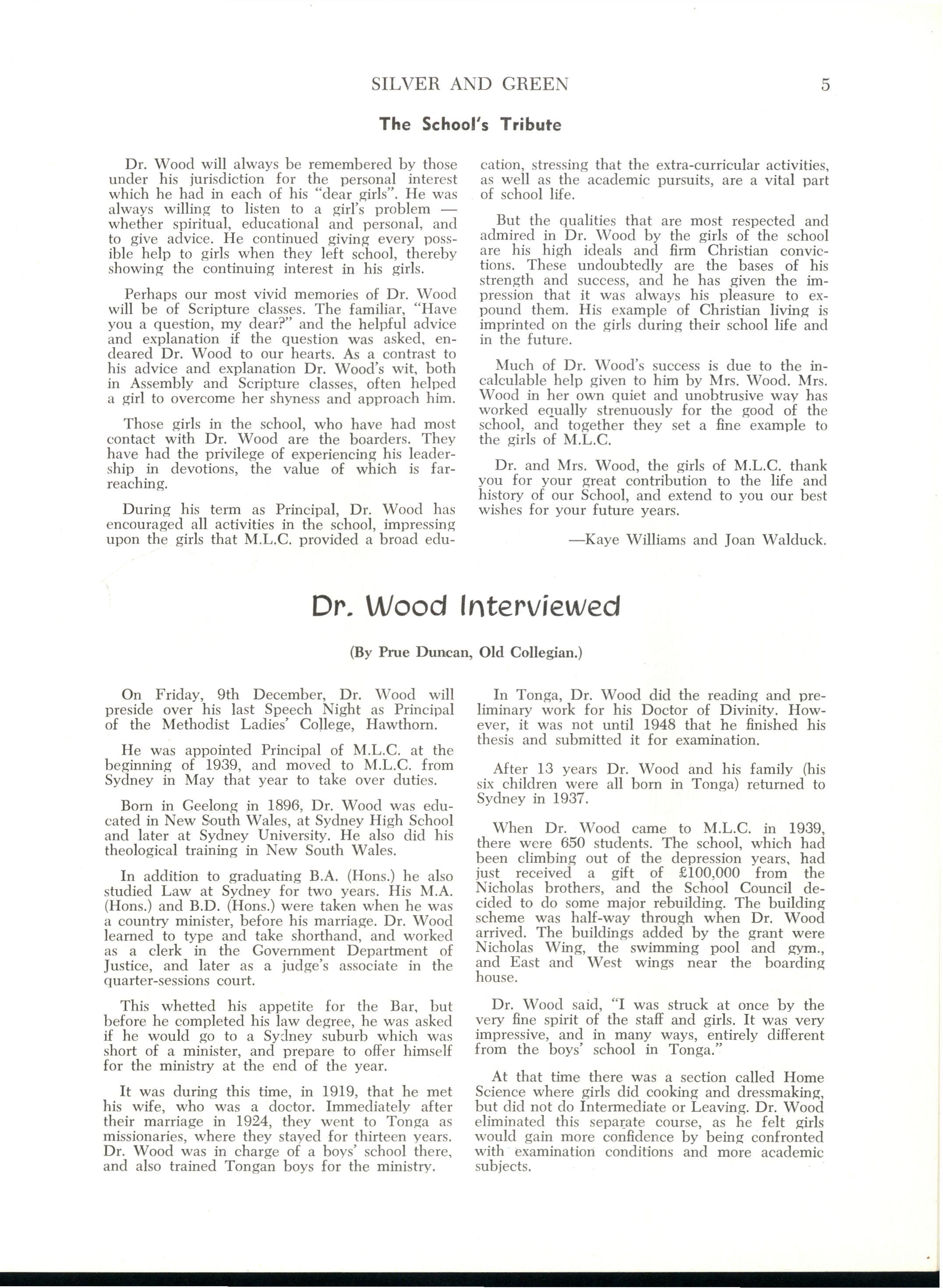Dr Wood paid tribute to the lovalty and devotion of each and to their individual contributions to the life of M.L.C and to their invaluable service We thank God for the service of these women and wish them every joy and success in the future