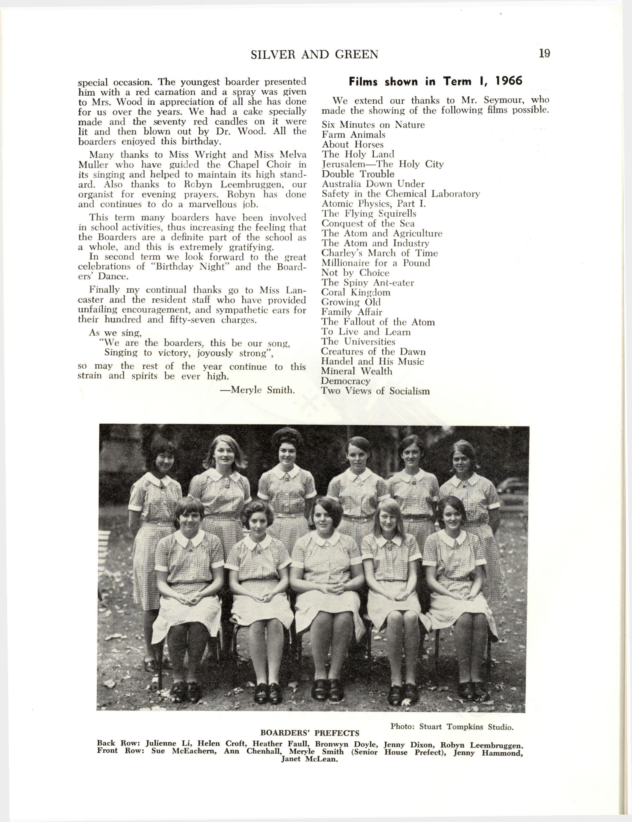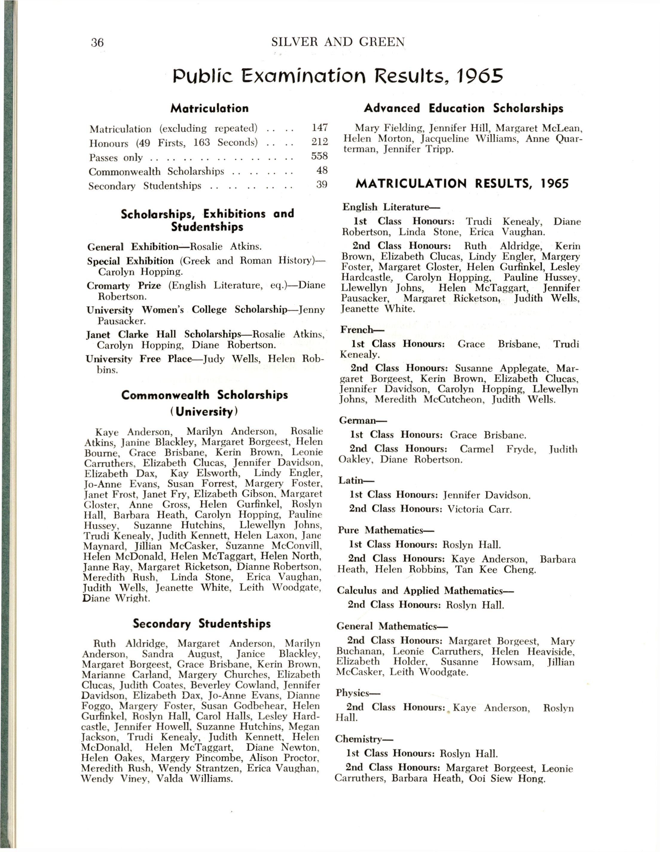 The climax of the 1965 school year was reached on Speech Night, on 10th December, in the Melbourne Town Hall
