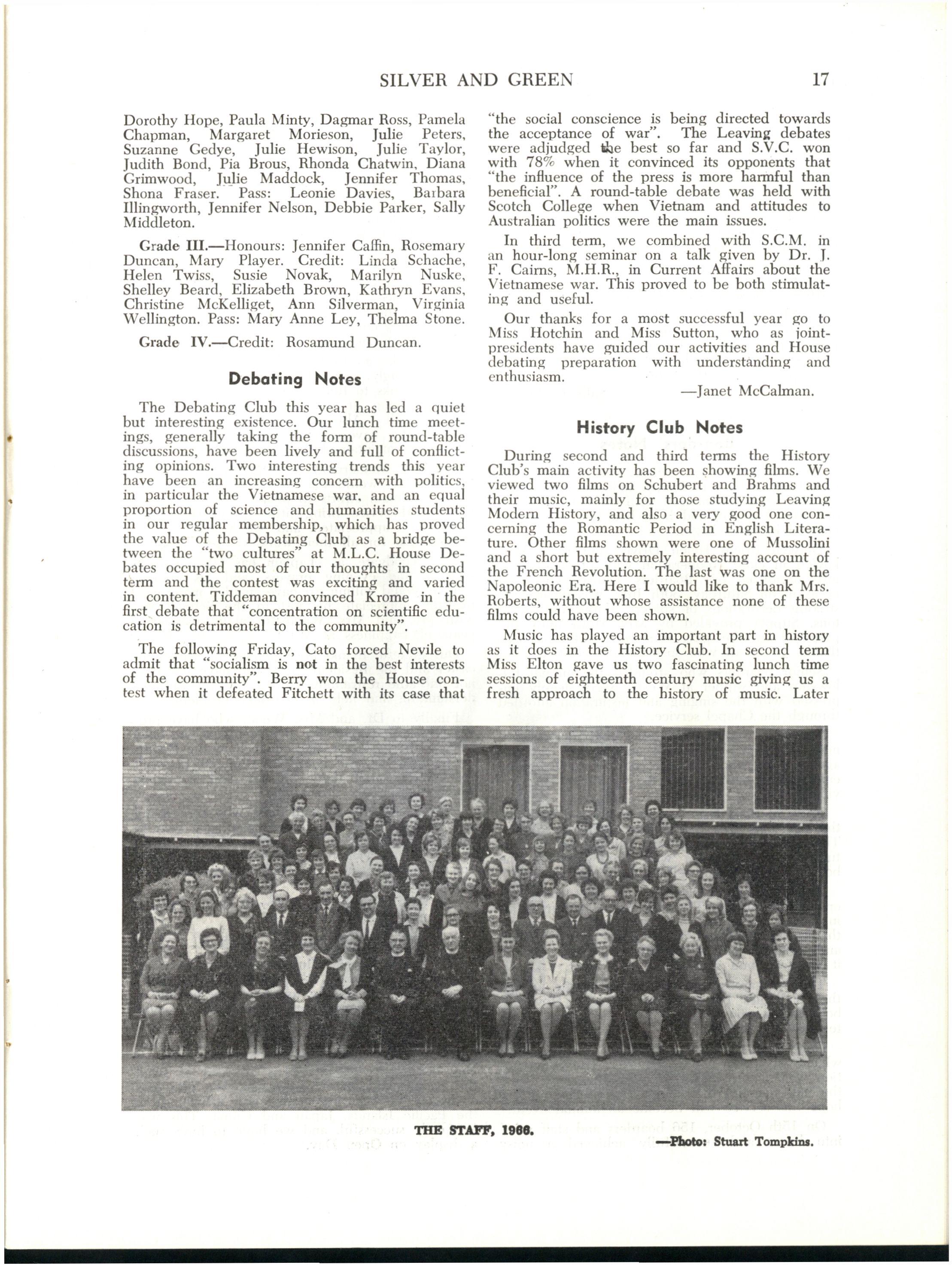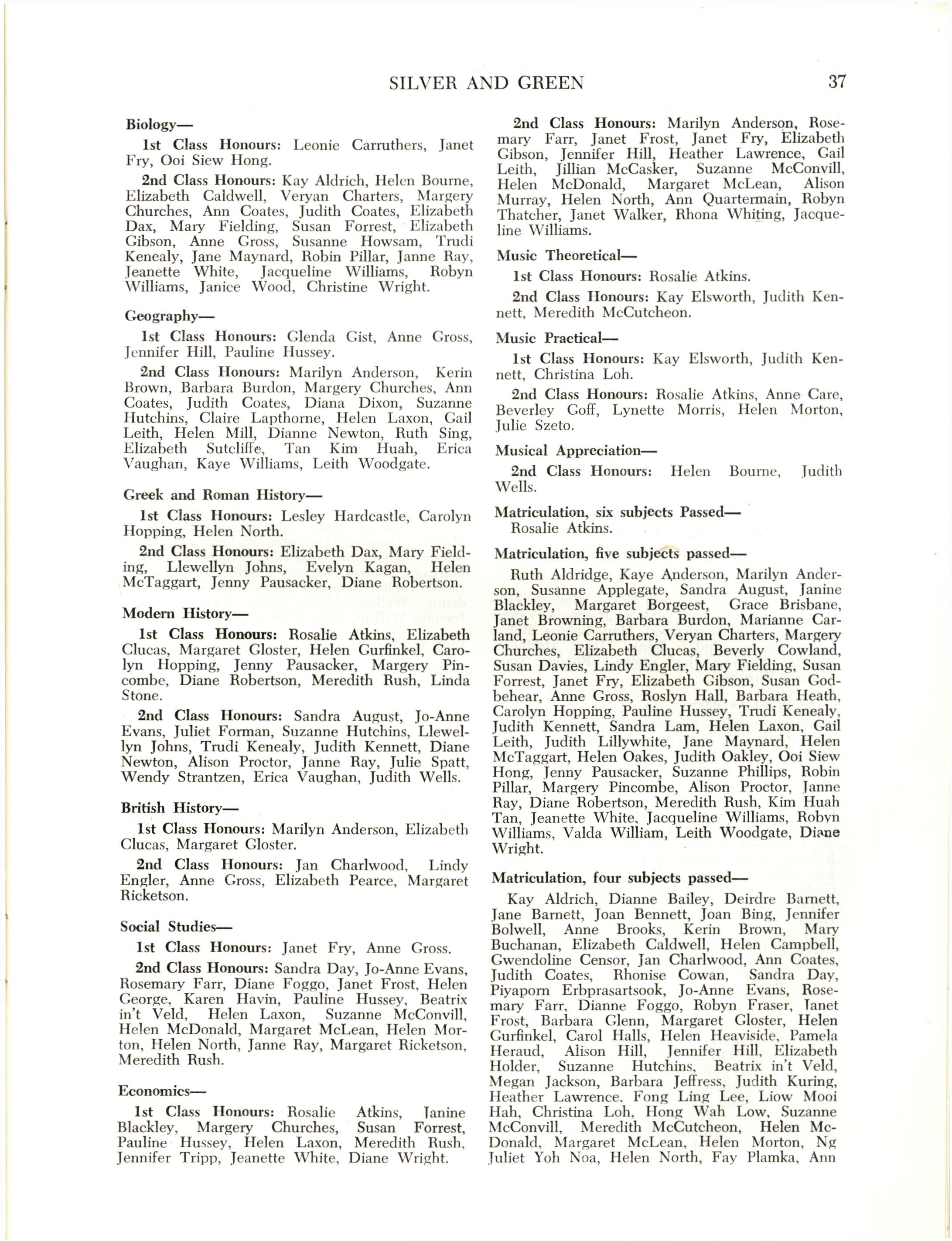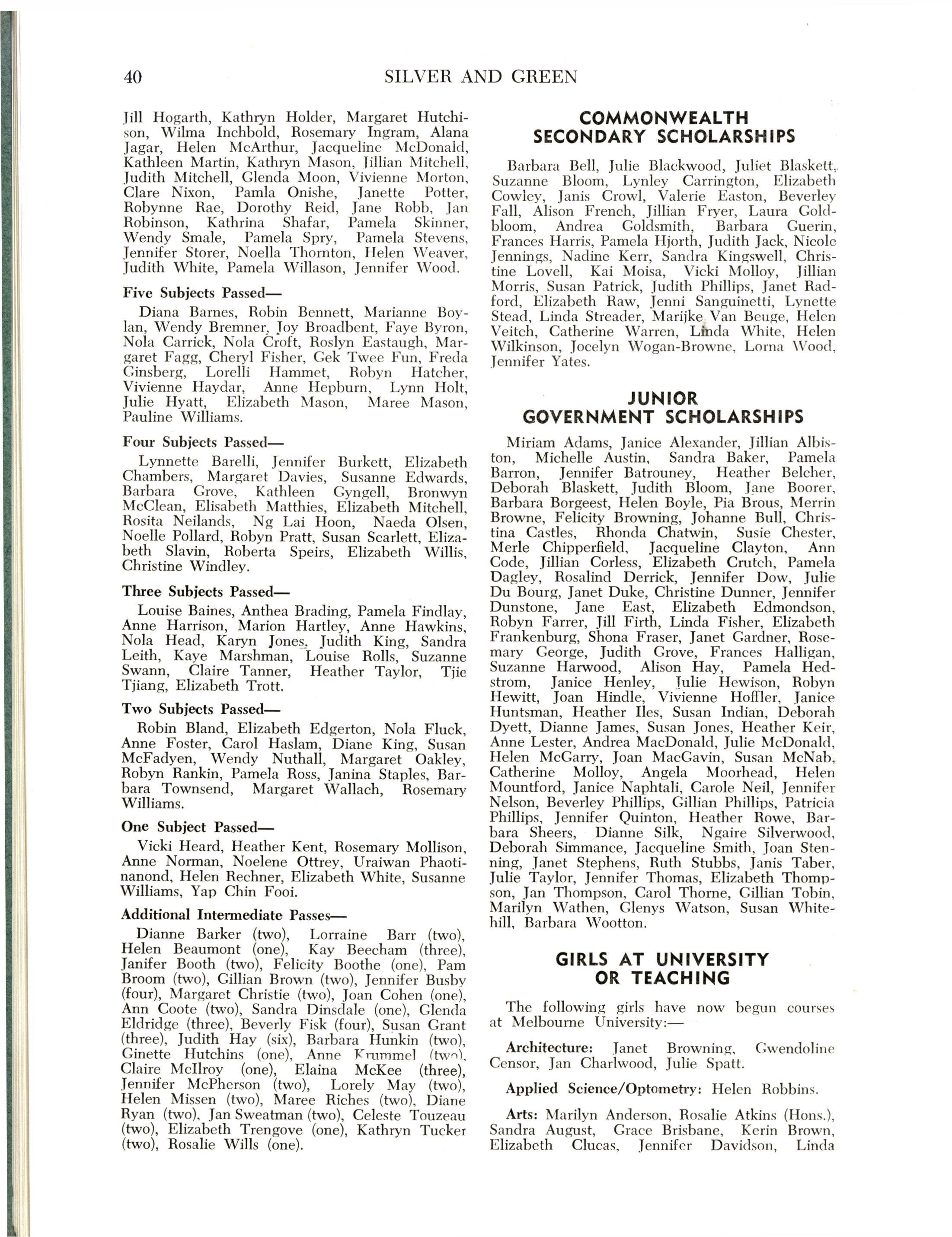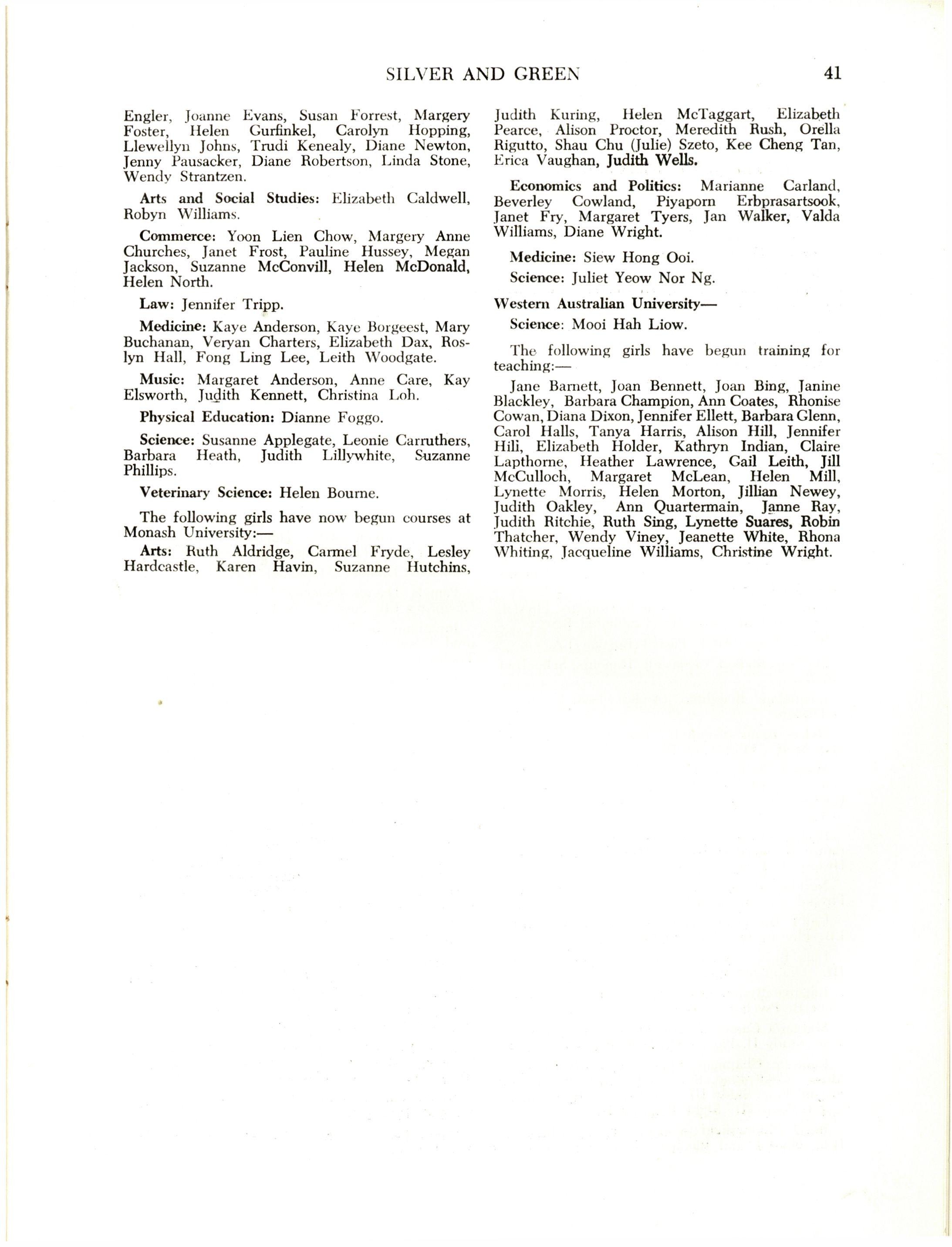 Committee: Miss D CERUTTY, Miss K KETTLE and Mrs M de KAM (Examination results, etc.), SALLY CORBETT, ROSAMUND DUNCAN, ELIZABETH ELLIOTT, ANGELA GAST, MARGABET JOHNS, JANET McCALMAN, ELIZABETH RAW, JANET STRACHAN, VIRGINIA WEEKES