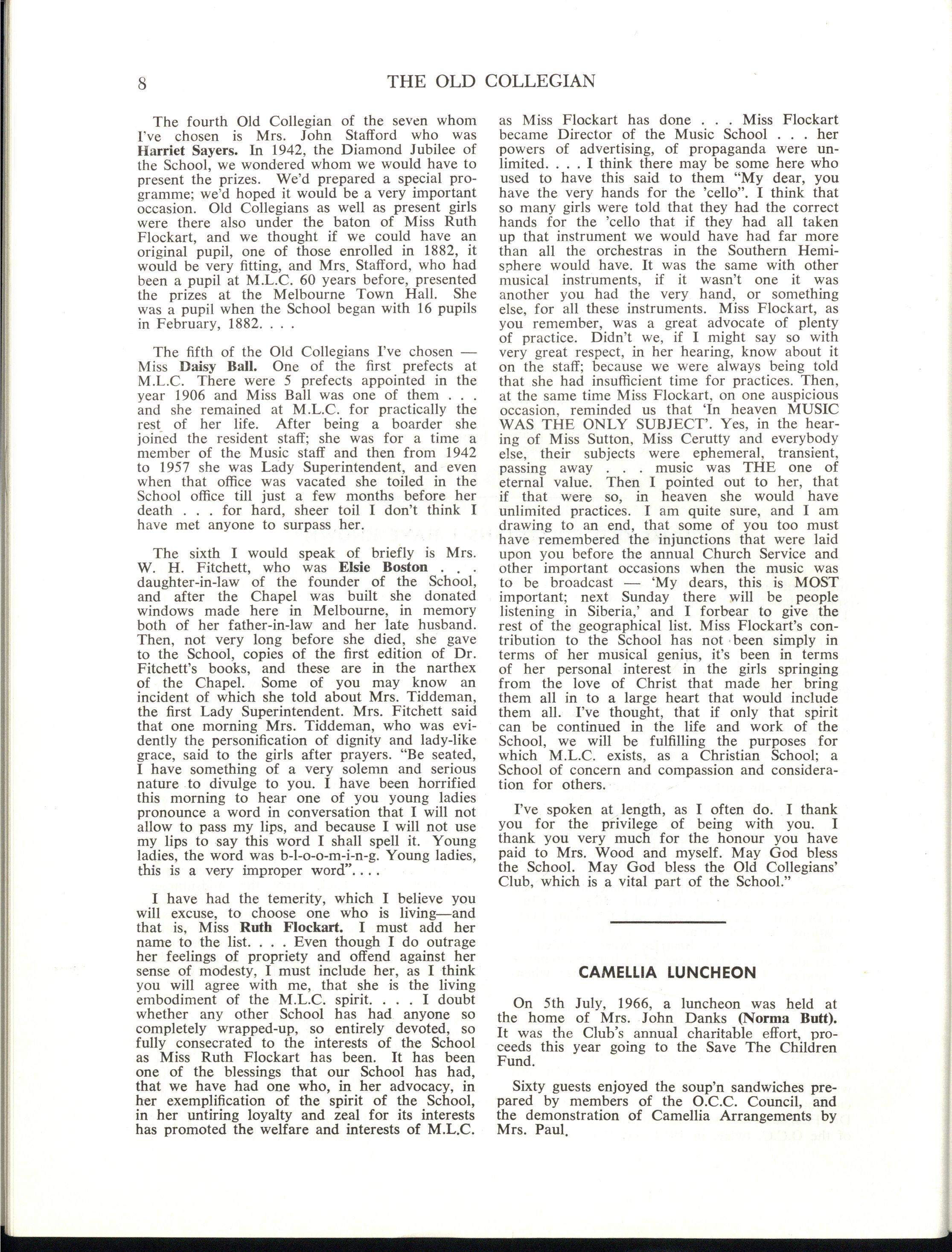 The prizes were then presented by Mrs T H Coates, B.A.., M.Ed., wife of the headmaster of Wesley College and a former member of the School Staff We extend our sincere thanks to Mrs Coates for so graciously presenting the prizes, and also for her very thoughtful words to the girls