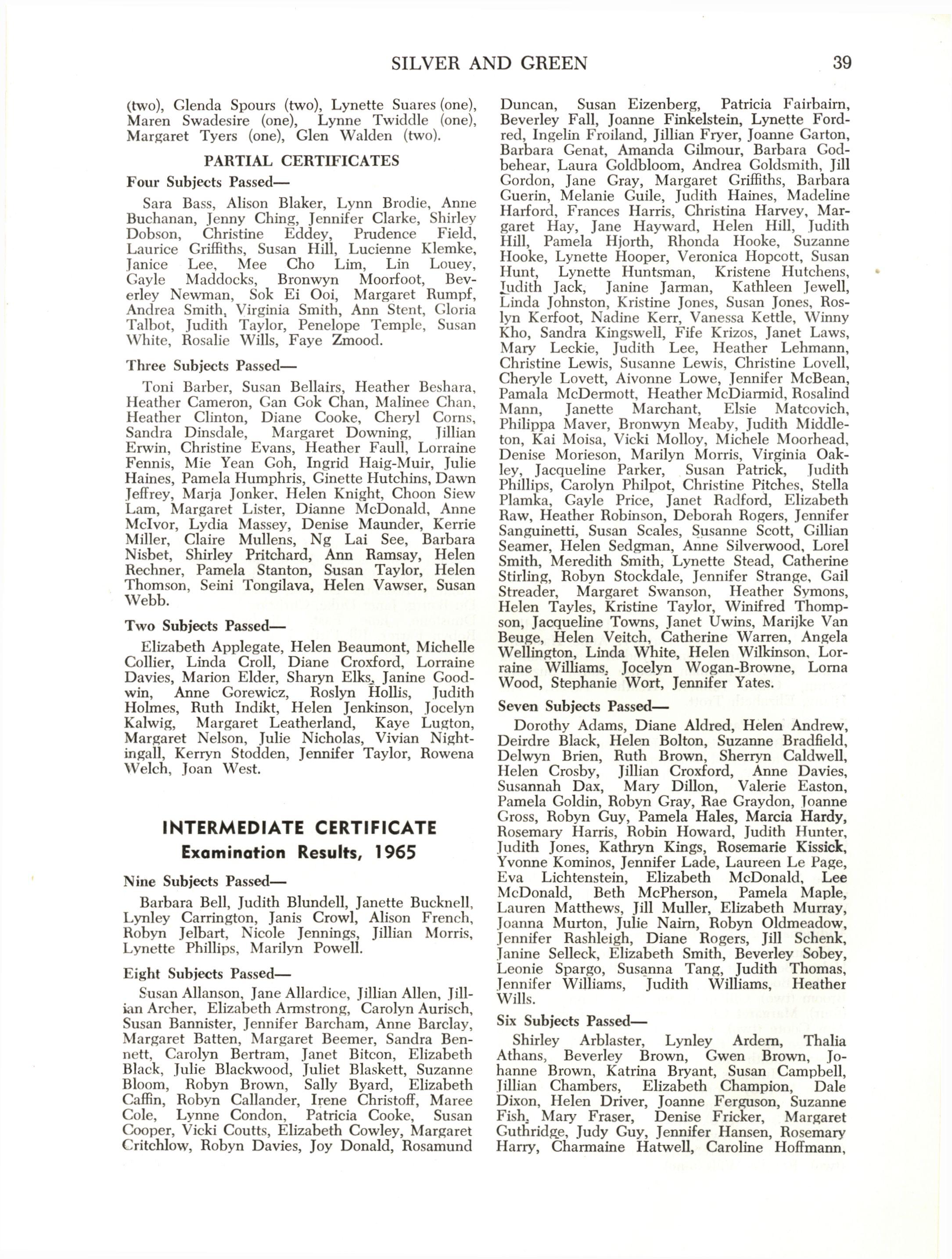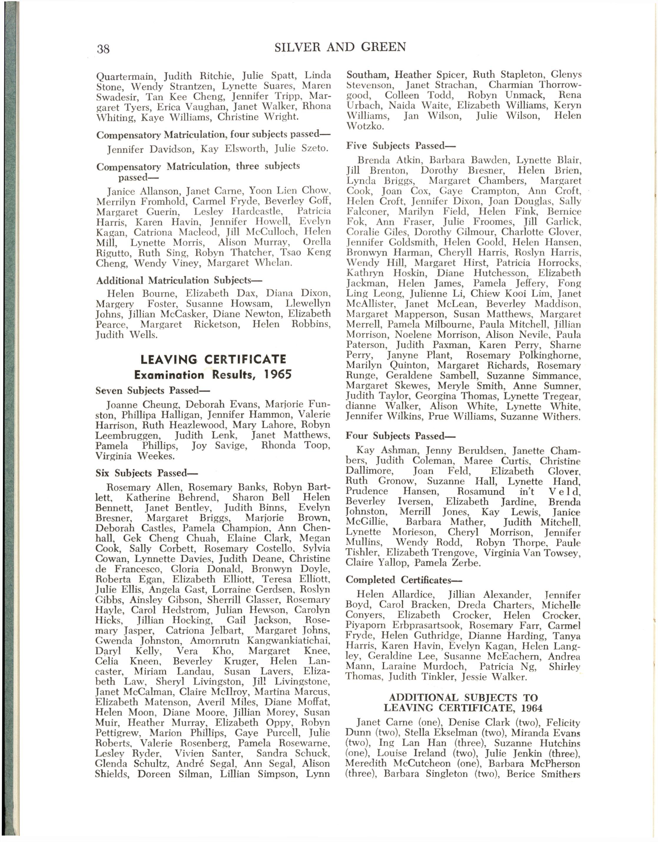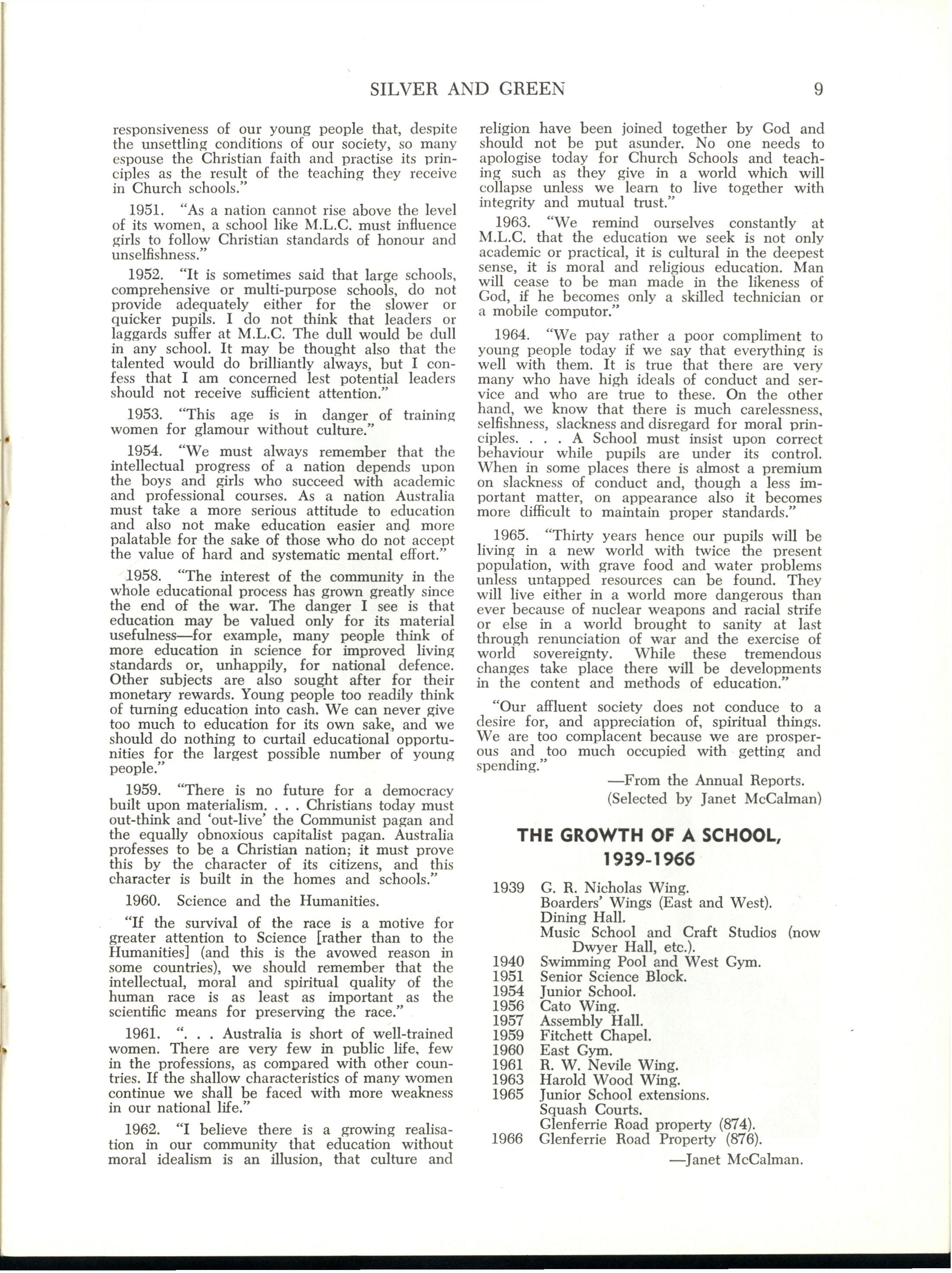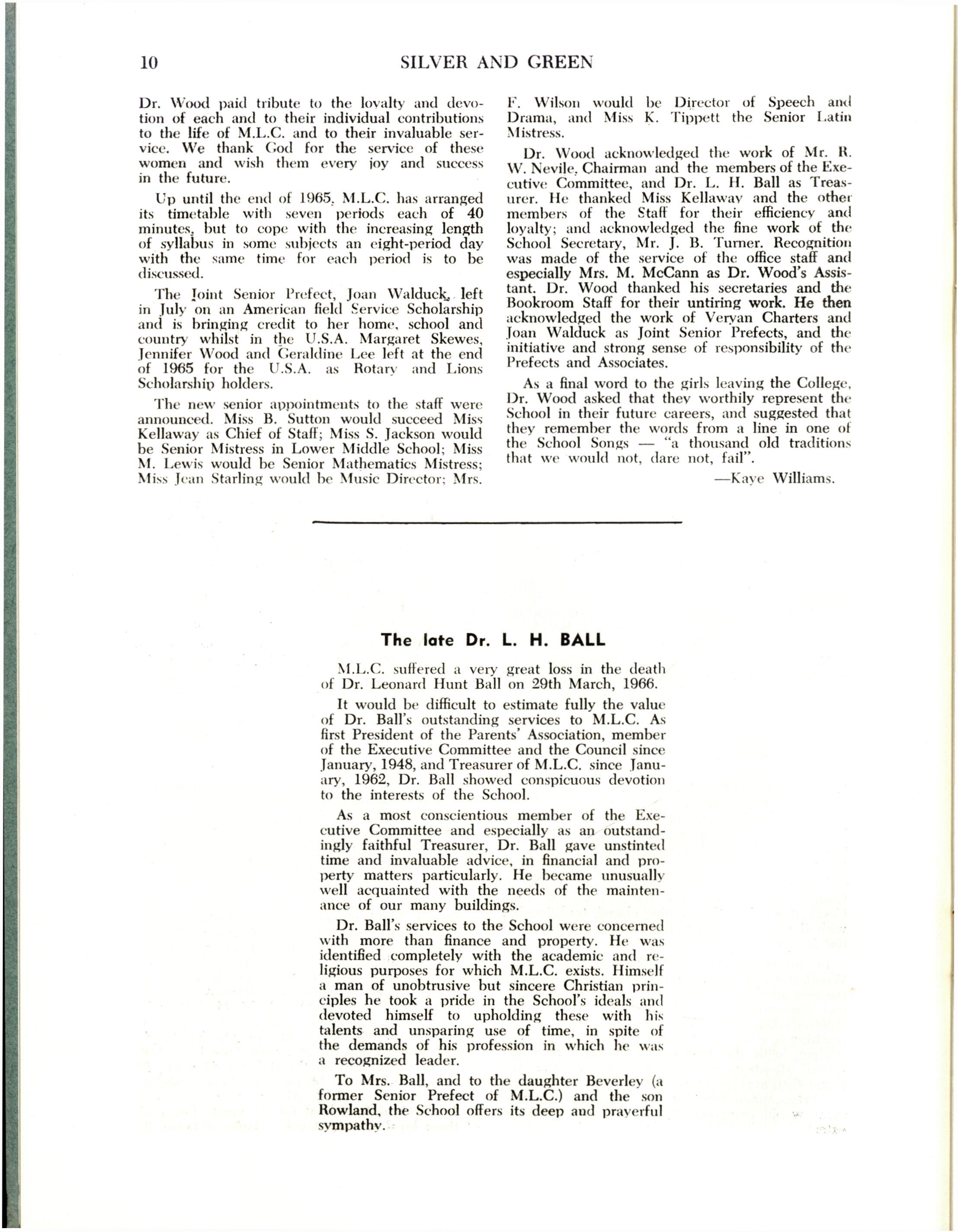 Speech Night of 1965 was especially memorable in that five members of Staff, each of whom has taught for over 30 years, were leaving the School, simultaneously Miss L. D. Kellaway retired after 39 years on the Staff, including 27 years as Senior Mathematics Mistress, and 10 years as Chief of Staff Miss A M H Betts, who for 40 years has taught Latin and English in Senior School; Miss D L Dwyer who has taught Soeeeh and Drama for 36 years: Miss E J Mitchell, who has been on the staff for 42 years, 24 of which as Senior Mistress in Lower Middle School; and Mrs H S Alcorn, who has taught in Lower Middle School for 31 years For each of these loyal women it was a mVht of farewells.
