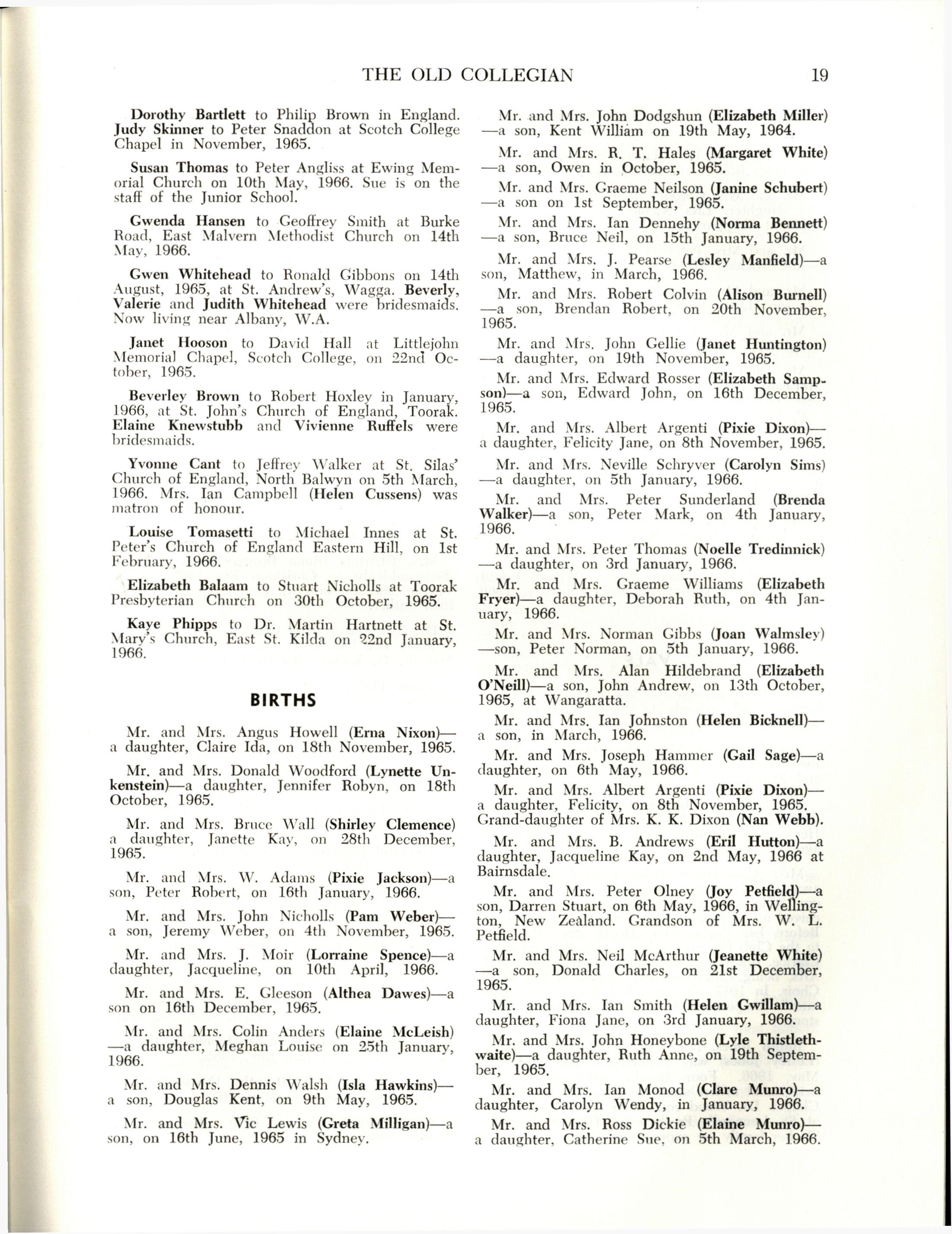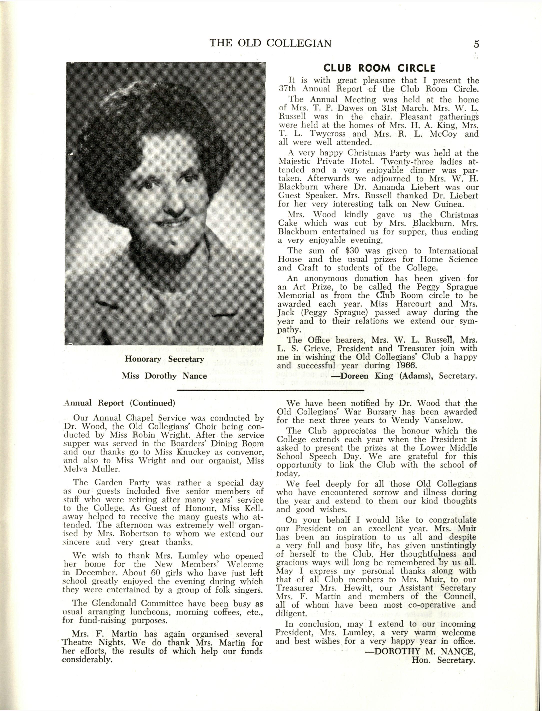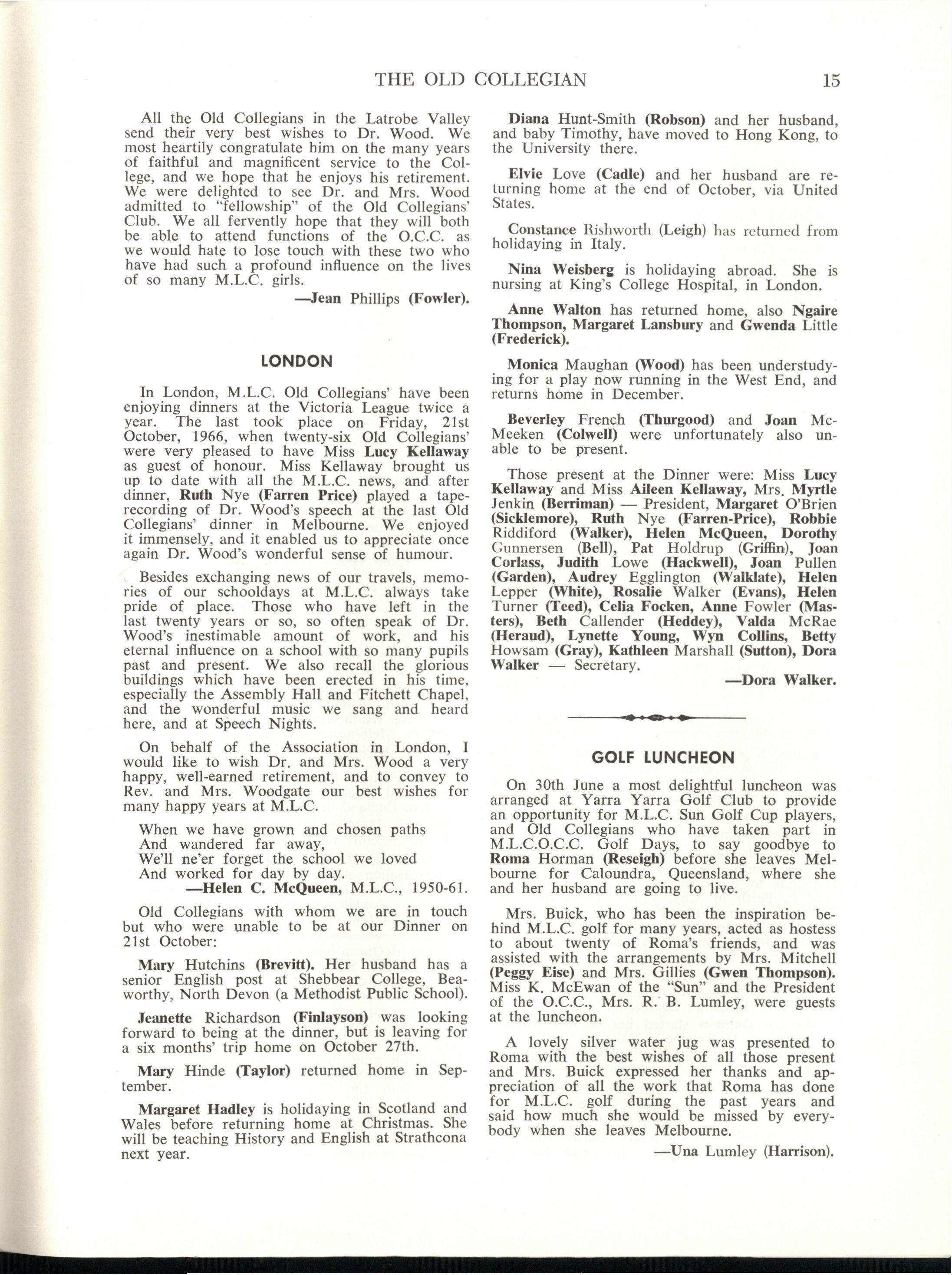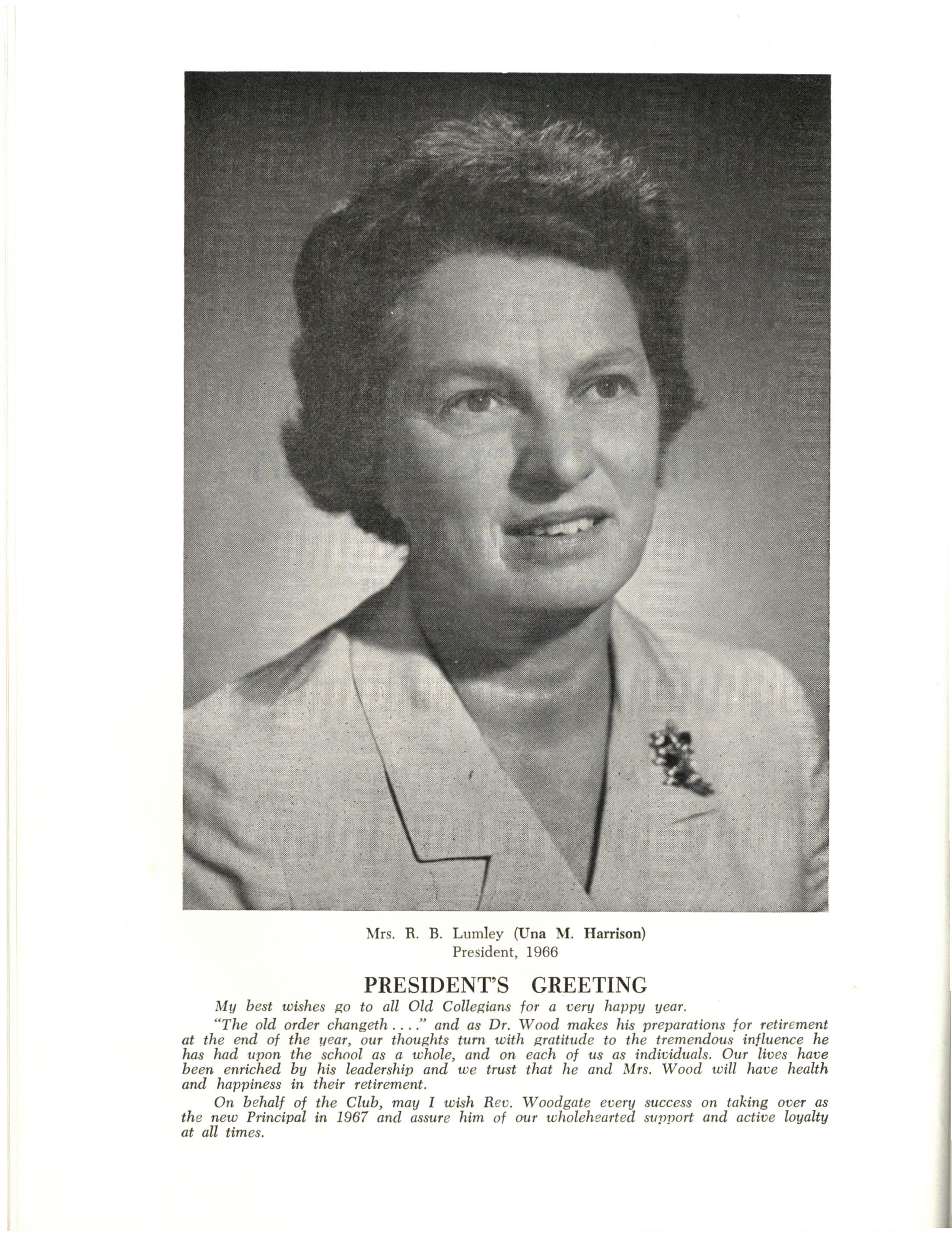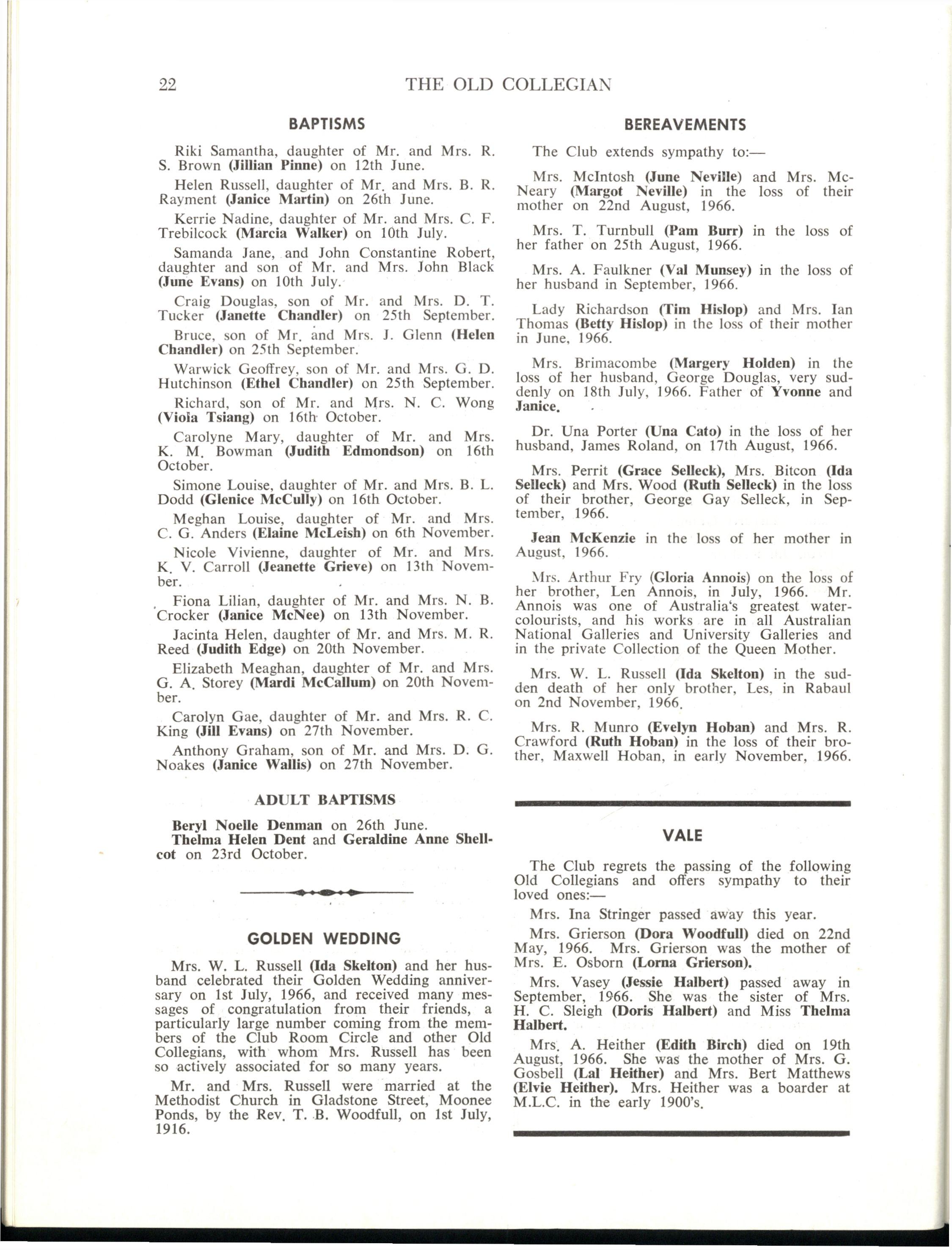 Mrs W L Russell (Ida Skelton) and her husband celebrated their Golden Wedding anniversary on 1st July, 1966, and received many messages of congratulation from their friends, a particularly large number coming from the members of the Club Room Circle and other Old Collegians, with whom Mrs Russell has been so actively associated for so many years