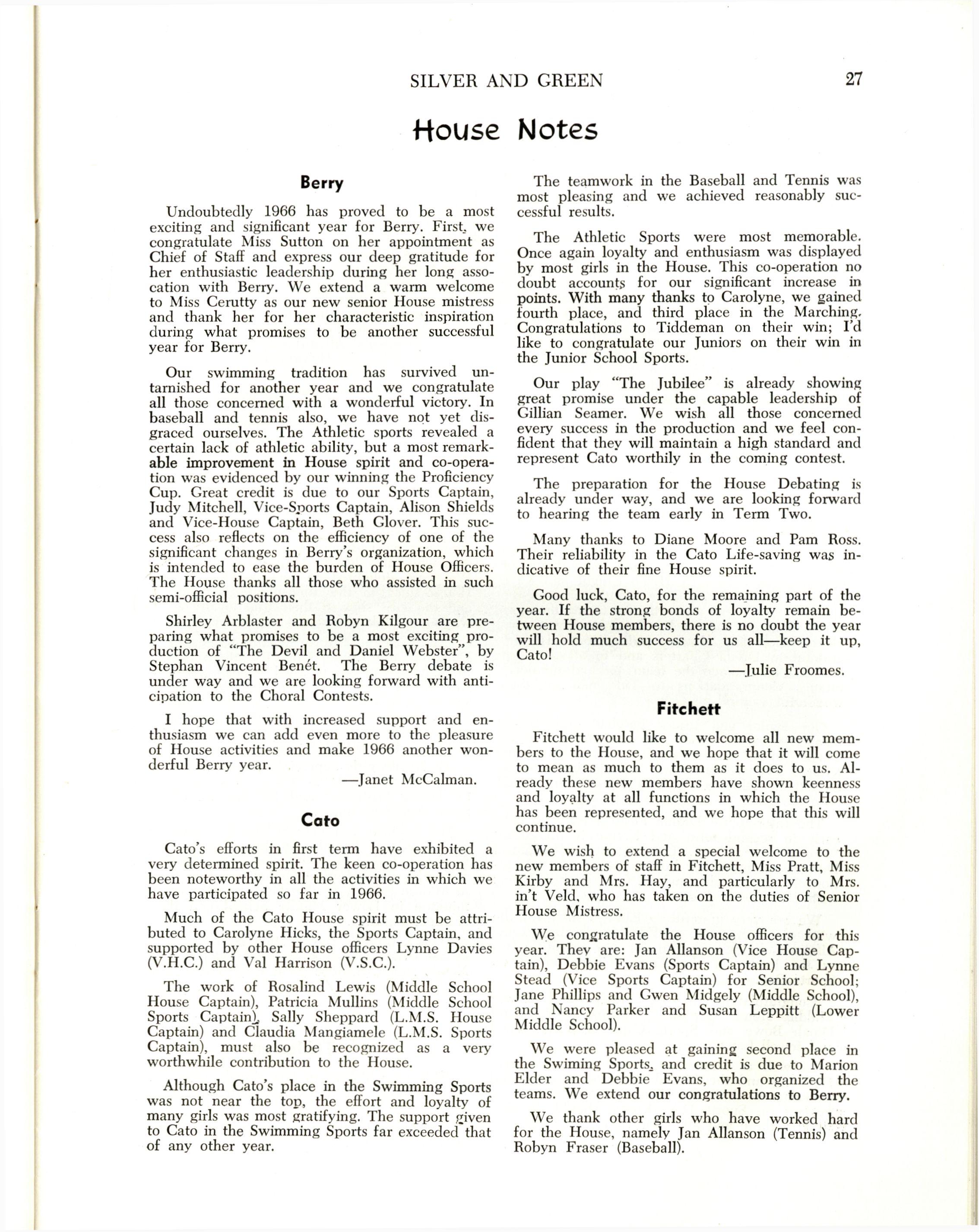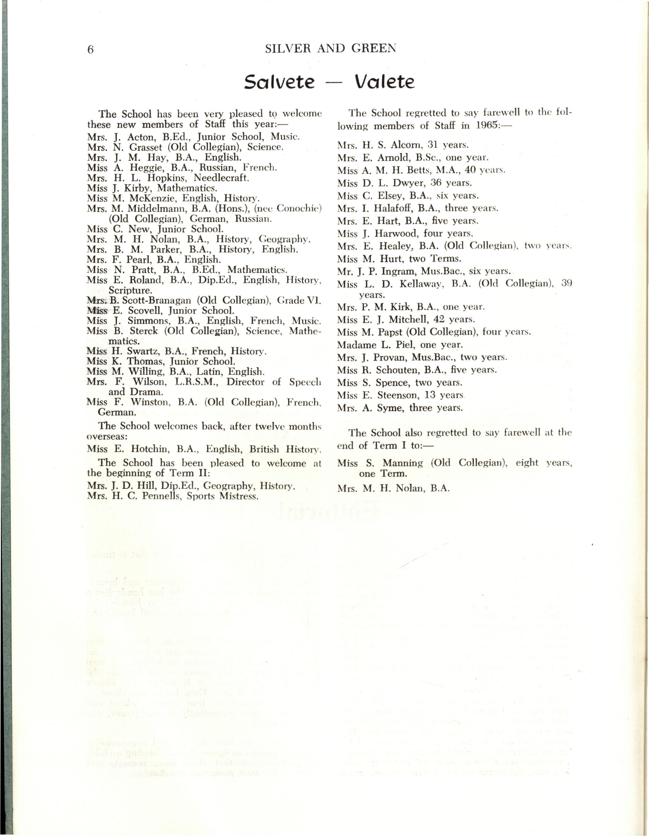 The School regretted to say farewell to the following members of Staff in 1965:—