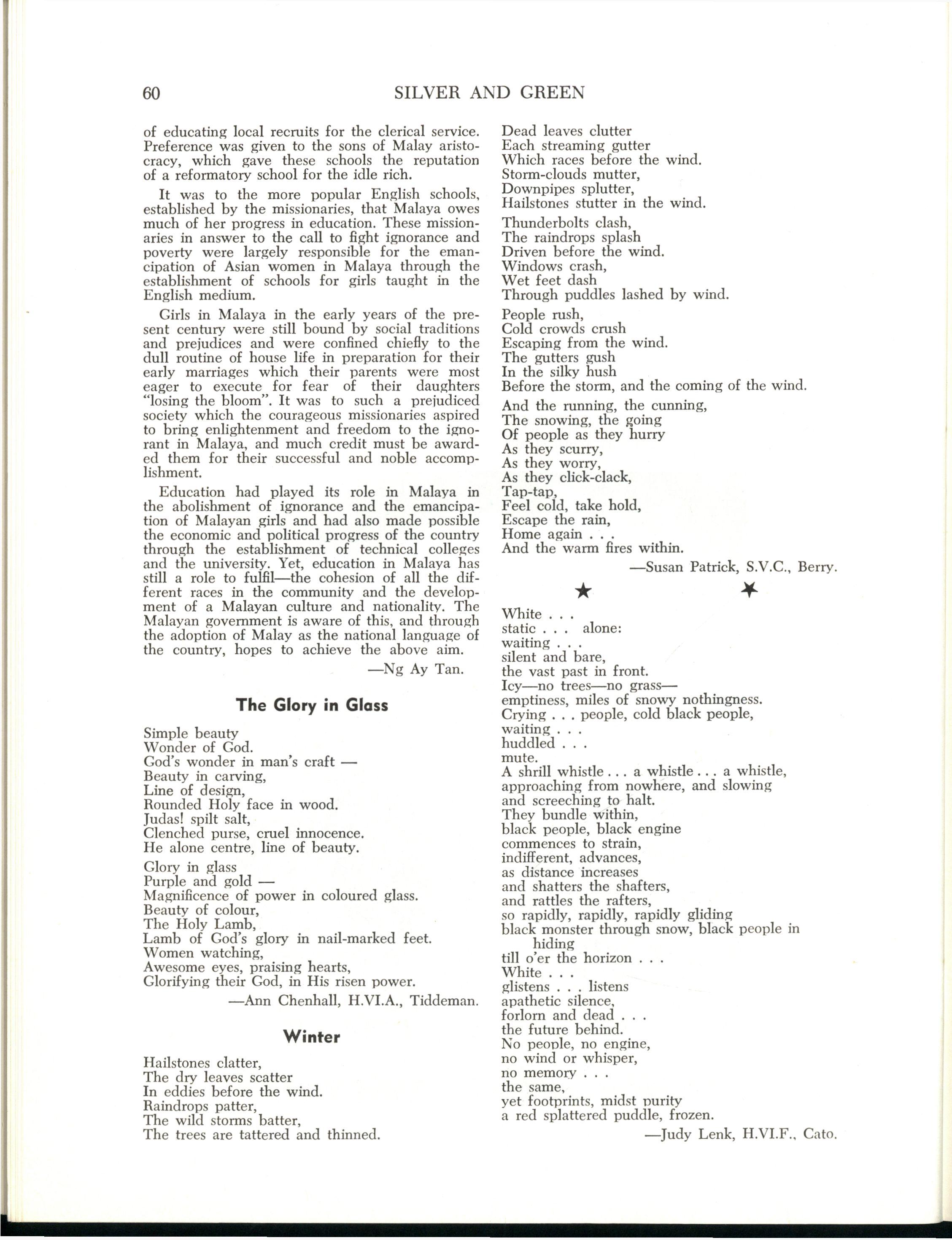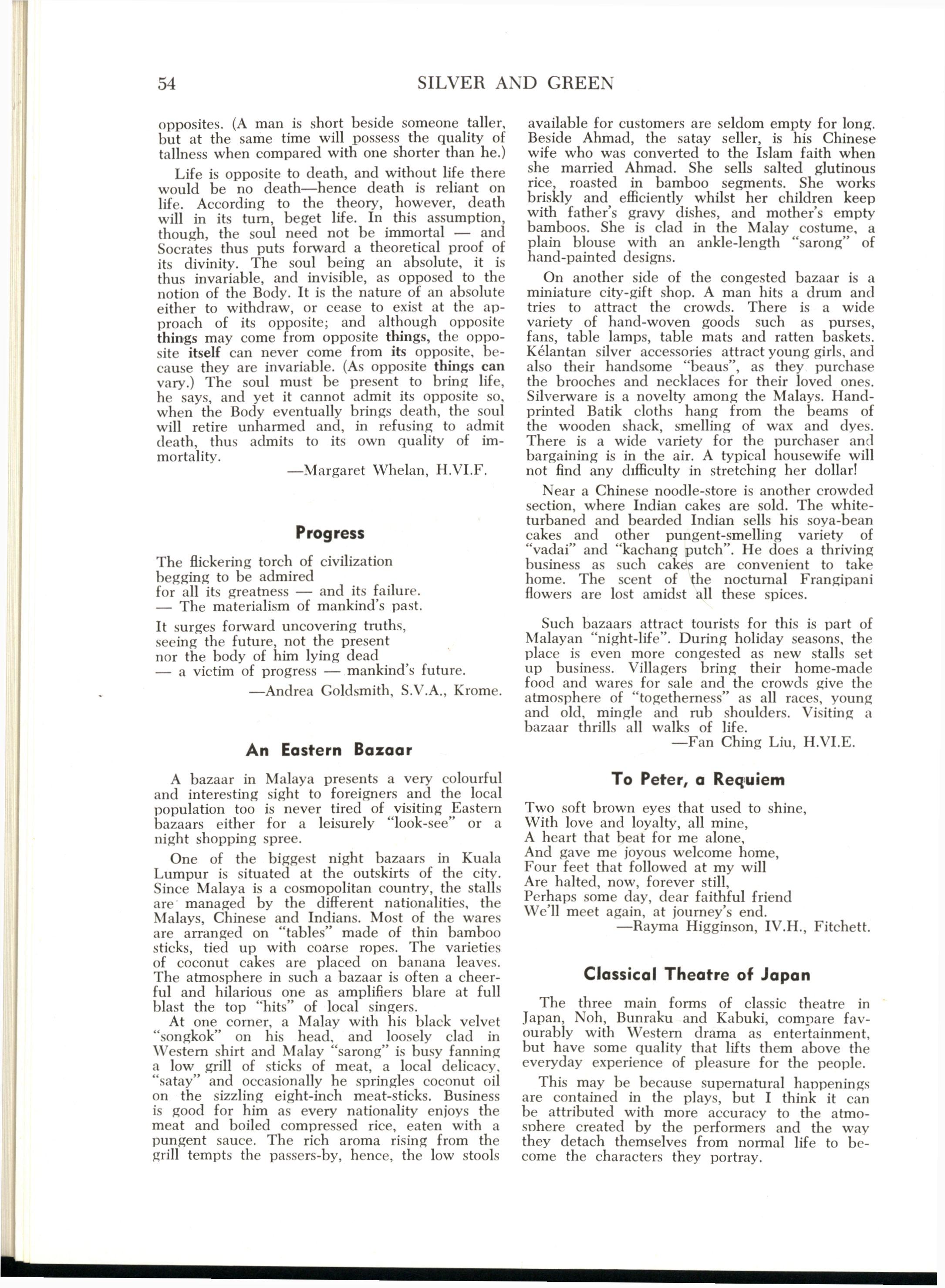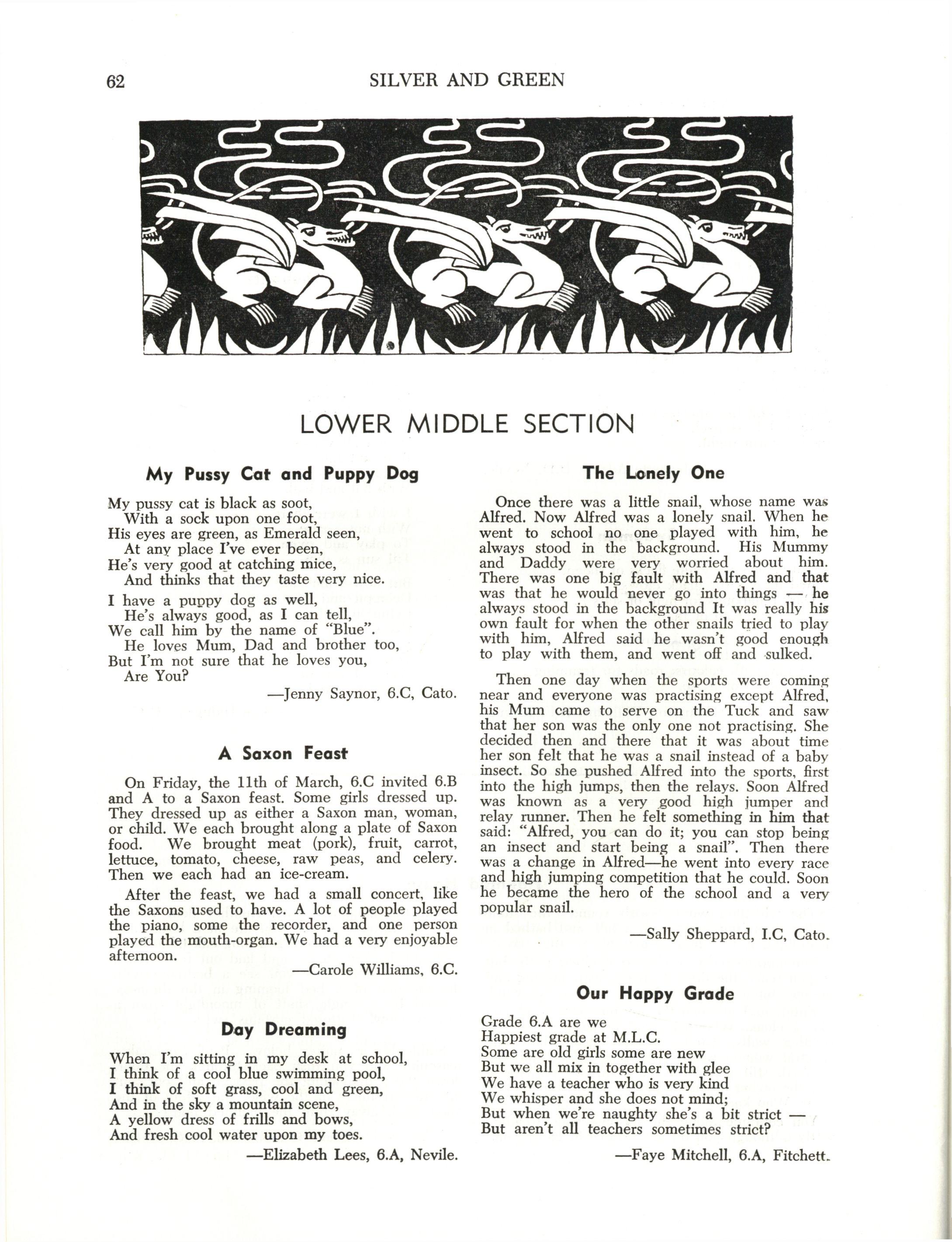 span all classes from Junior V to Matriculation, teaching such varied subjects as Scripture, Science, Geography, History and English In 1954 she was appointed Senior Mistress in the Middle School: and Senior History Mistress in 1955