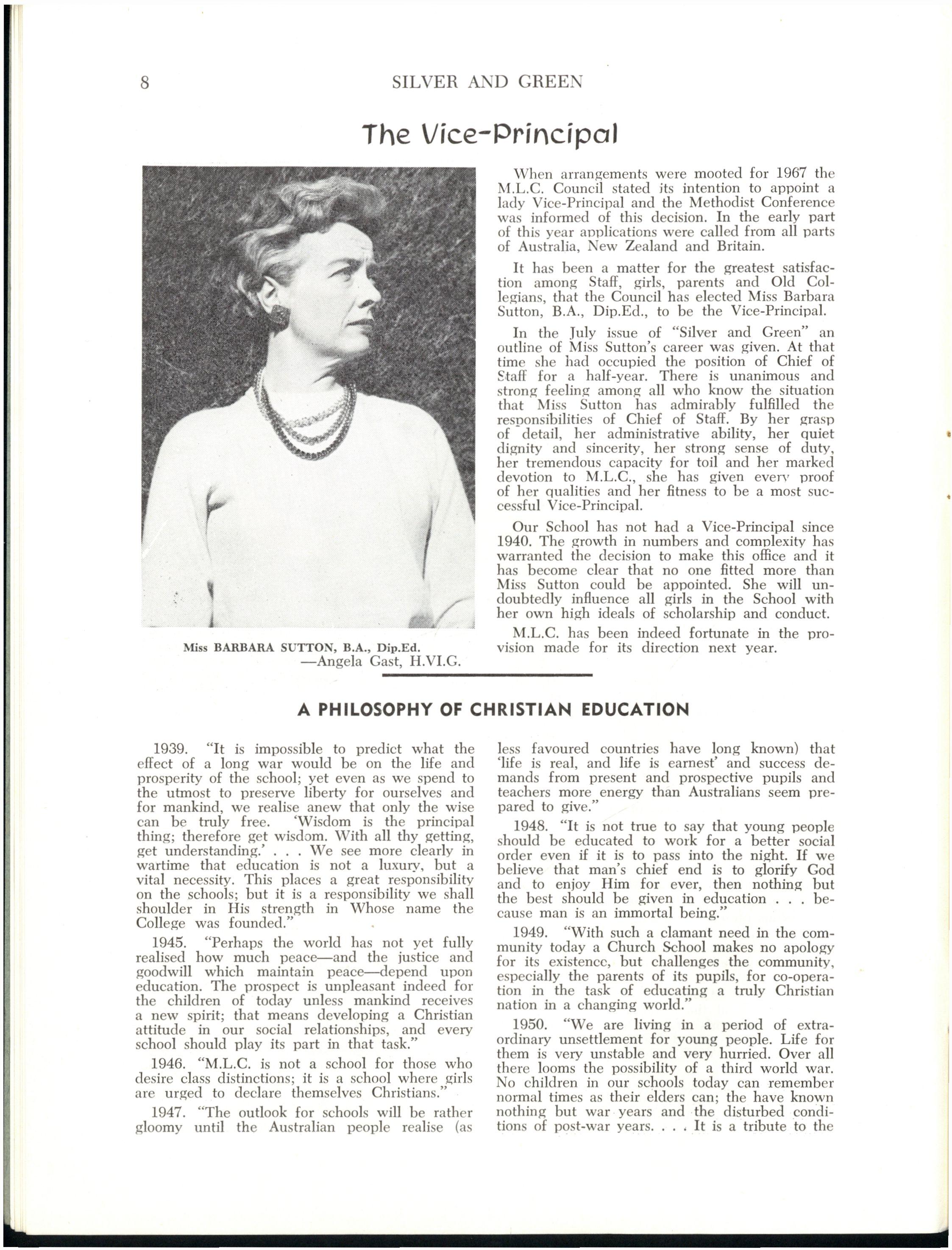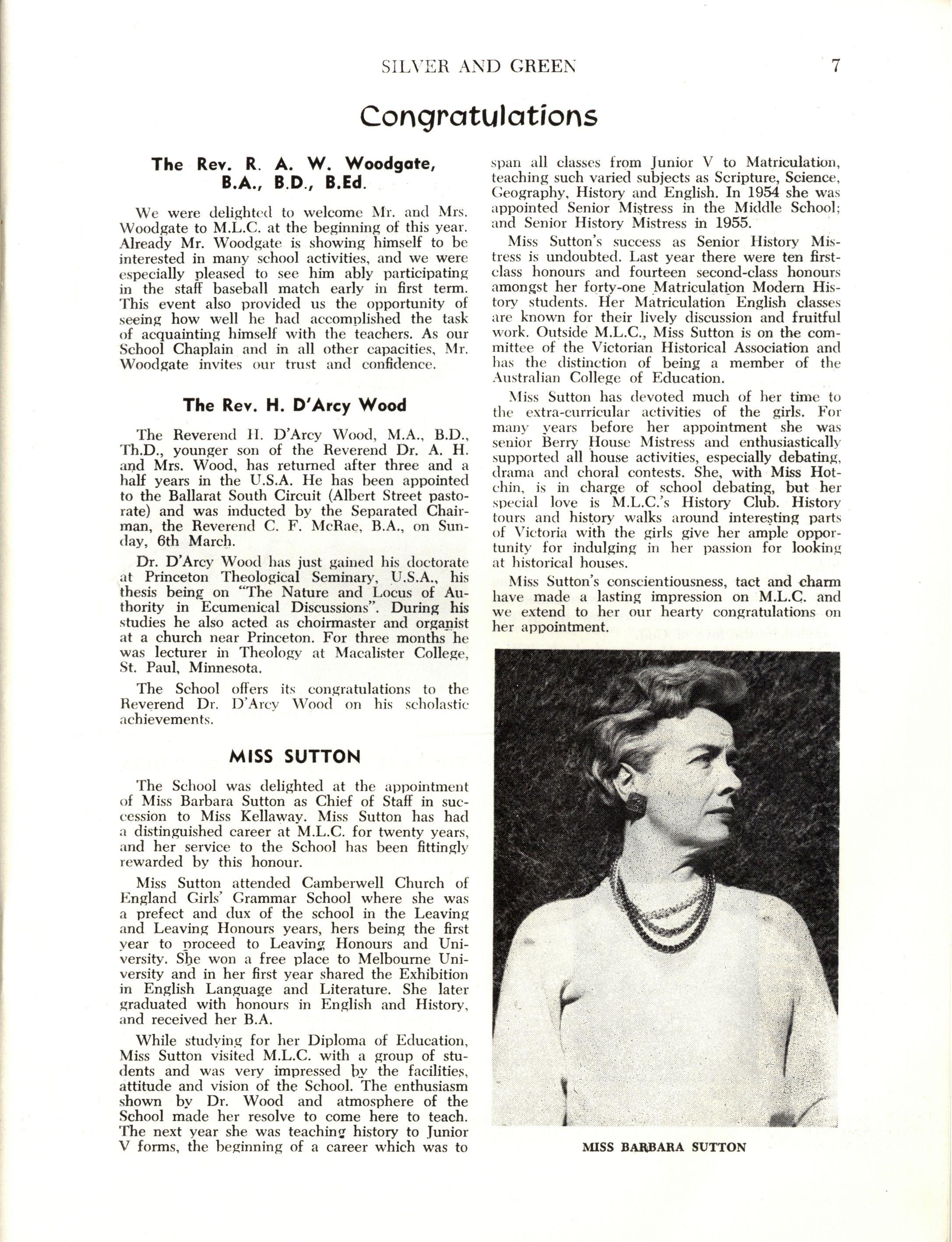 The School was delighted at the appointment of Miss Barbara Sutton as Chief of Staff in succession to Miss Kellaway Miss Sutton has had a distinguished career at M.L.C for twenty years, and her service to the School has been fittingly rewarded by this honour
