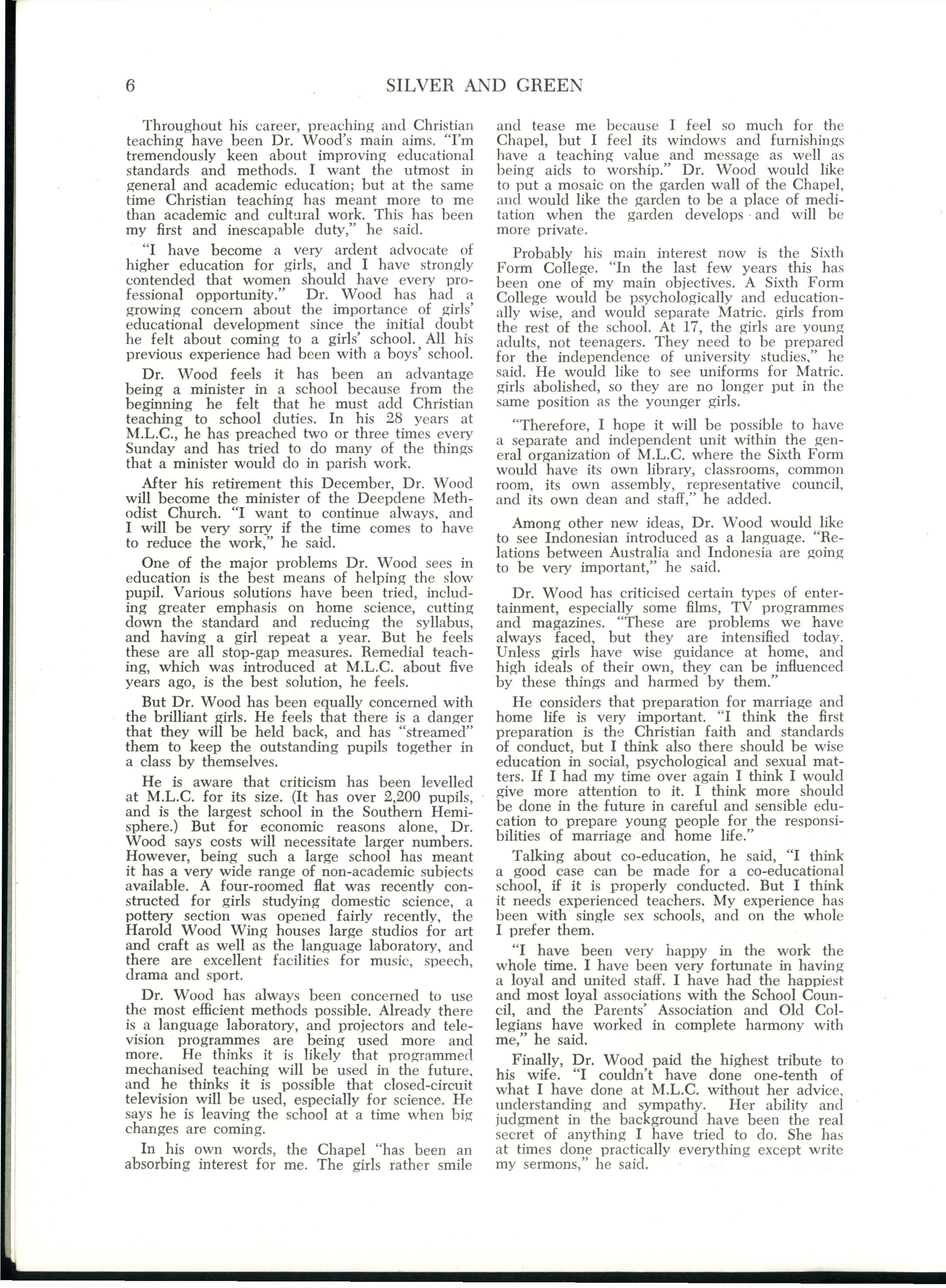 Dr Wood believes that a separate section of the school with its own facilities would be of advantage to Matriculation students, and a good bridge between school and tertiary education Advanced educational techniques such as television, with use of Closed-Circuit Television will play an important part in education of the future Language Laboratories and Reading Laboratories have already been successfully introduced