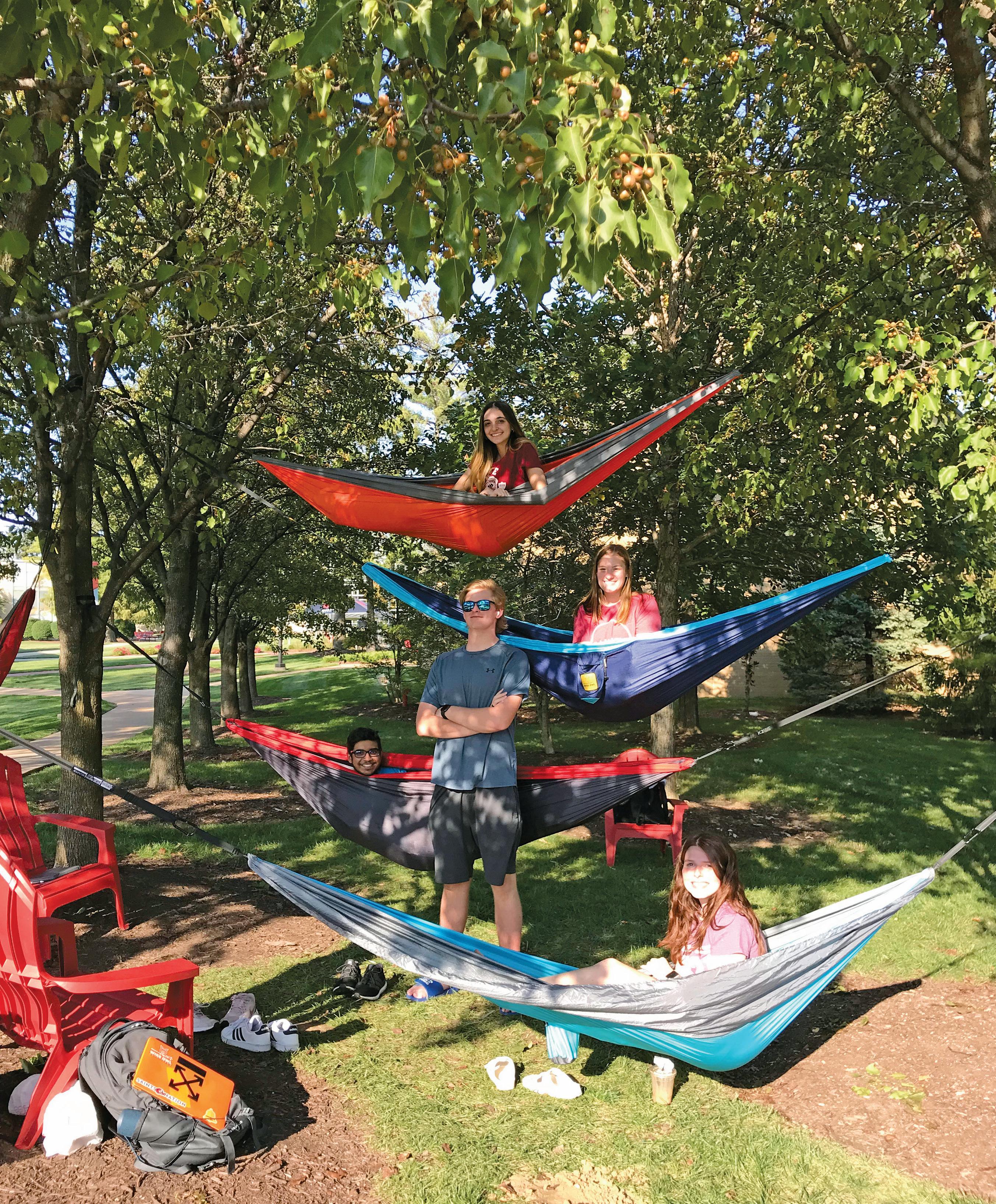 HANGING OUT: On warm-weather days, hammocks are often seen along the tree-lined path leading to the Donius University Center. Students enjoy doing homework, talking with friends and relaxing in their hammocks. This next-level hammock grove was recently spotted on campus. Measuring four hammocks high, this balancing act is proof that Saints know how to hammock! Follow the new Maryville University Hammock Society on Instagram @muhammocksociety.