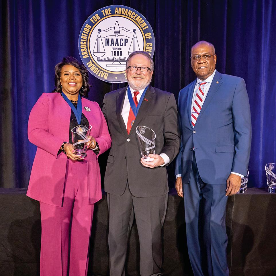 The St. Louis City NAACP presented the Frankie Muse Freeman/Norman R. Seay Commitment to St. Louis Award to President Mark Lombardi, PhD, and Vice President for Student Life Nina Caldwell, EdD. The award is presented annually in recognition of exemplary service, distinguished leadership and commitment to improve the cultural, social and economic growth and development of the St. Louis area.