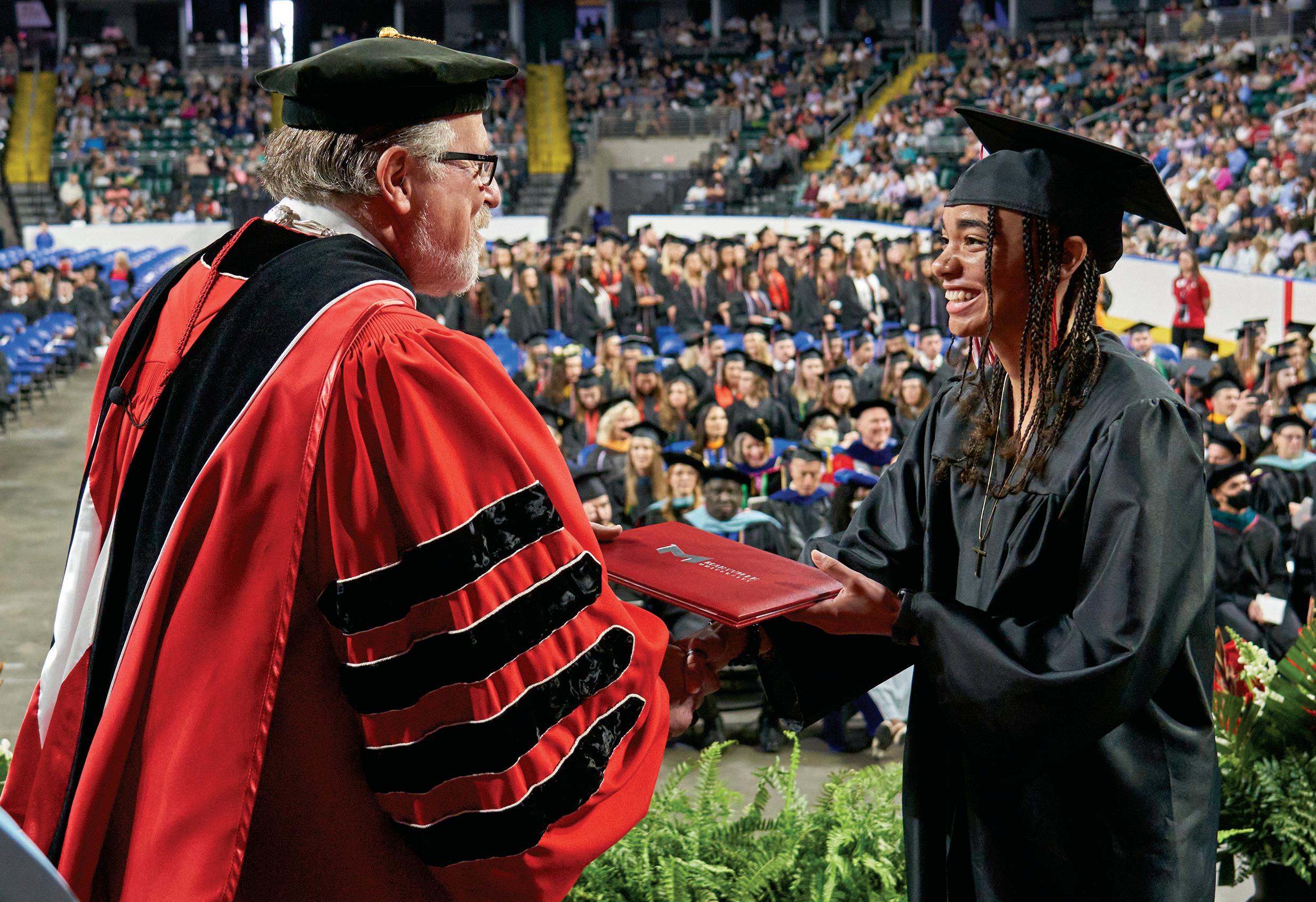 The Maryville community was overjoyed to celebrate an in-person Commencement for the first time in two years since the pandemic began. Nearly 1,000 graduates walked across the stage during two ceremonies — one undergraduate and a second graduate — at The Family Arena in St. Charles, Mo. Faculty, family and friends were also welcomed back to cheer on graduates. Among the Class of 2022 was Stancel Skelton who, at 83 years young, proved you are never too old to follow your dreams. A Maryville Online student, Skelton graduated with a Bachelor of Arts in Business Administration and traveled from San Jose, Calif., to attend Commencement. Additionally, Martha “Marti” Keller, who earned her Bachelor of Arts in Liberal Studies, had more than one reason to celebrate: Her boyfriend popped the question during a surprise marriage proposal following her walk across the Commencement stage.