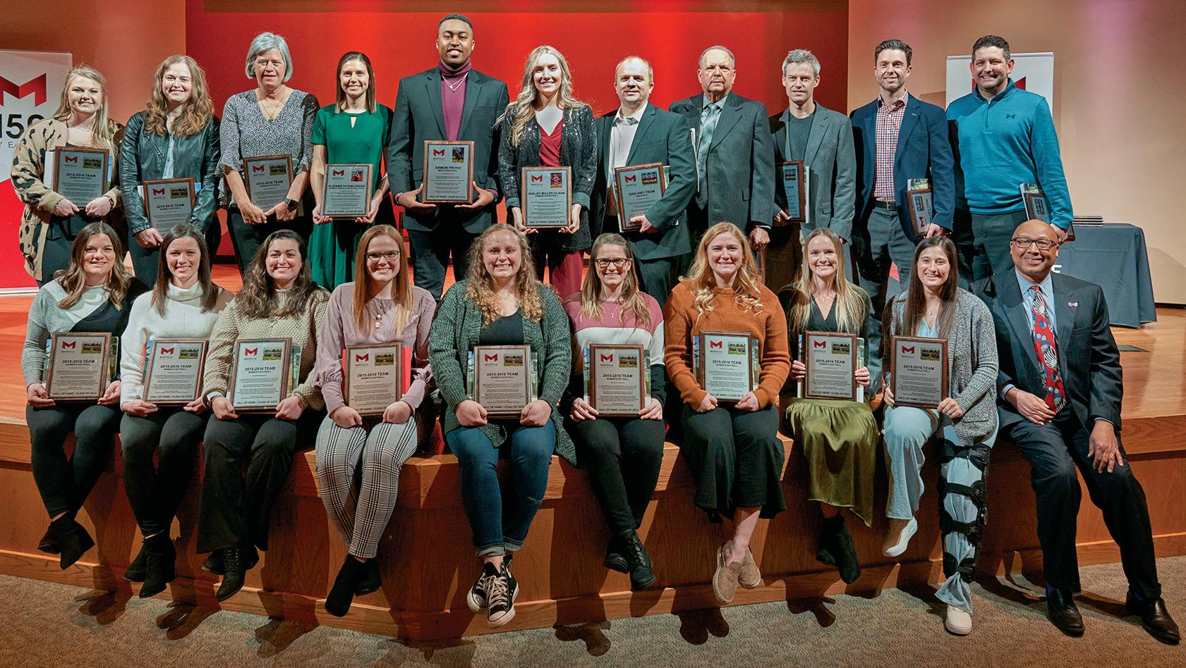 In February, Maryville celebrated athletics achievements past and present during Athletics Alumni Weekend with a series of signature events. The weekend kicked off with the Athletics Hall of Fame which honors the accomplishments of past studentathletes and athletics teams. Congratulations to the 2022 Athletics Hall of Fame Class: Shelby Miller Gliebe, ’15, Women’s Basketball; Elizabeth Kiblinger, ’15, Cross Country/Track; Armon Provo, ’15, Men’s Basketball; the 2001 Men’s Golf Team; and the 2016 Softball Team.