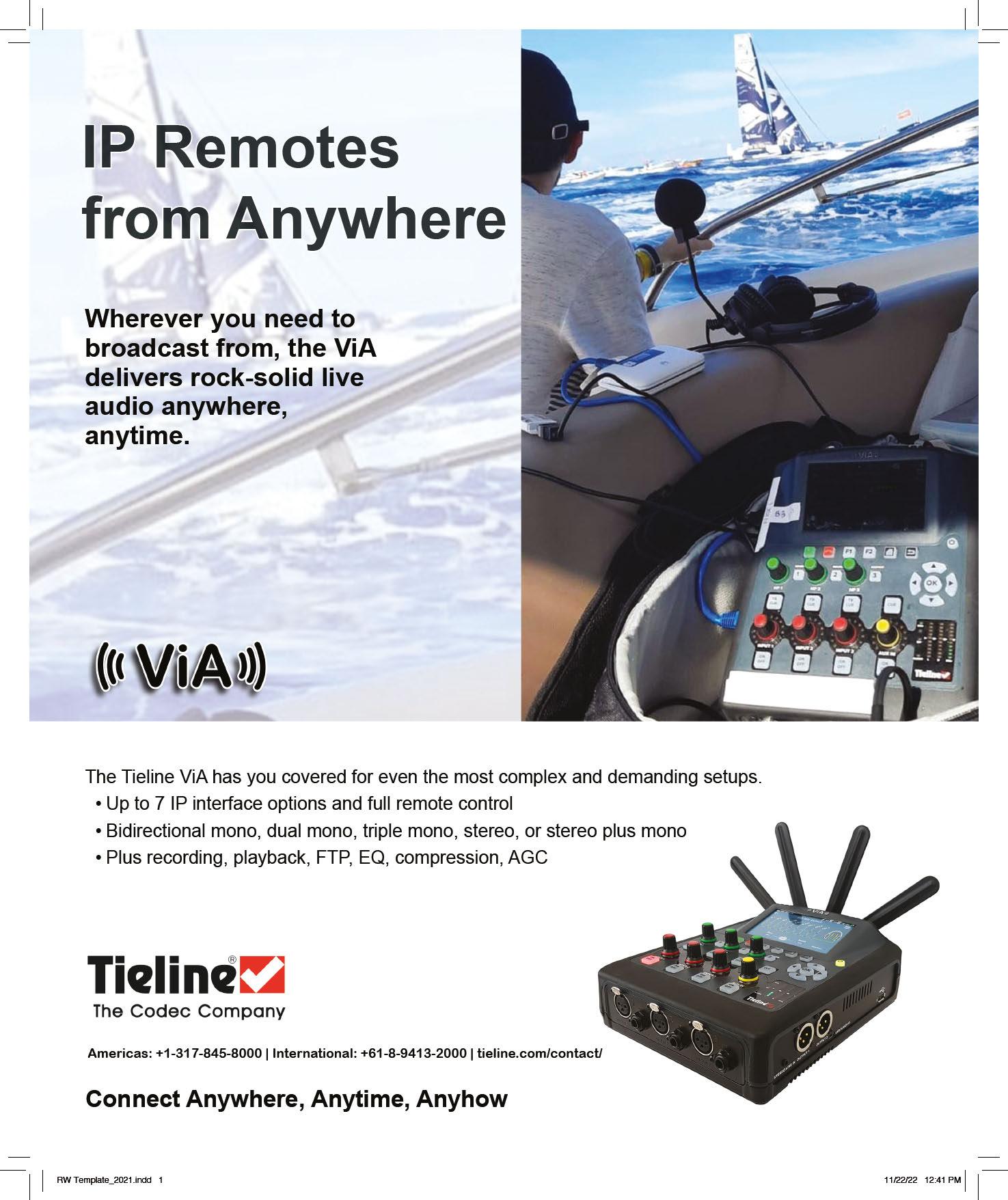 The ViA connects up with the Tieline Gateway at the studio. “Installation of the Gateway has allowed us to consolidate our studio setup and replace two codecs with one. Plus we can do two simultaneous remotes if we want and still have additional capacity for Report-IT or other setups we may consider.”