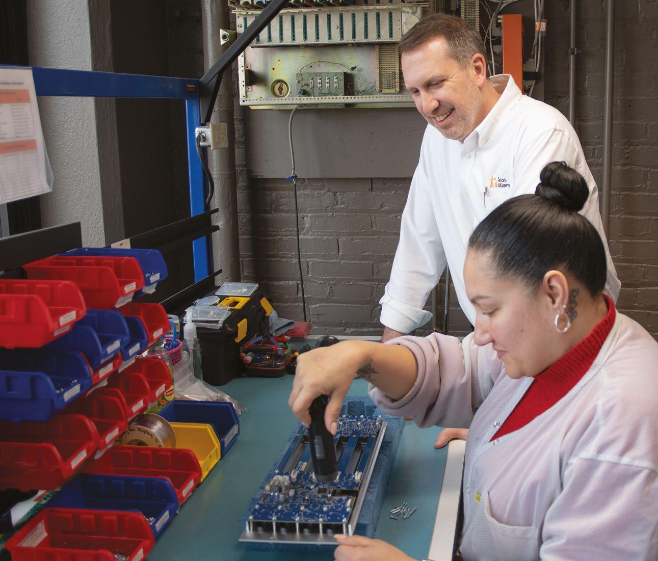 Above Stiefel checks in with Livette Perez, senior electronic assembly technician, who is building a Quasar mixing console module.
