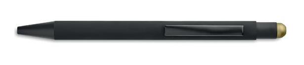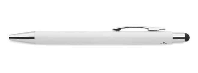 Push button stylus pen in aluminium. When the logo is engraved on to the barrel, the colour revealed matches the colour of the touch tip. Blue ink.