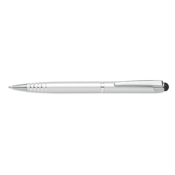 Twist action ball pen in recycled aluminium with stylus. Blue ink.