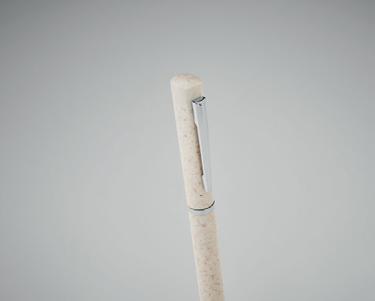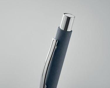 Push button ball pen in recycled paper and metal clip and plastic fittings. Blue ink.