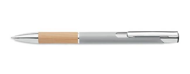 Push button pen in aluminium with bamboo grip. Blue ink.