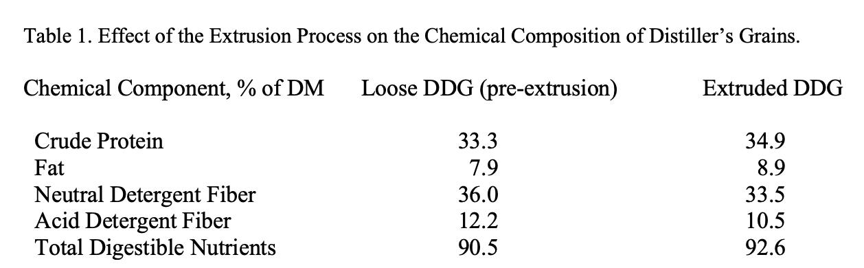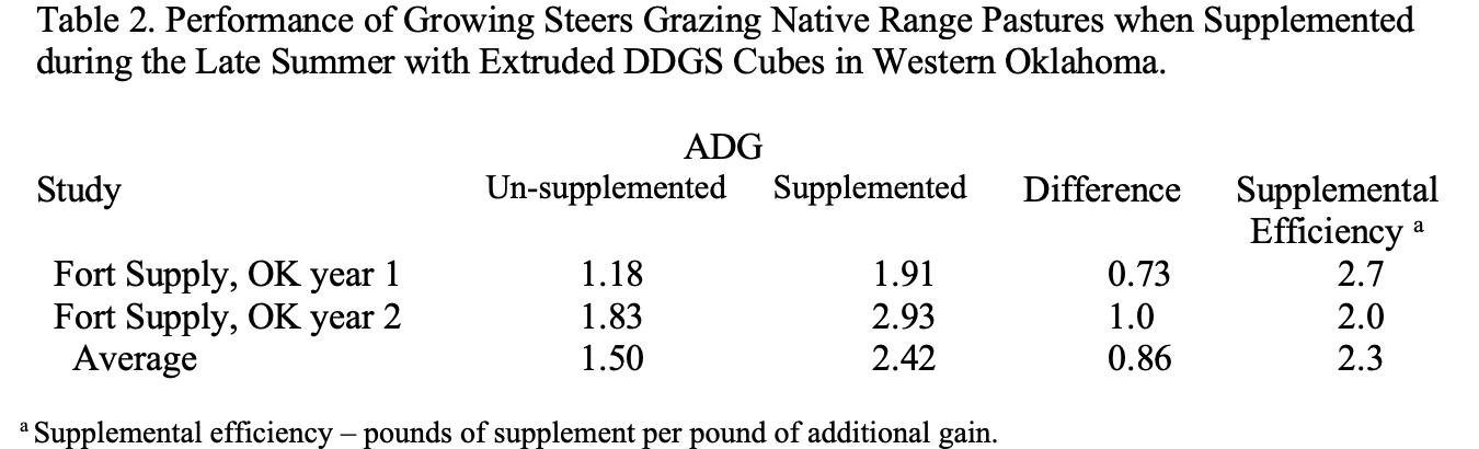 La investigación realizada en la Estación de Investigación Southern Plains Range del Departamento de Agricultura de los Estados Unidos (USDA, por sus siglas en inglés) cerca de Fort Supply en pastizales nativos investigó el uso de estos cubos en un programa de suplementación para novillos en crecimiento (Grigsby and others, J. Anim. Sci. 100 (Suppl. 3): 174-175 (Abstr.) https://doi.org/10.1093/ jas/skac247.322). Los novillos fueron alimentados 4.7 libras por novillo 3 días a la semana (una tasa de alimentación diaria de 2 libras) de cubos de granos secos de destilería con solubles (DDGS, por sus siglas en inglés) extruidos durante finales del verano, desde mediados de julio hasta el final del