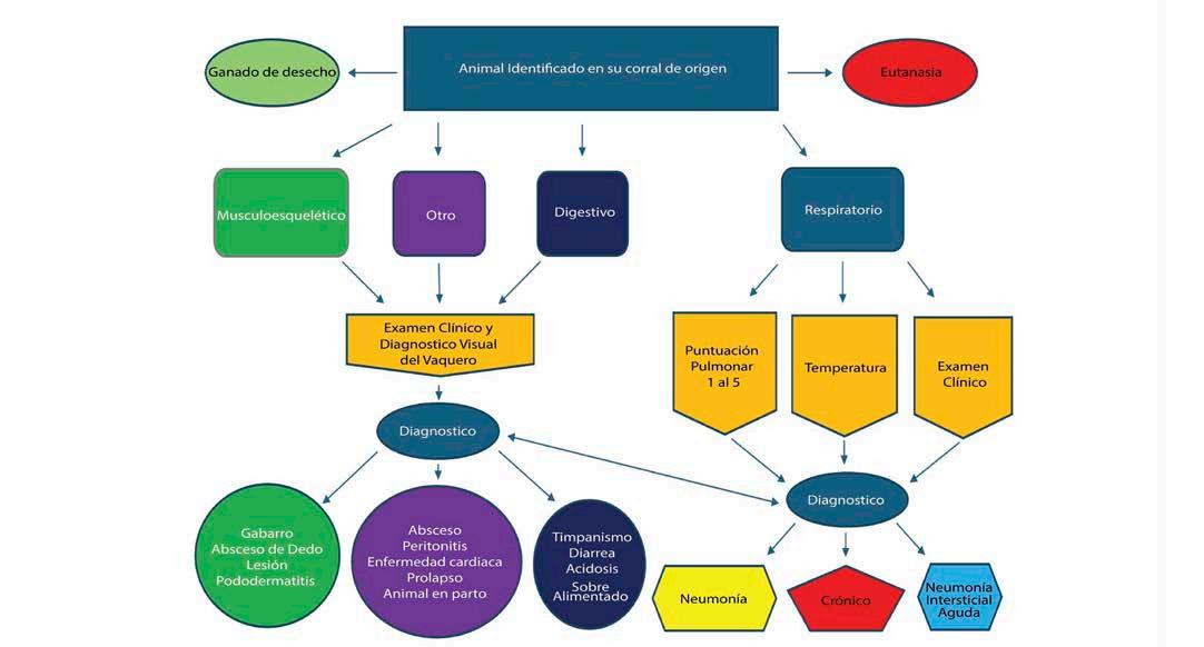 pulmonar de 3, 4, o 5 y una temperatura más alta. El manejo del ganado de bajo estrés, desde el momento en que se identifica que el ganado tiene una enfermedad hasta que regresa a su corral de origen, también es importante para obtener mejores resultados. El estrés puede afectar la función inmune, lo que reduce las tasas de éxito de los antibióticos y aumenta las tasas de retratamiento y caso de fatalidad. Puede ser frustrante sacar ganado enfermo temprano con una observación precisa del corral solo para que sucumba a una cojera o un absceso, desarrolle un seroma o fulmine hacia una septicemia severa debido a una lesión. Una forma de medir el éxito del manejo del ganado es la tasa mensual de ganado de desecho, lo cual debe ser menor del veinticinco por ciento de la tasa de mortalidad mensual promedio. Los veterinarios