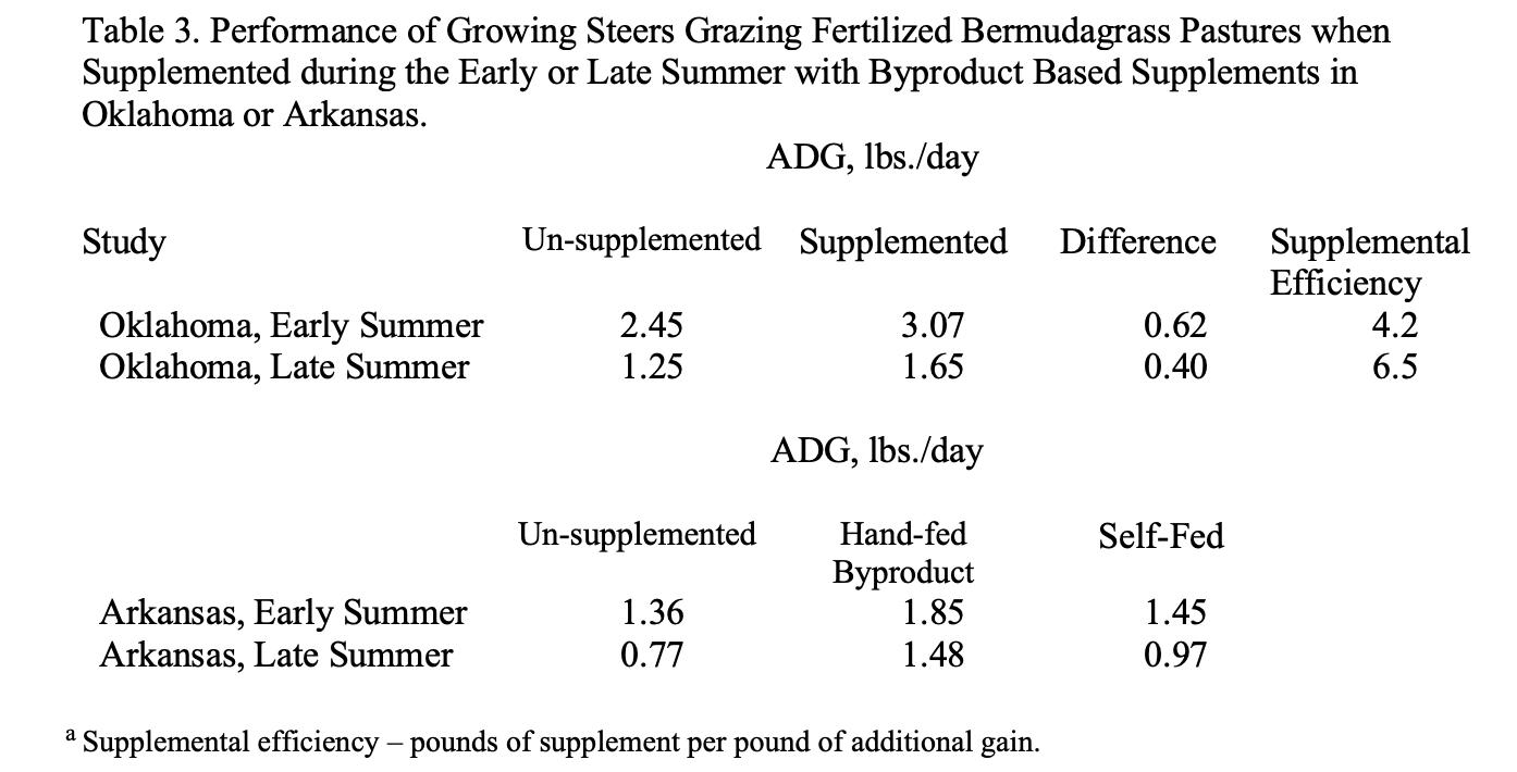 En el este de Oklahoma (Adams y otros), a los novillos se les ofrecieron 6.2 libras de cubos de granos de destilería suplementarios 3 días a la semana durante todo el verano (a una tasa de alimentación diaria de 2.6 libras) durante dos temporadas de pastoreo de verano. La calidad del forraje era excelente con valores de proteína cruda superiores al 12% cada verano, pero el aumento del contenido de fibra del pasto bermuda redujo la digestibilidad del forraje y limito el rendimiento. Proporcionar un suplemento a principios del verano aumentó las ganancias por 0.62 libras por día, lo que requiere 4.2 libras de suplemento por cada libra de ganancia adicional. A finales del verano, las ganancias solo aumentaron en un promedio de 0.4 libras por día, lo que requirió 6.5 libras de suplemento por cada libra de ganancial adicional. En Arkansas (Womack y otros) la alimentación manual diaria con alimentos basados en subproductos (mezcla de alimento de cáscara de soya y gluten de maíz en el año 1, cubos de granos de destilería en el año 2 y alimento de gluten de maíz en el año 3) se comparó con una tina autoalimentada a base de melaza comercialmente disponible. El suplemento alimentado manualmente fue alimentado manualmente a 3.5 libras de suplemento 5 días a la semana (a una tasa diaria de 2.5 libras). El suplemento autoalimentado fue diseñado para proporcionar un 28% de proteína