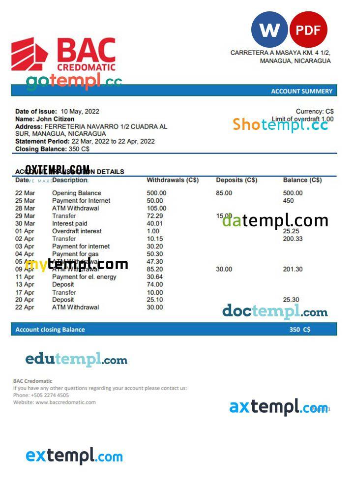 Completely editable Nicaragua BAC Credomatic bank statement template in doc format. High-quality easy fillable template.