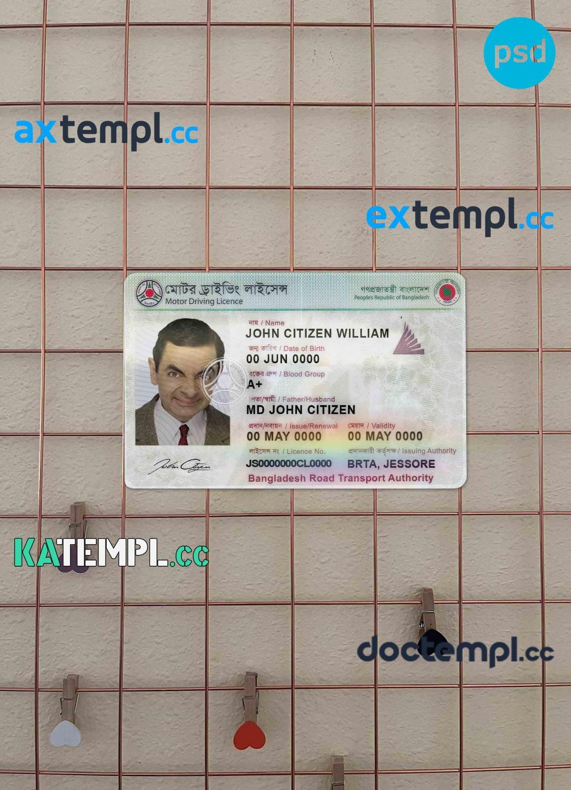 Our Bangladeshi Non-professional Motor driving license template offers two options in one package: editable PSD files for both photo and scan looks.
