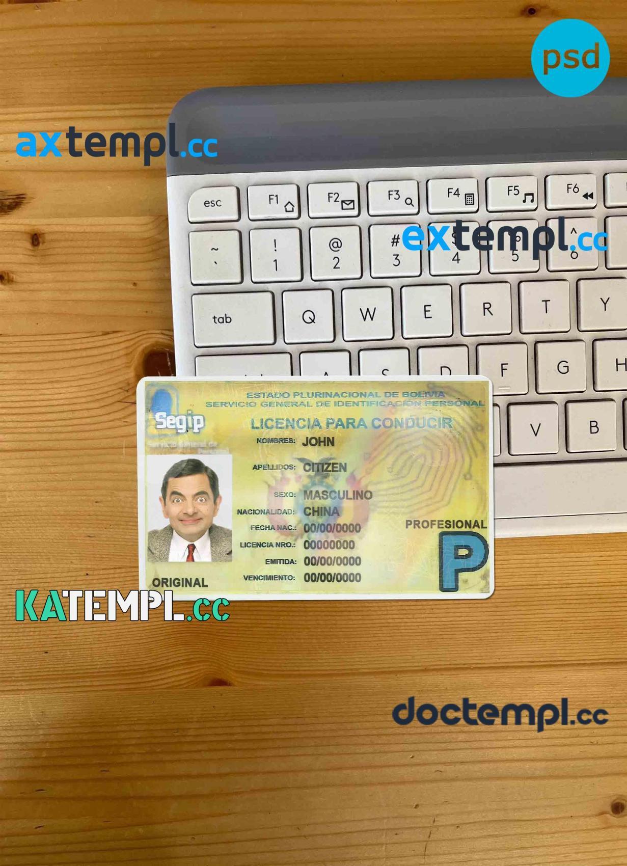 Our Bolivia driver’s license template offers two options in one package: editable PSD files for both photo and scan looks.