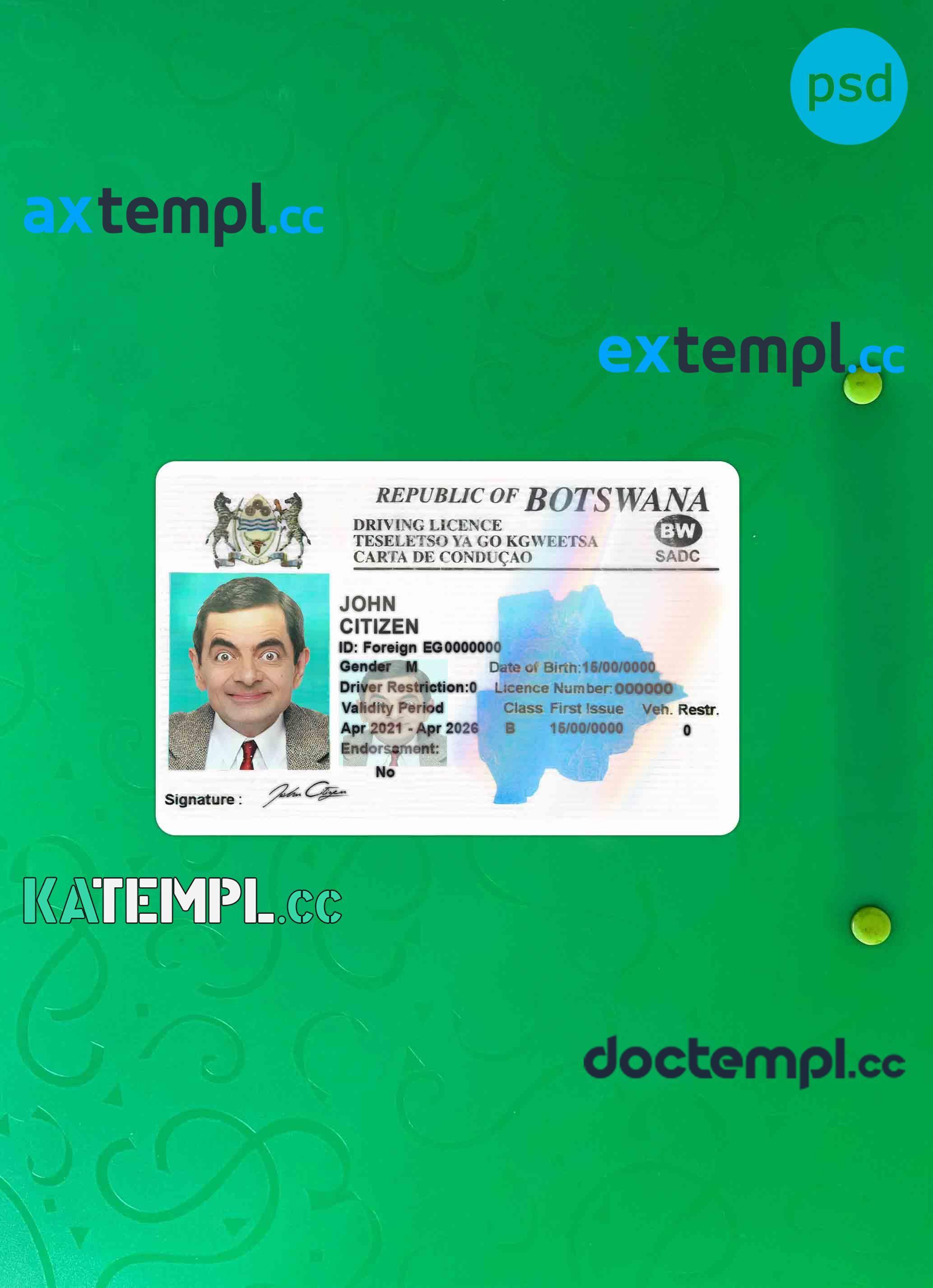 Our Botswana driver’s license template offers two options in one package: editable PSD files for both photo and scan looks.
