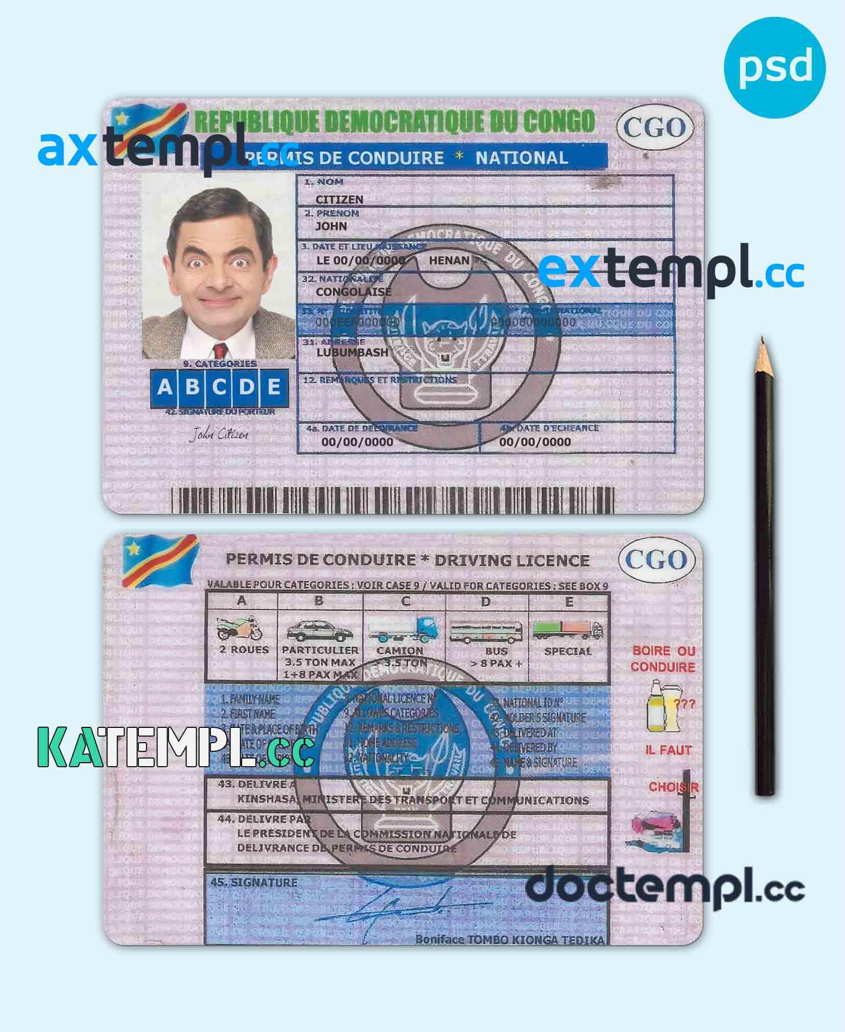 sample Congo driving license template in PSD format, fully editable download
