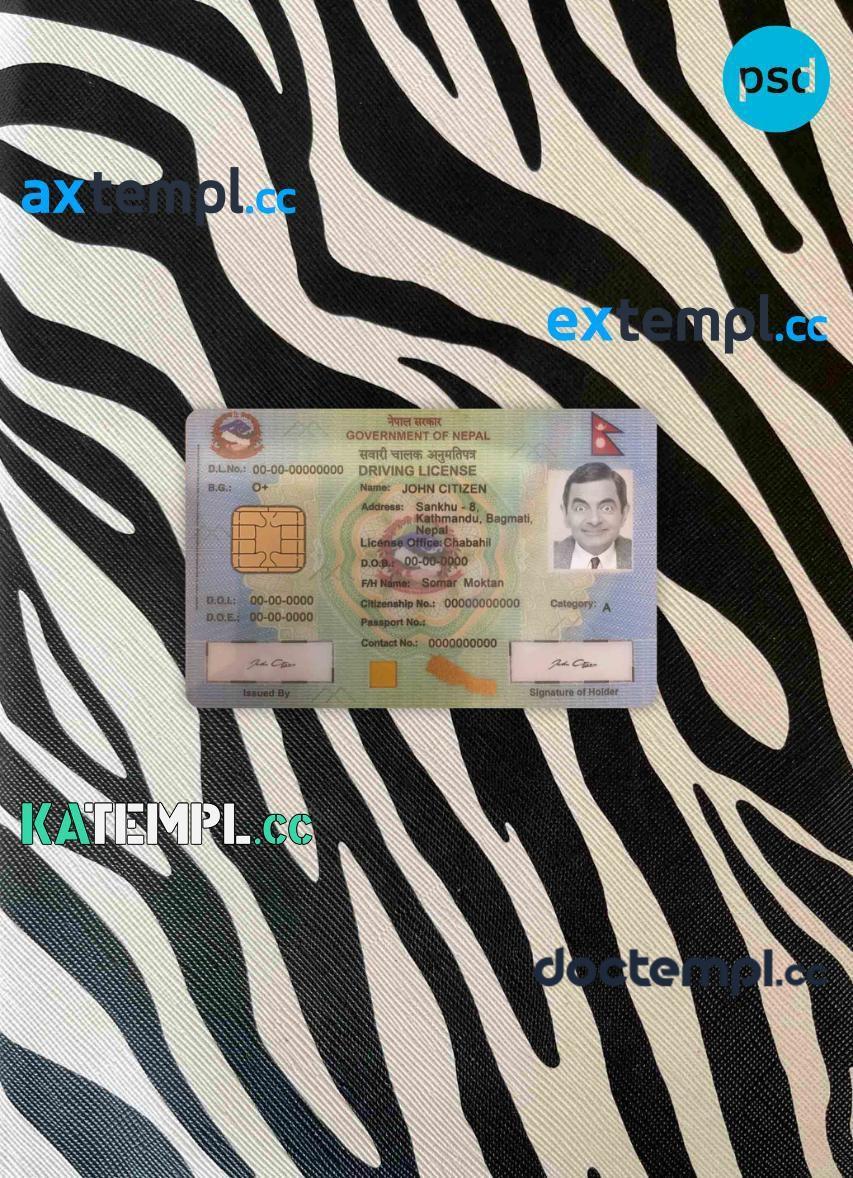 Our Nepal driver’s license template offers two options in one package: editable PSD files for both photo and scan looks.