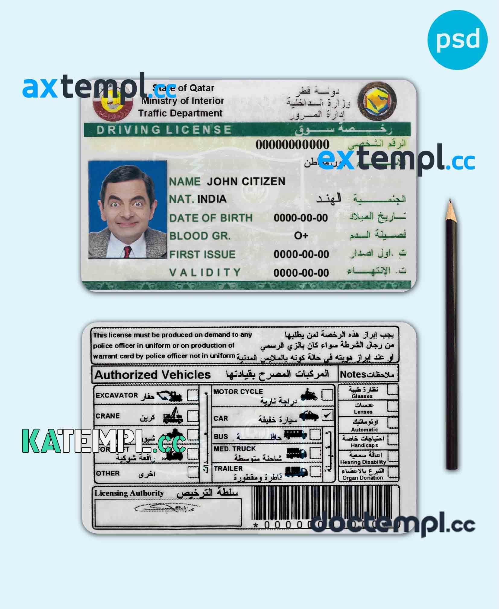 sample Qatar driving license PSD template, completely editable download