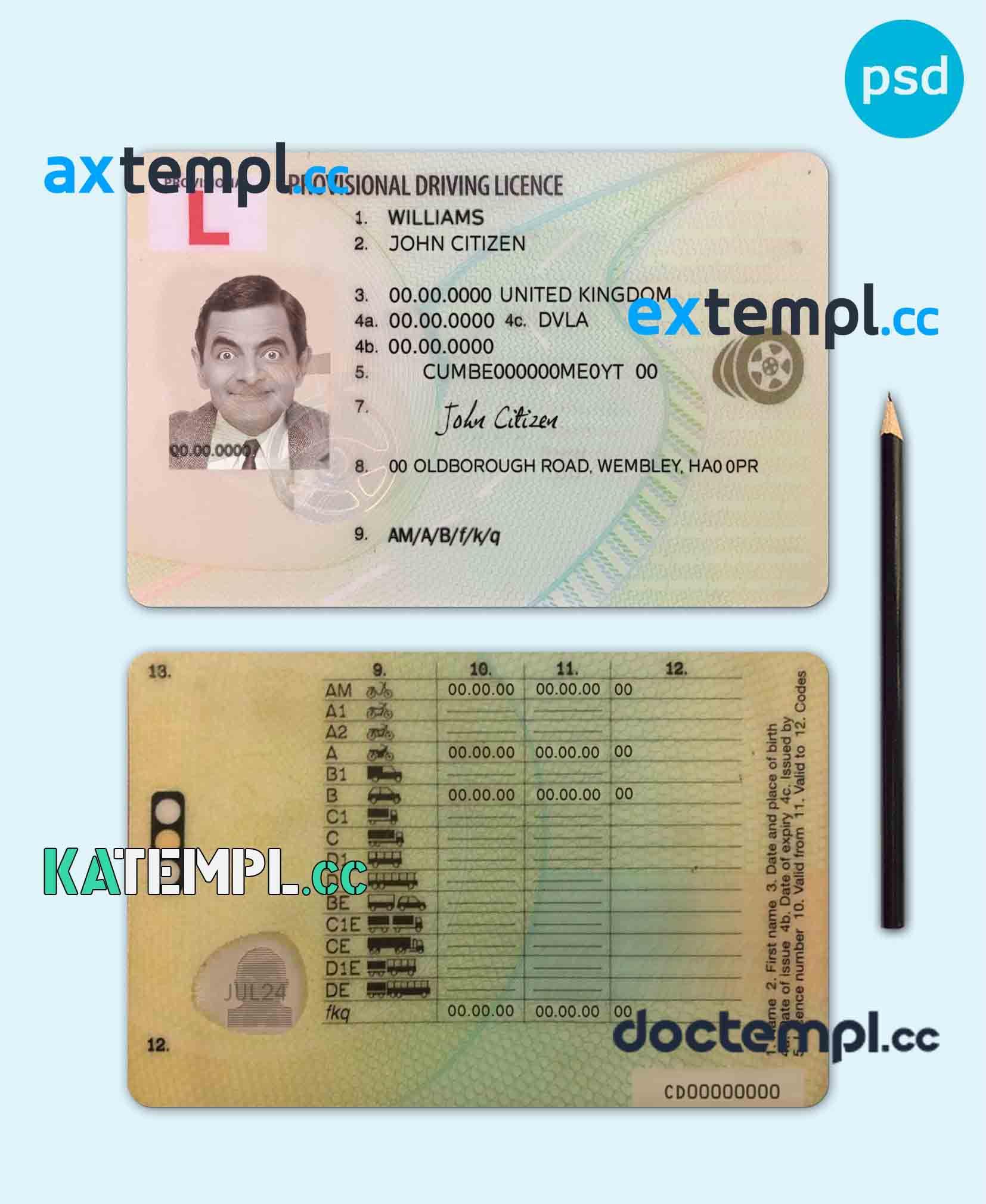 sample United Kingdom provisional driving license PSD template, fully editable download